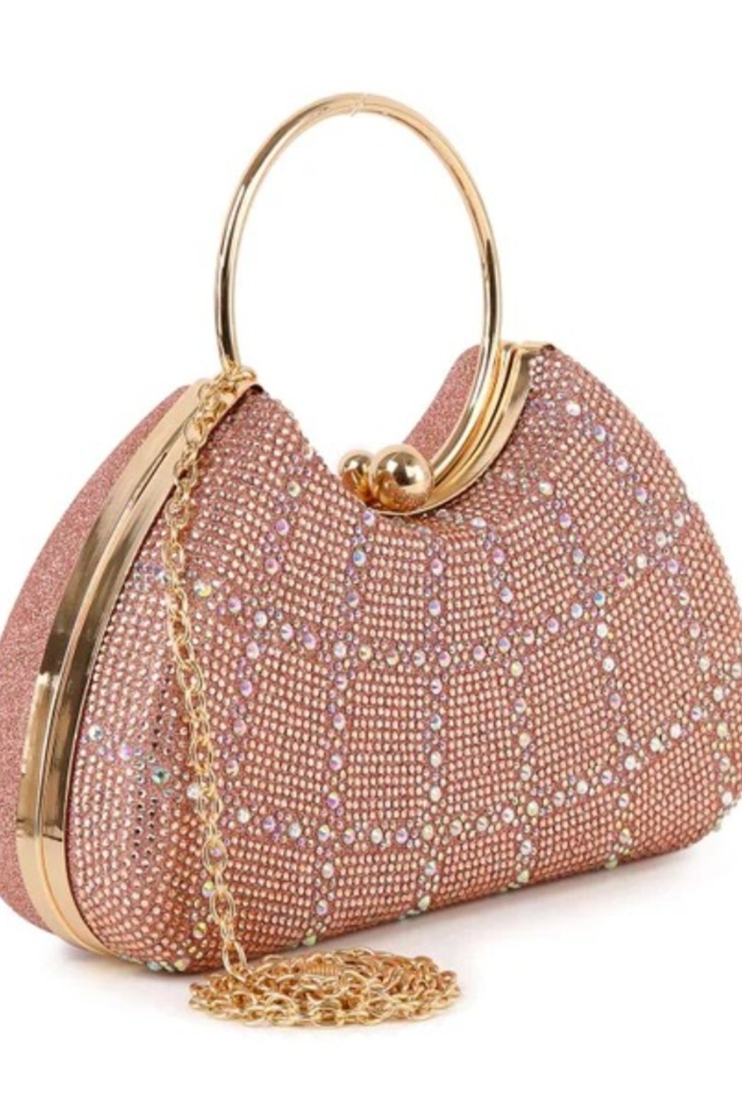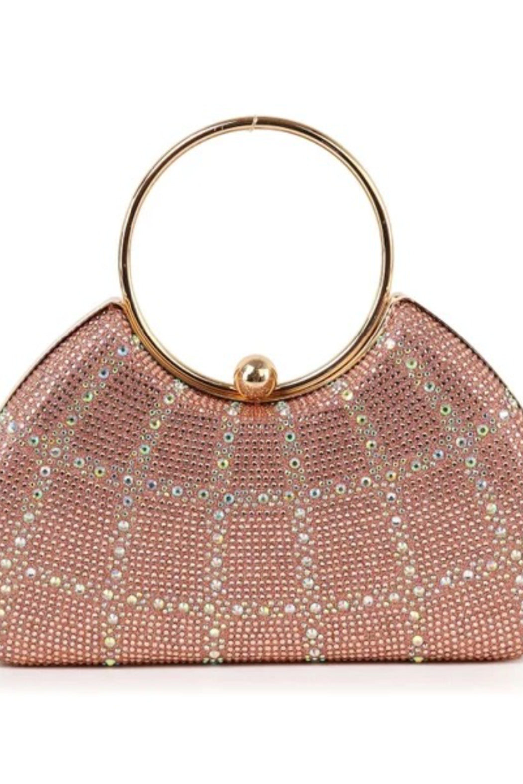 A stunning grid pattern shines in sparkling stones atop a perfectly sized evening bag.