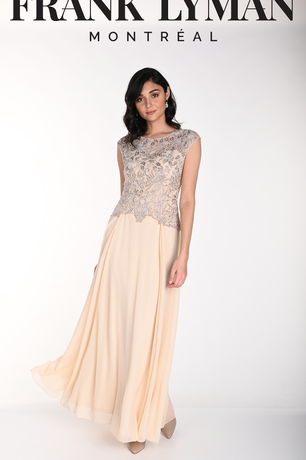 This champagne woven dress is absolutely stunning! It has a lace sequin top leading into a fuller chiffon skirt. This dress has a rounded neckline with a hidden zipper in the back makes it super glamourous! This dress does have a double liner in it so you should be comfortable all day long. This dress is approximately 63" long.