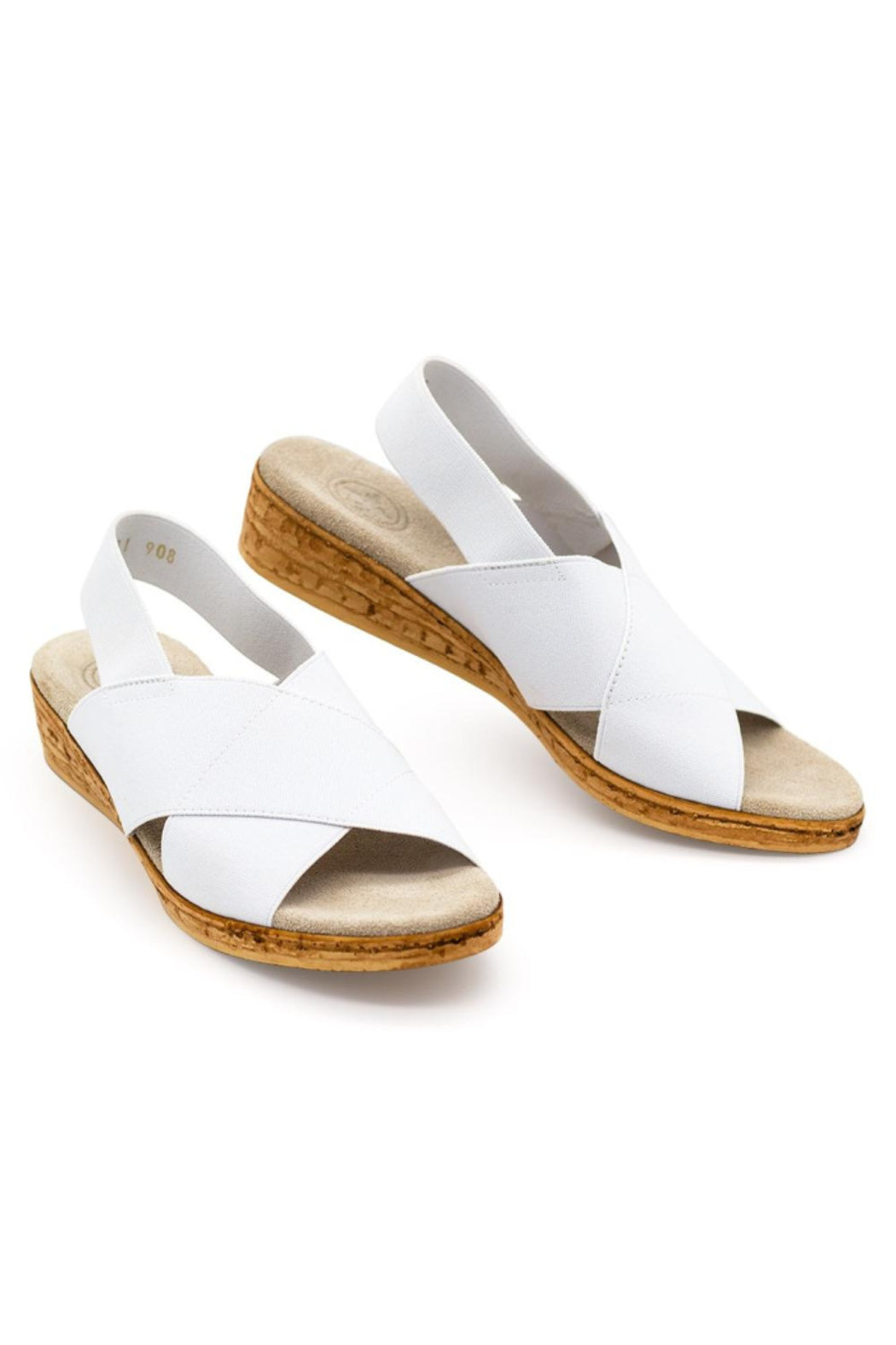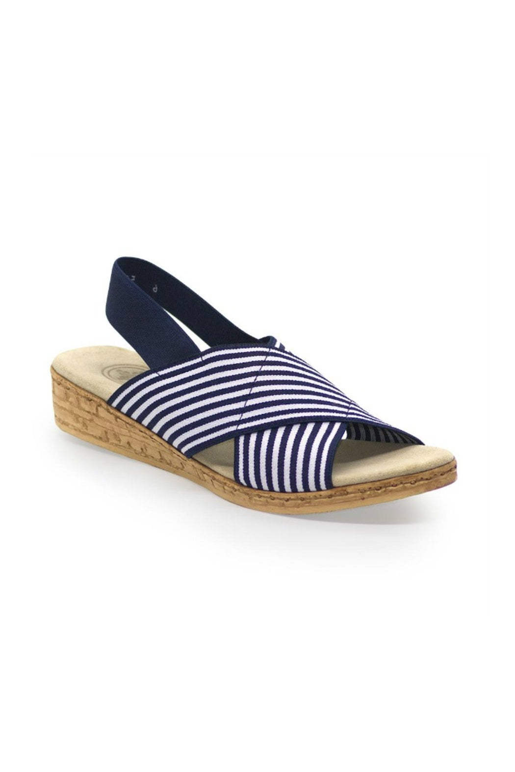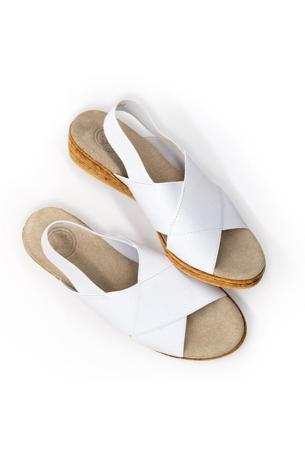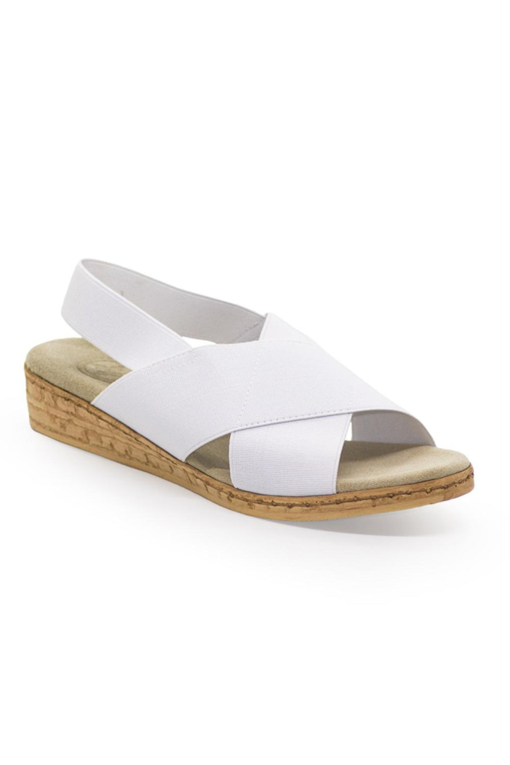 Stretch upper, crisscross straps, sling back, cork-like bottom