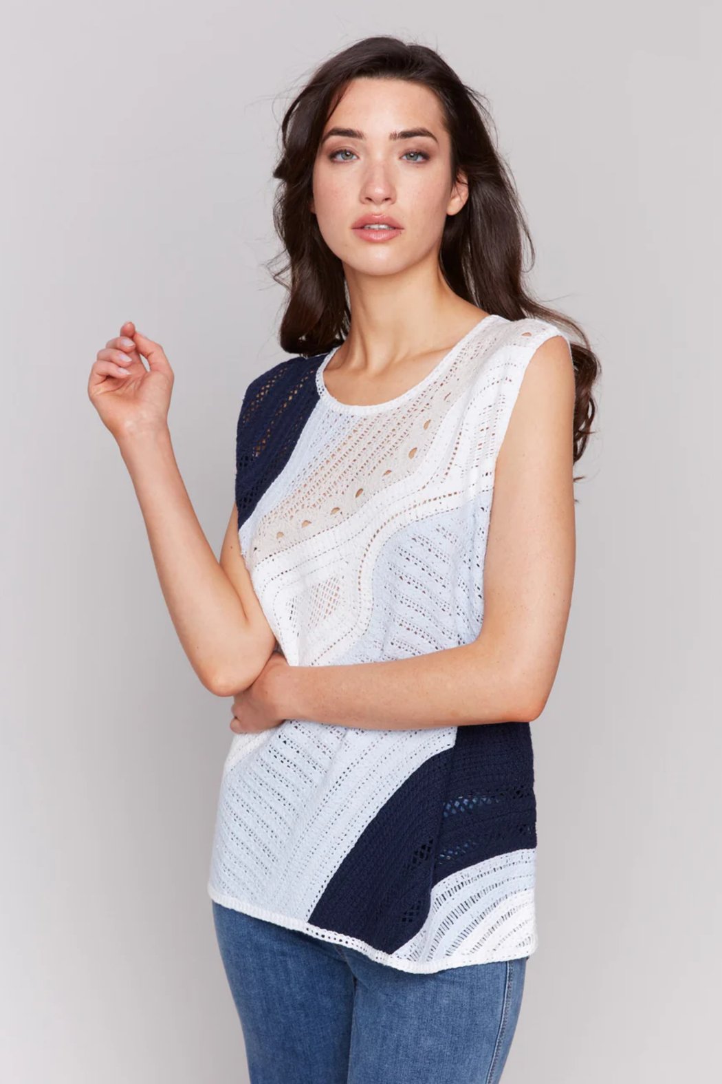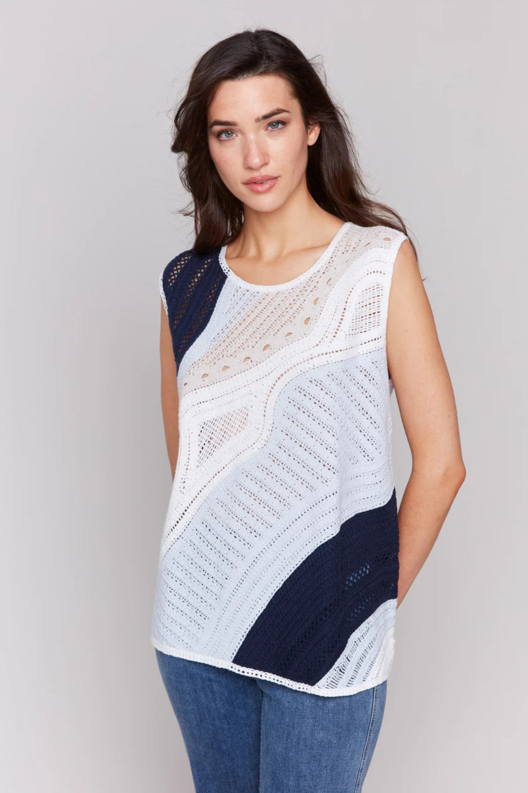 The sleeveless colorblock crochet top in denim blue hues adds a dreamy, elegant touch to any outfit. Combining timeless style with a comfortable fit, its open-knit design keeps you cool in summer breezes—making it an essential piece for your spring and summer wardrobe.