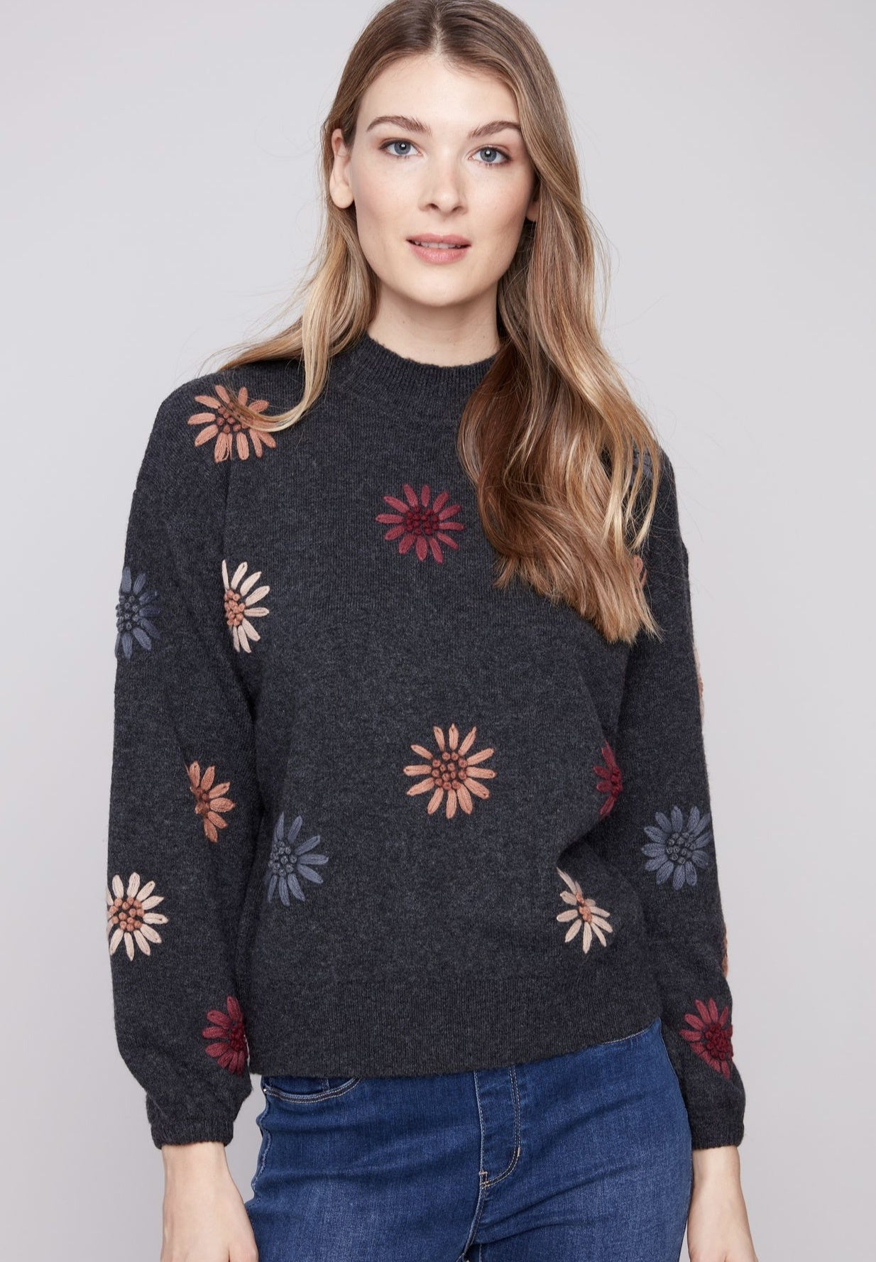 Mock Neck Drop Shoulder Sweater With Floral Embroidery