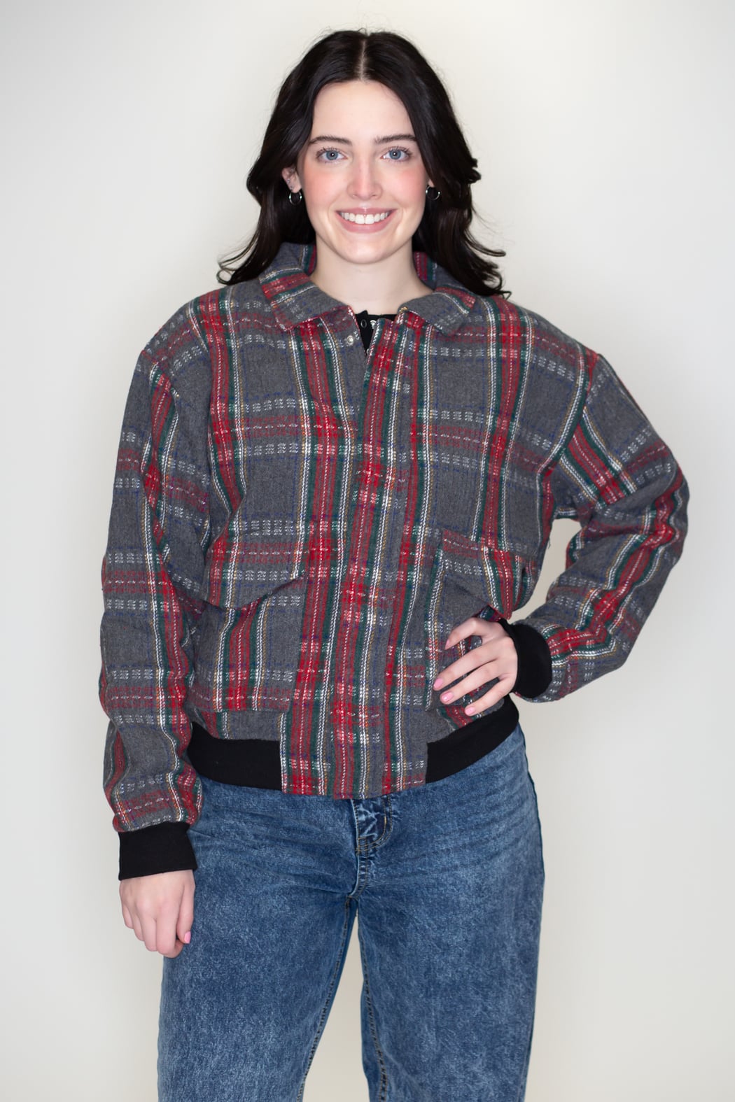 Brushed checkered bomber jacket in a relaxed fit. Features a collared neckline, dropped shoulder, fastened at the front with snap button, on-trend front oversized pocket details and cozy interior lining.