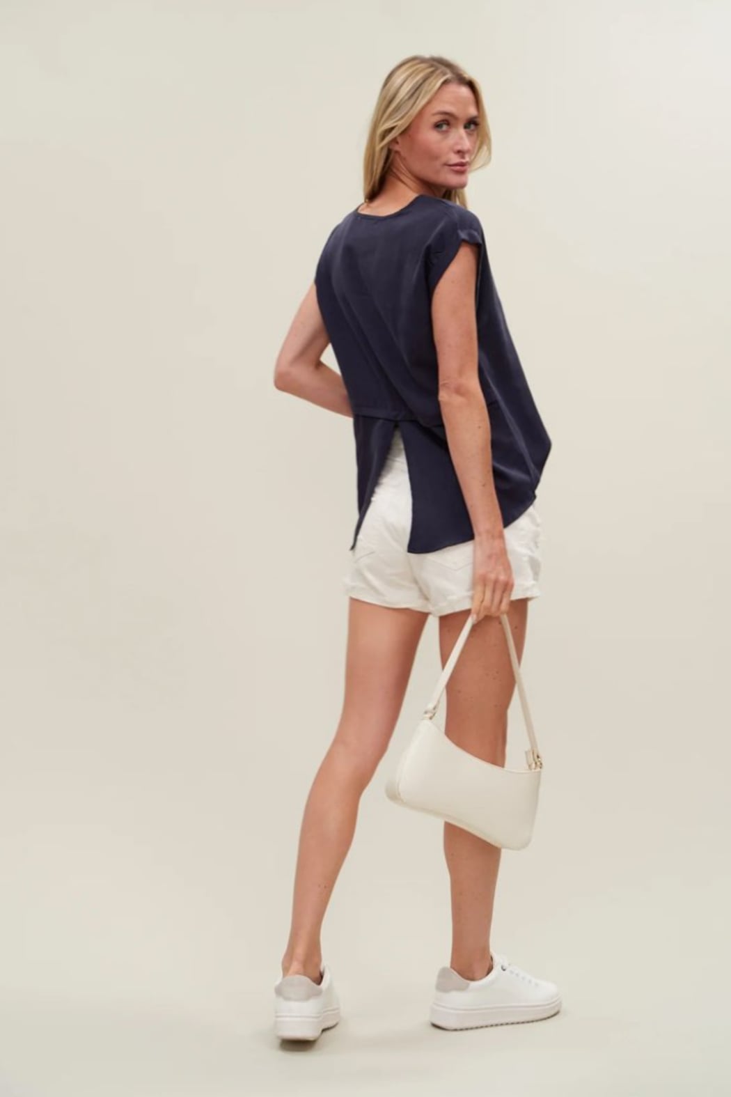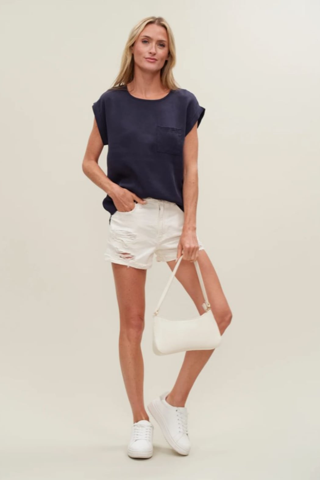 The summer breeze is just around the corner with this airy top! The Chelsea is perfect for vacation featuring a slit in the back, rolled sleeves, and a front pocket. Pair it with the Kyra and sandals for a casual chic look.