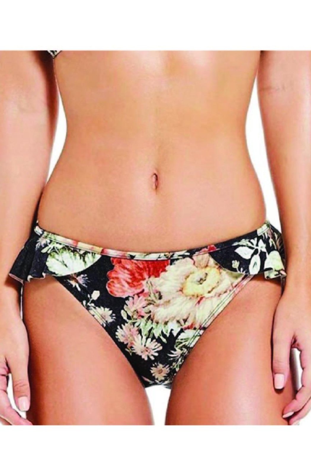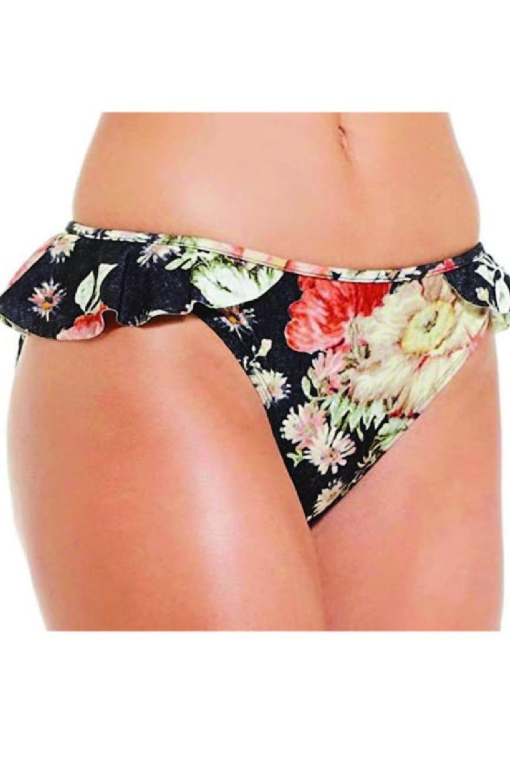 Chelsea & Violet Black Floral Bikini Bottoms with side ruffle
