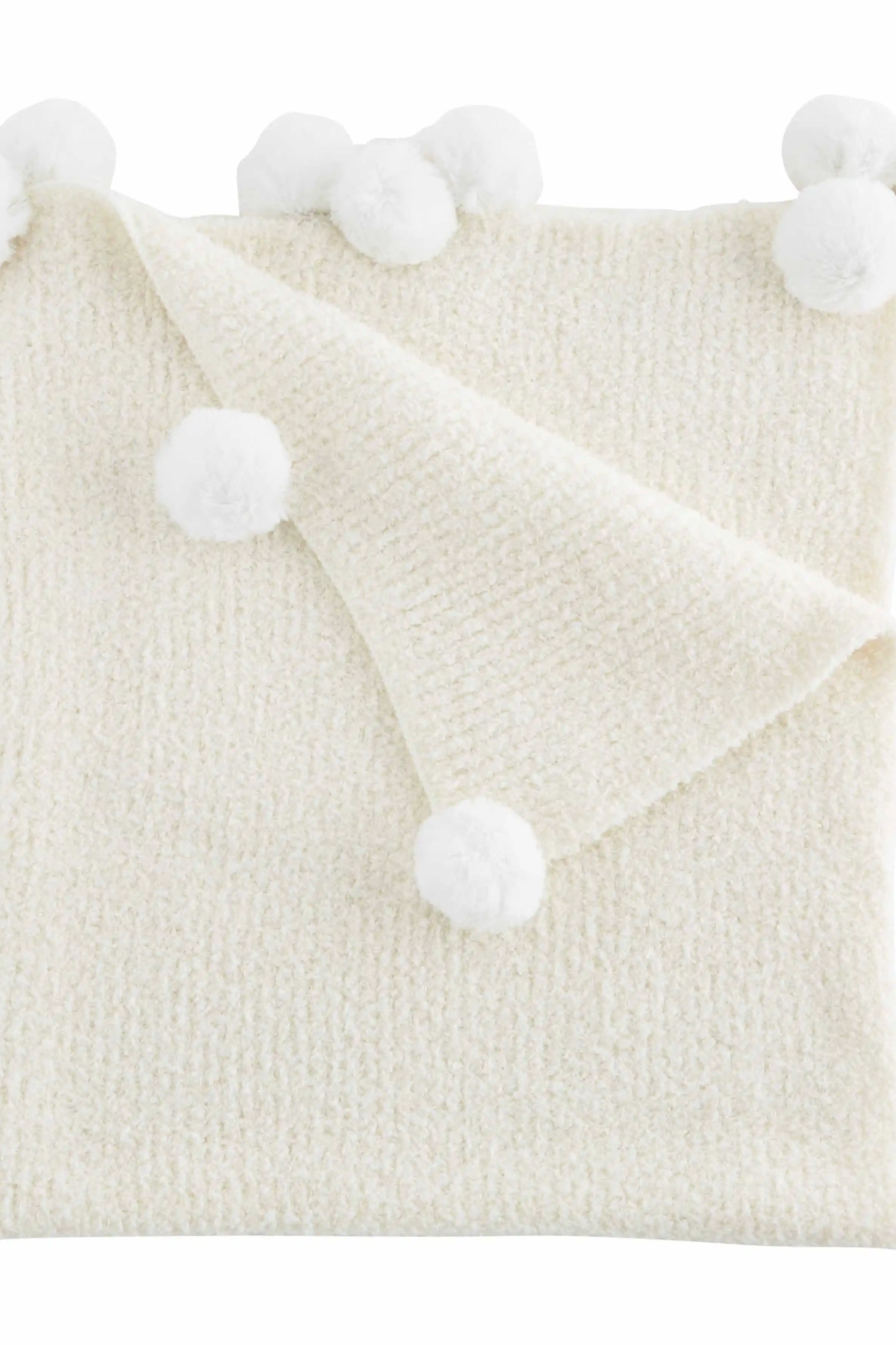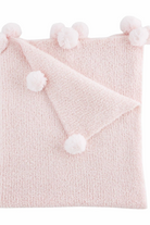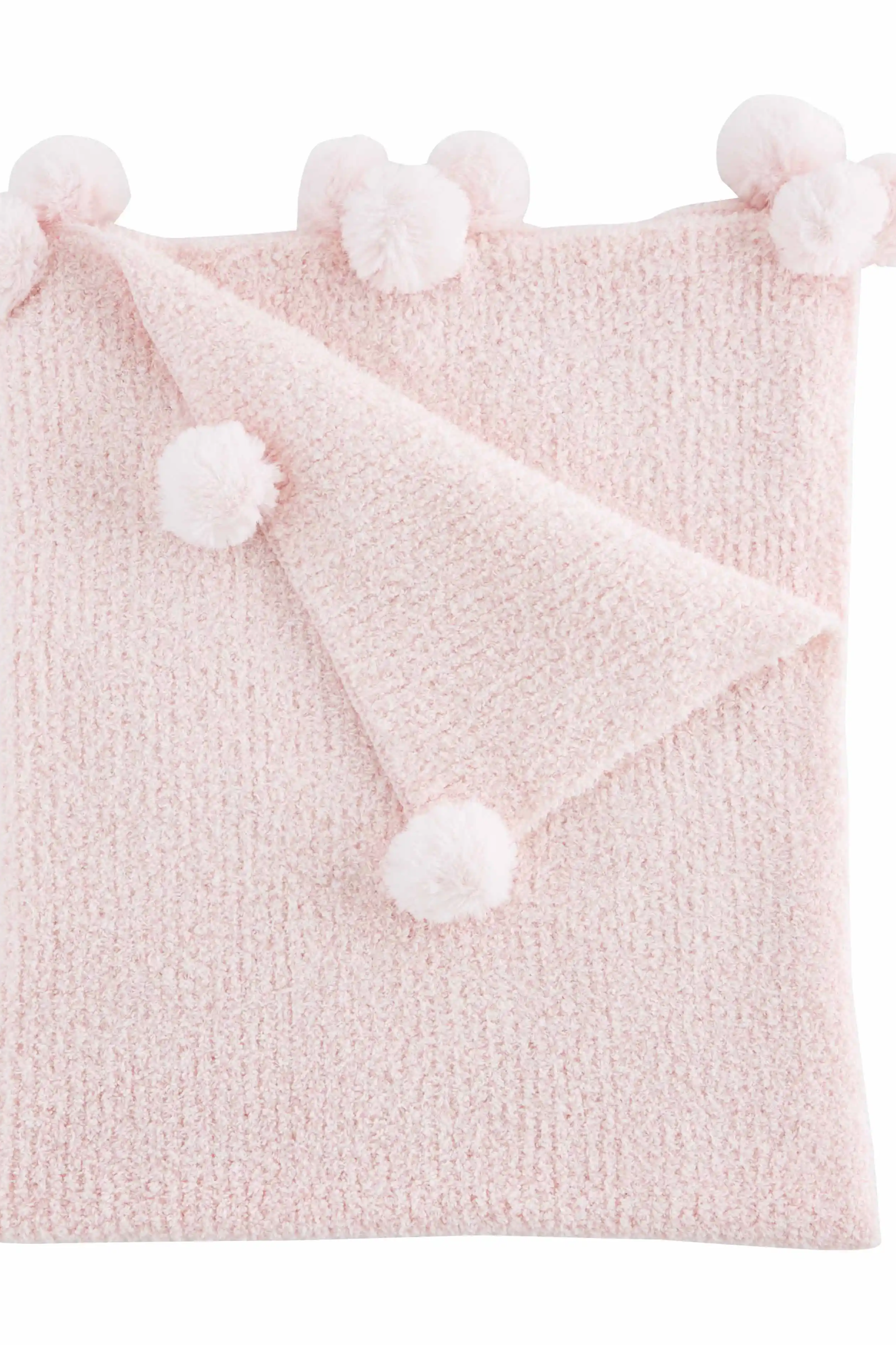 Our chenille baby blanket is a cozy gift for sleepy baby. The ribbed chenille blanket features chenille pom-pom trim. These adorable blankets are available in pink and white and are a nursery neccessity. The blanket measures 28" x 34".