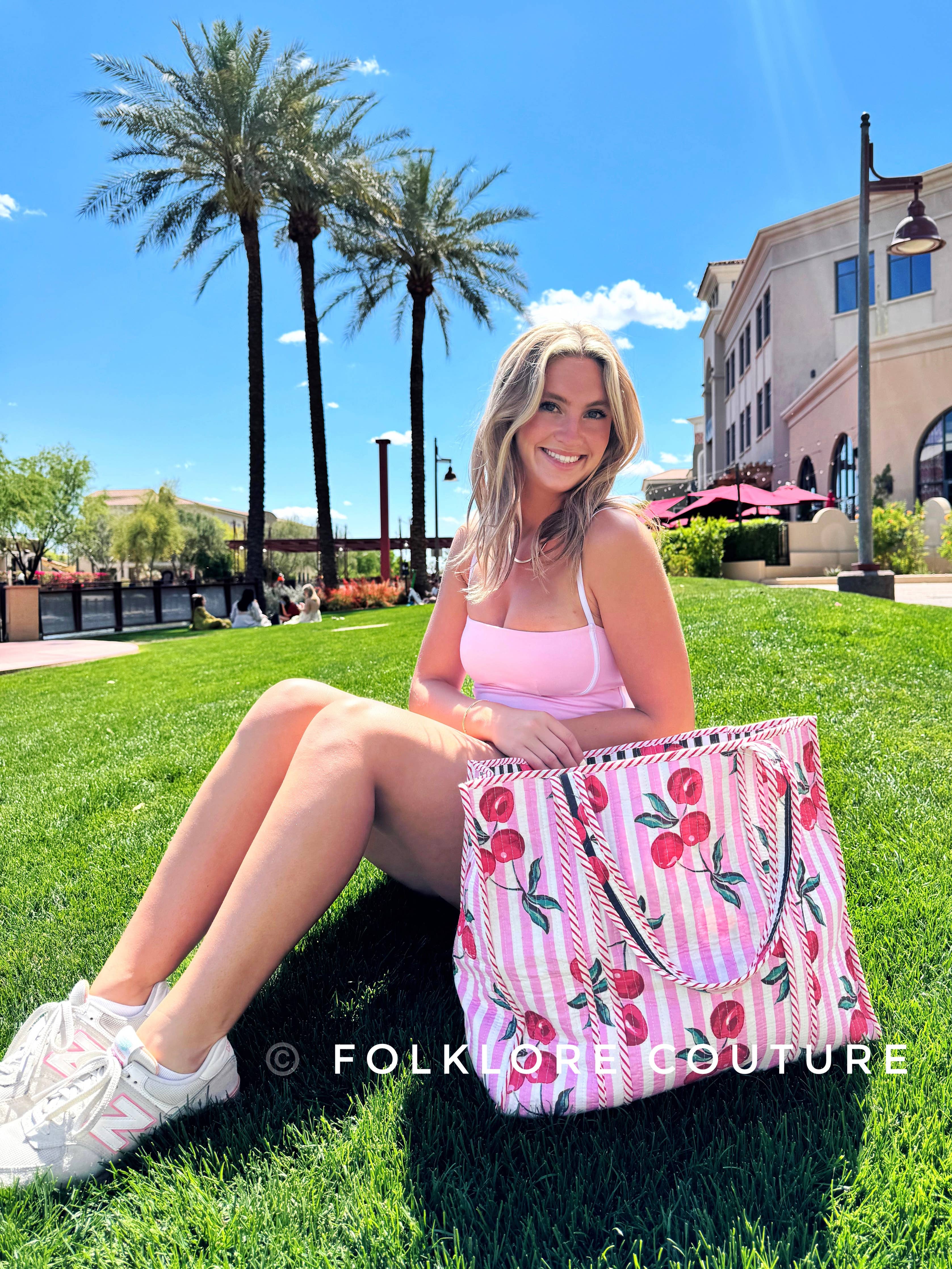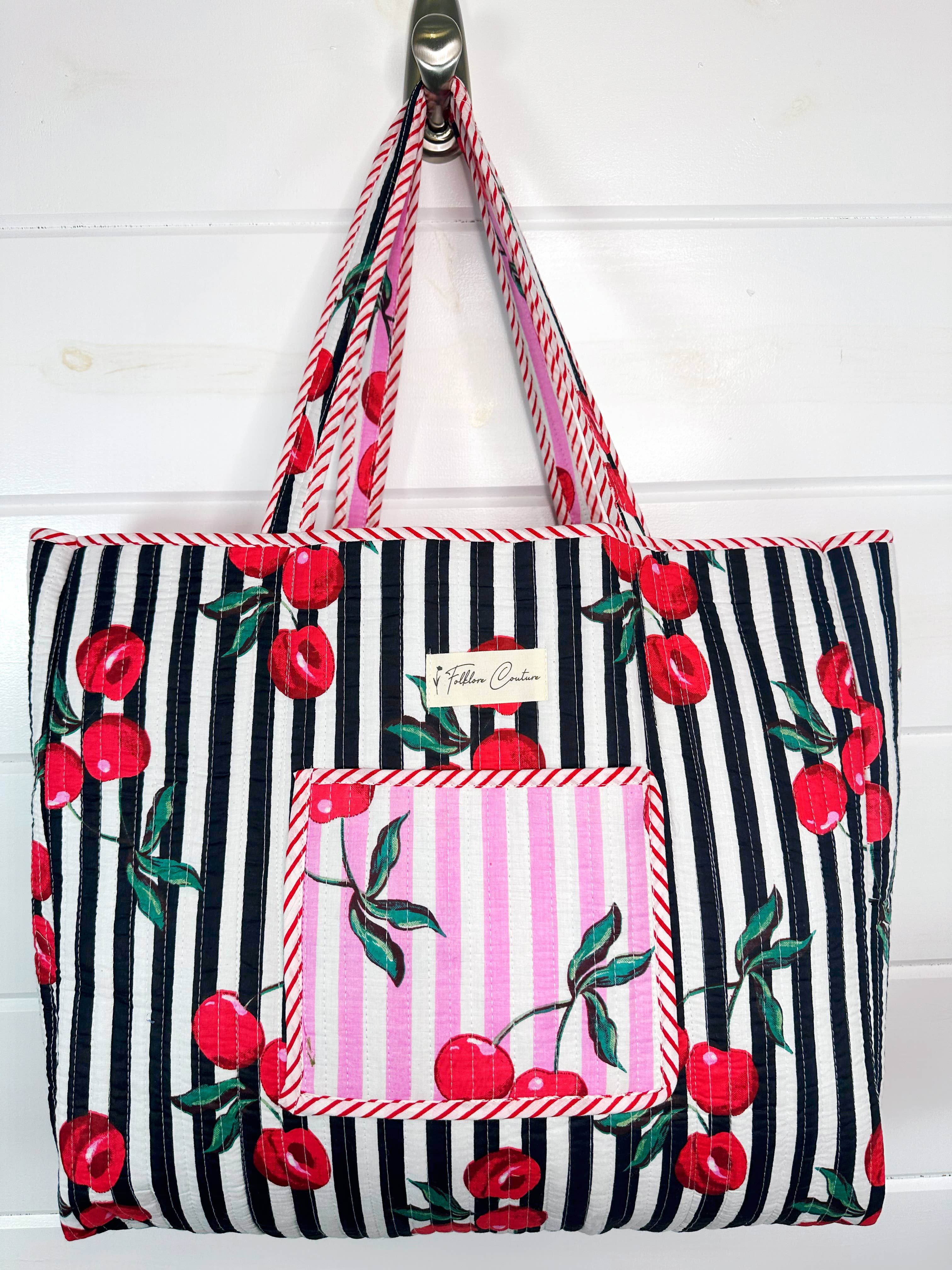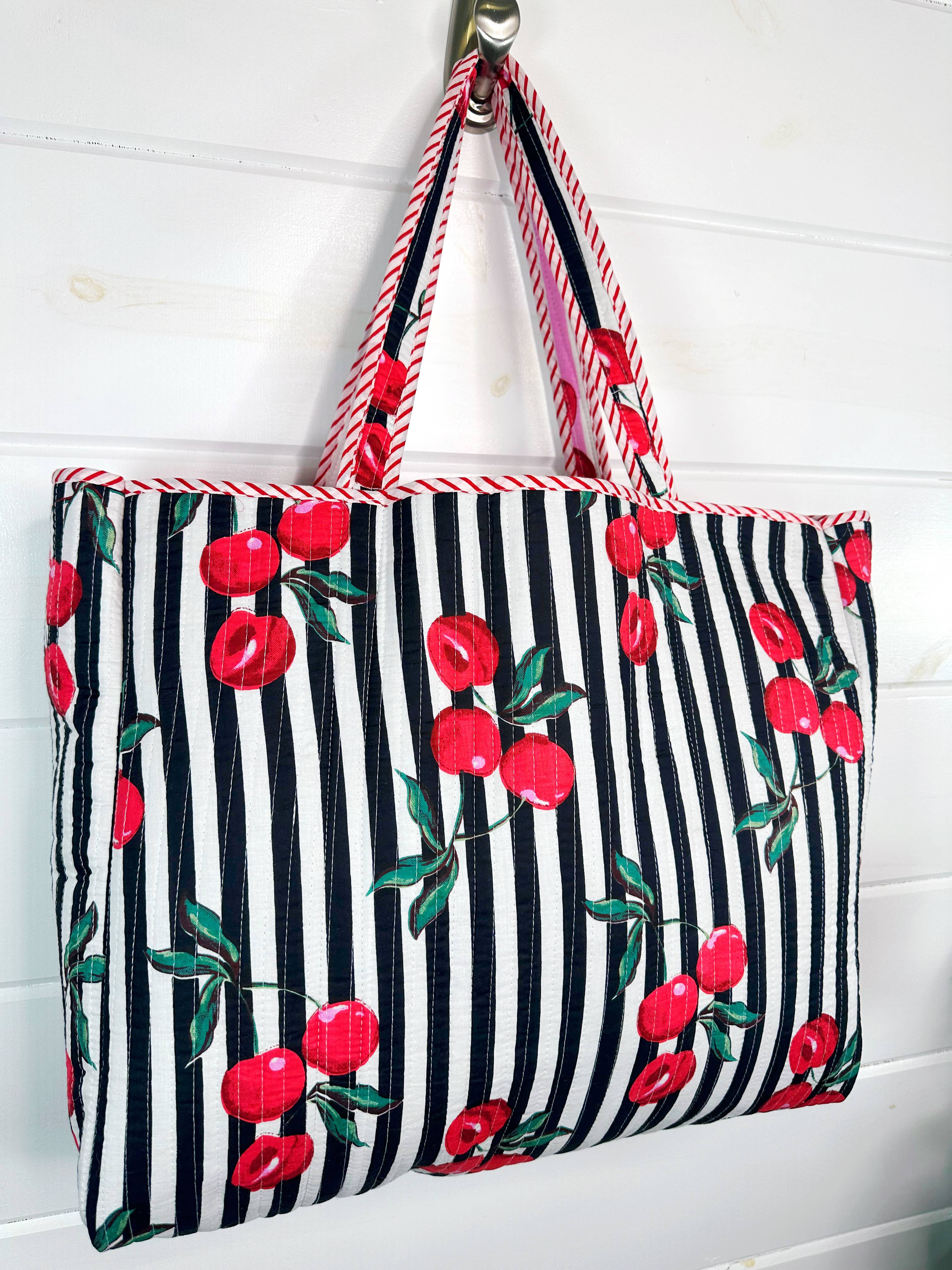 Striped Cherry Print Print Oversized Quilted Tote Bag - Reversible tote with contrasting interior - Interior pocket - 17.5" x 17.5" - 100% Cotton - Quilted block print fabric Perfect for: market tote, beach tote bag, weekender bag, overnight bag, large shopping tote, travel bag & more! Great to sell for gift shop items, upscale boutiques, birthday gifts, embroidery blanks & more! Our quilted pieces are handmade by Indian artisans. The cotton fabrics are handprinted and proudly sustainably made.