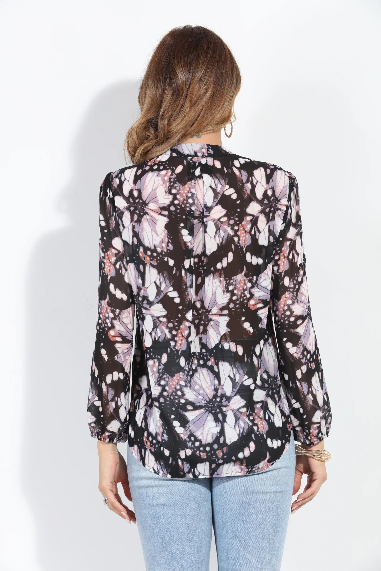 The Chiffon Print Surplice Top features a mandarin collar with a tie, a surplice lined front, and 3/4 length sleeve with an elastic cuff.