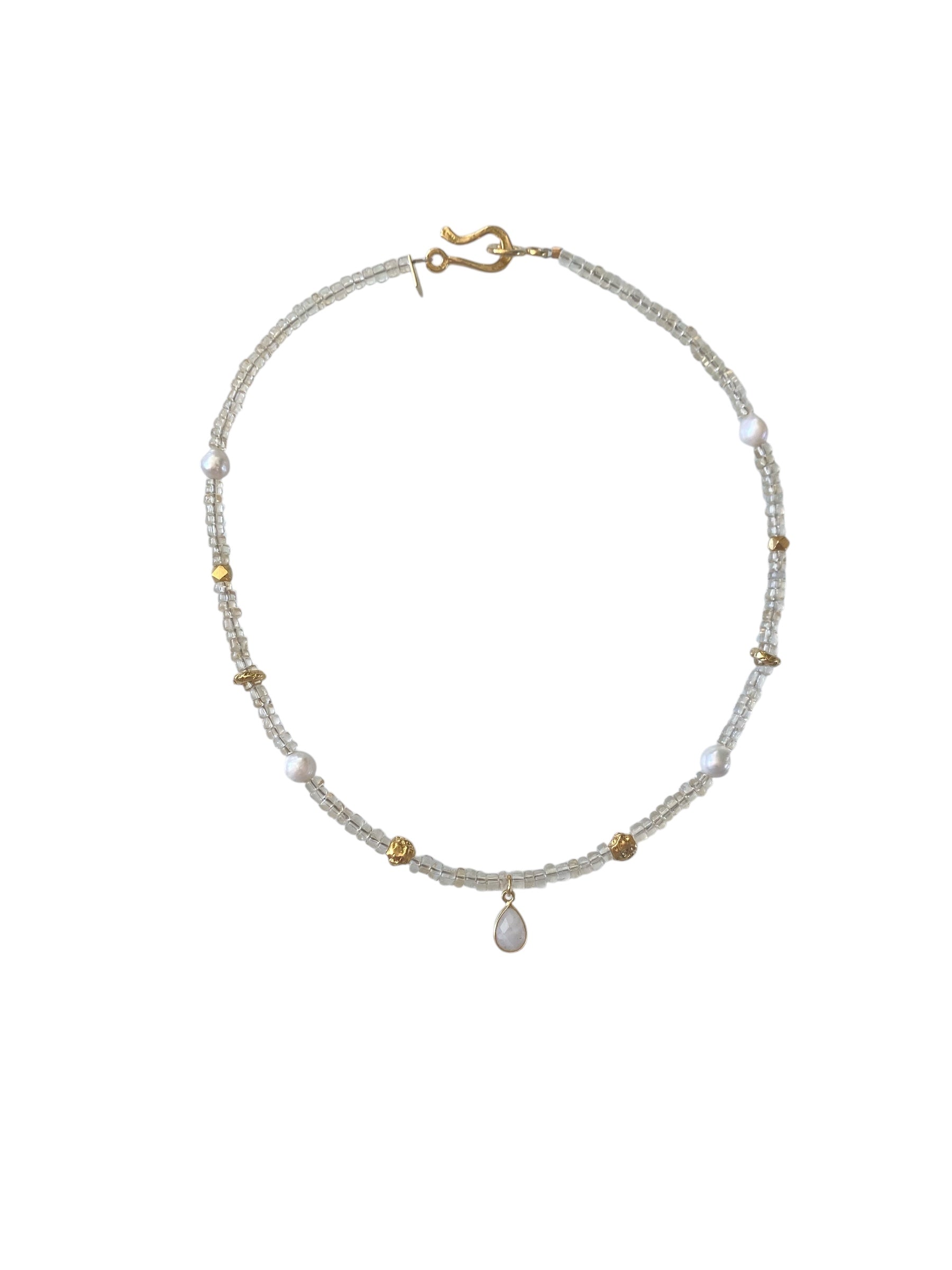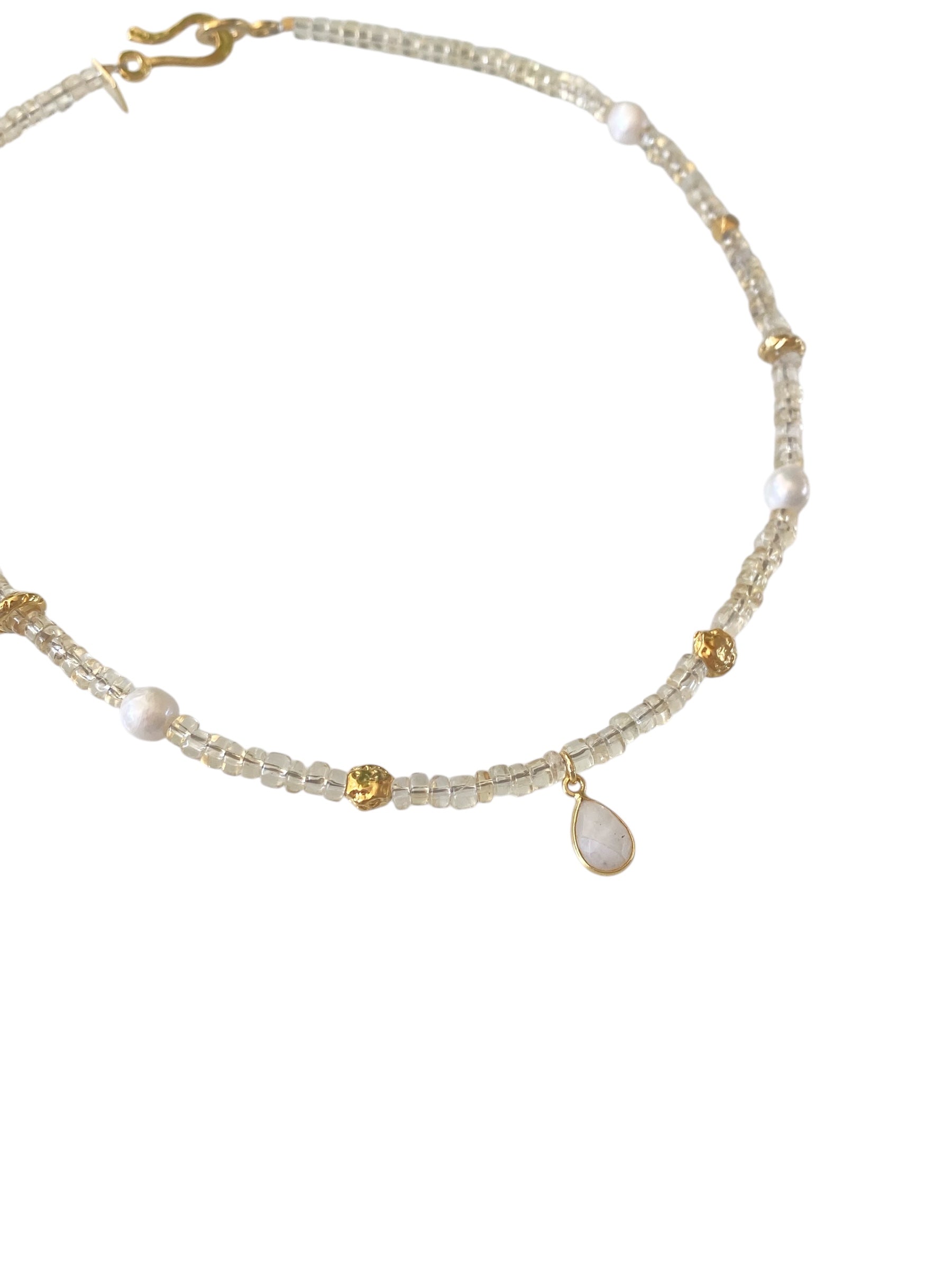 It’s made from 18K gold-filled metal and detailed with moonstone, citrine, and freshwater pearls — a combination that reflects light beautifully and symbolizes joy and balance.