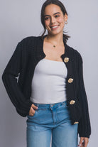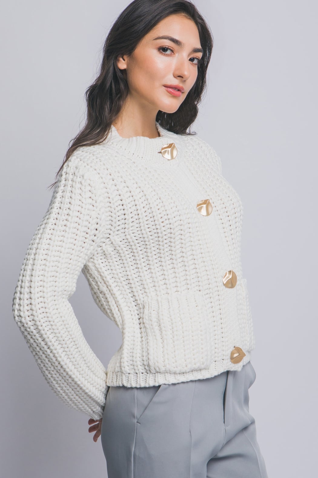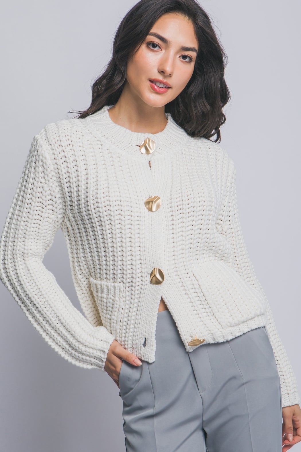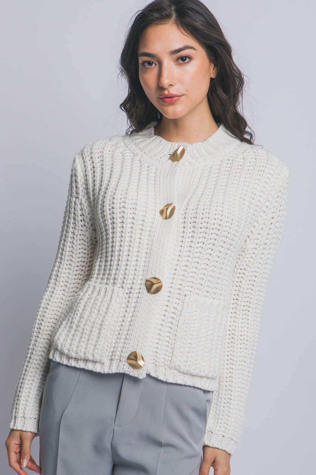 A chunky knit cardigan with a cozy, textured stitch and oversized gold buttons for a modern touch. This Chunky Knit Cardigan is cut with a relaxed silhouette and large gold buttons. The thick sweater knit and front patch pockets make it ideal for cooler days or lounging at home. Pair it with jeans or a simple tee for a casual, put-together look.