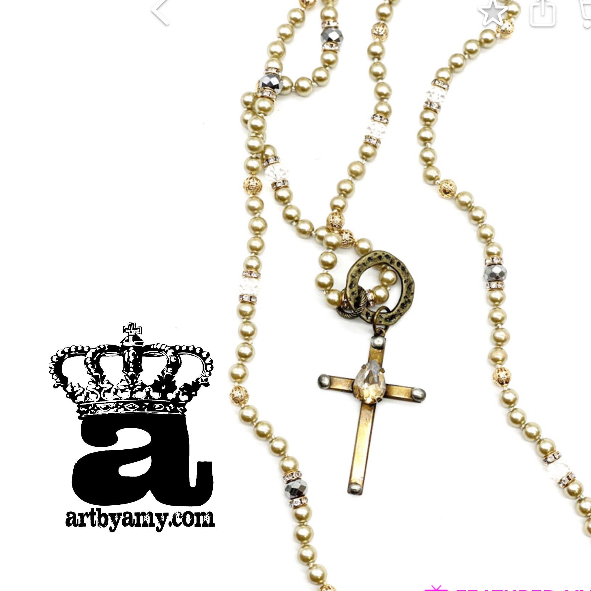 These Church Cross Pearls are a stunning addition to any jewelry collection. Not only are they an amazing stand alone but they make a great layering piece too! The 48 inch pearls come with a j hook so you can clip in between any beads to stay where you want to put your crosss. The cross is on a large link so it will always slide to the center no matter where you put your j hook. The cross is hung from an antique brass hammered circle and is soldered with artisan dots and a soldered crystal in the center. Choose either from champagne or cream pearls. The pearls are extraordinary with rhinestone slider and crystal beads in the mix.