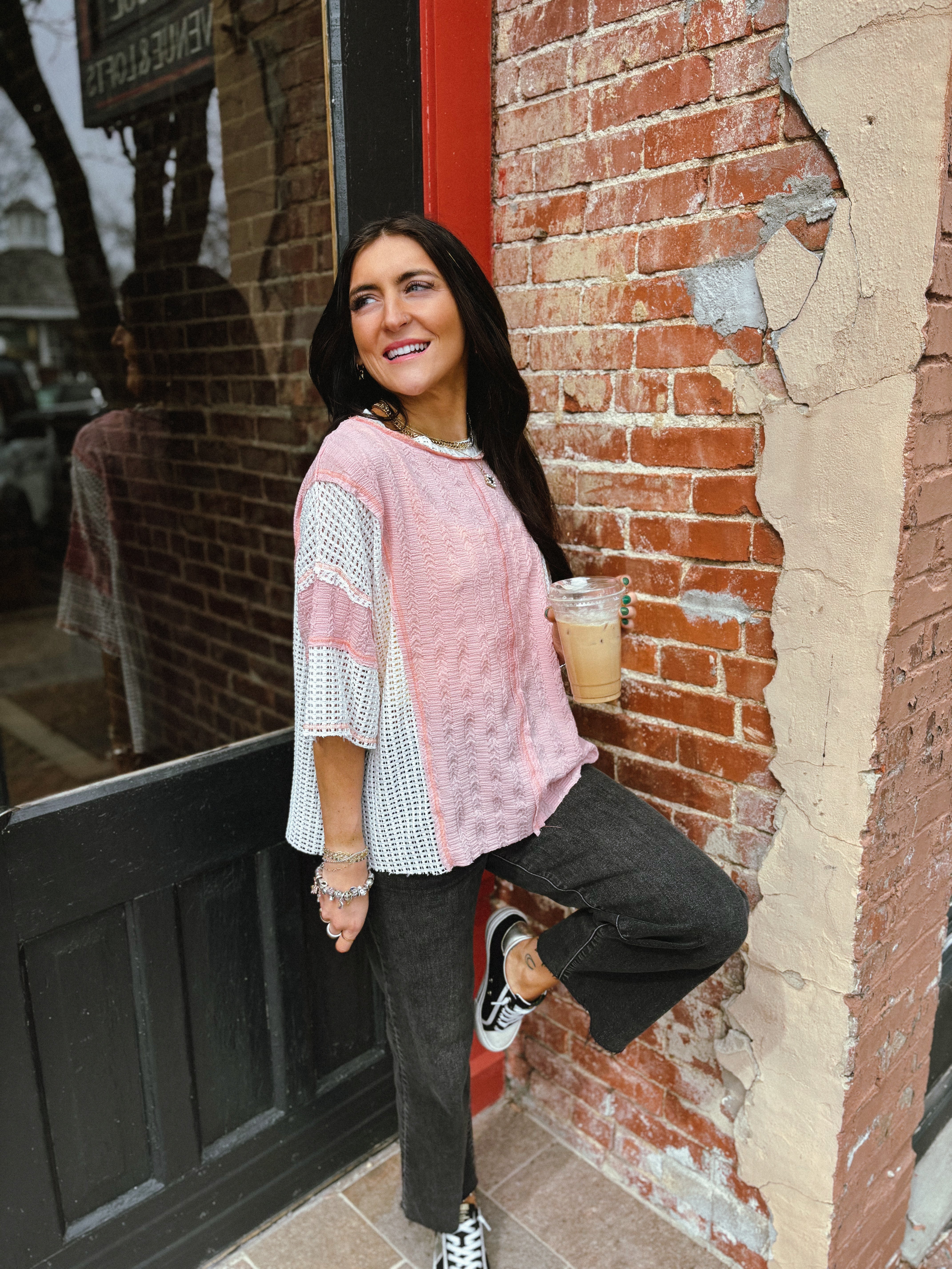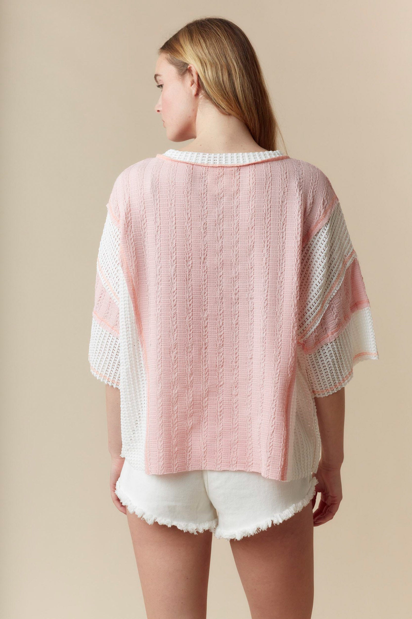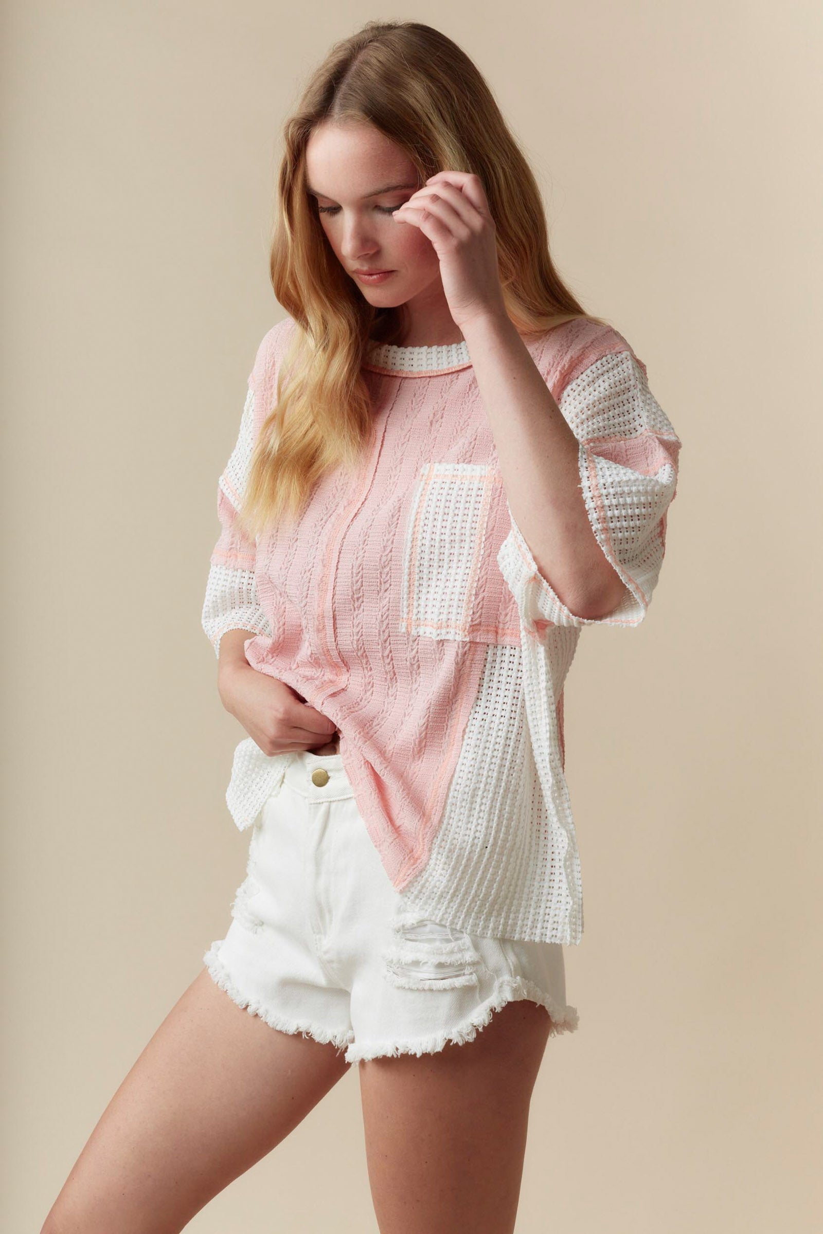 Rock a playful and oversized look with our Cindy Pink & Cream Pocket Tee. This color block reverse stitched top features a round neck and short sleeves for added comfort. Perfect for a fun and laid-back day out.