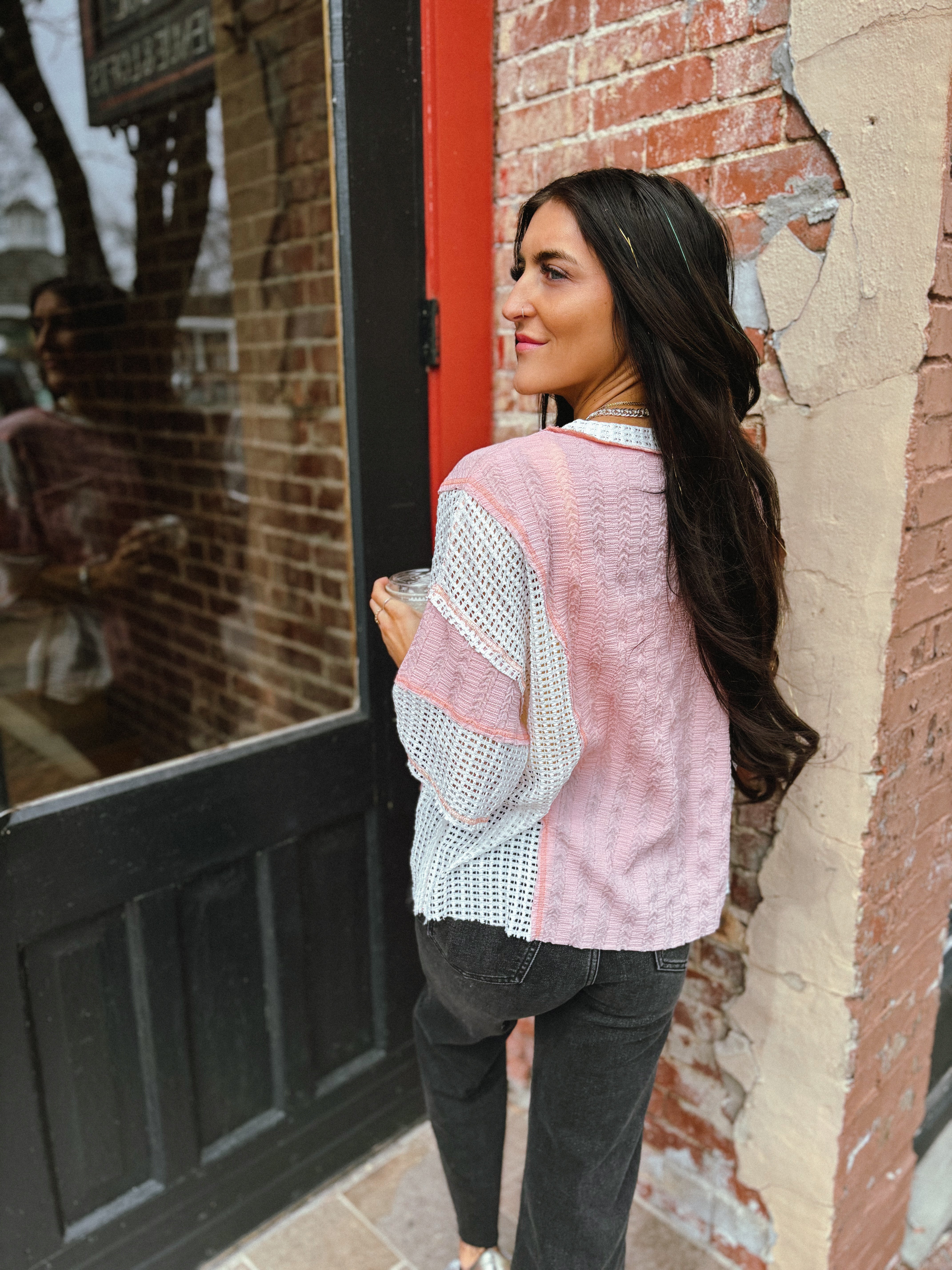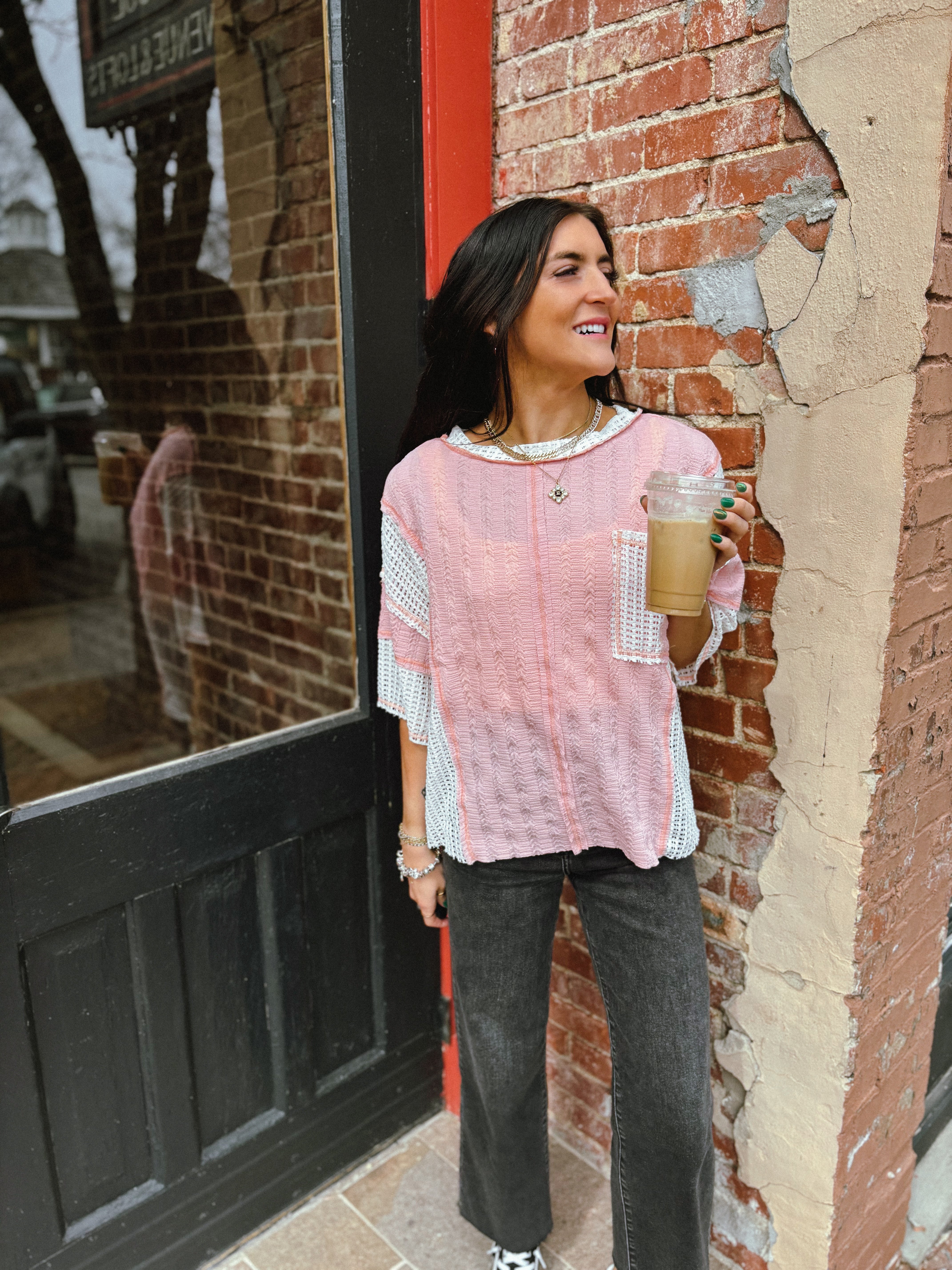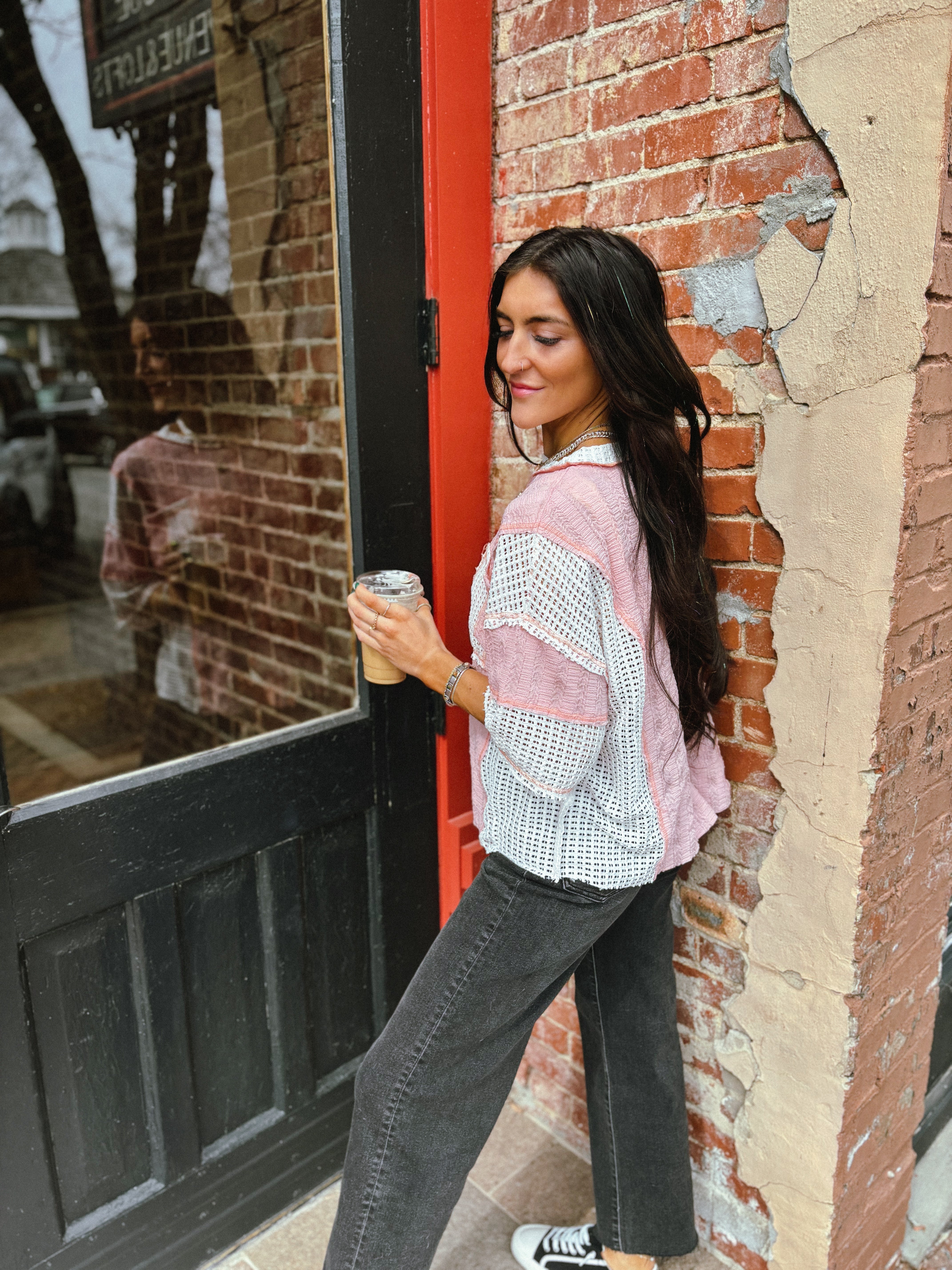 Rock a playful and oversized look with our Cindy Pink & Cream Pocket Tee. This color block reverse stitched top features a round neck and short sleeves for added comfort. Perfect for a fun and laid-back day out.