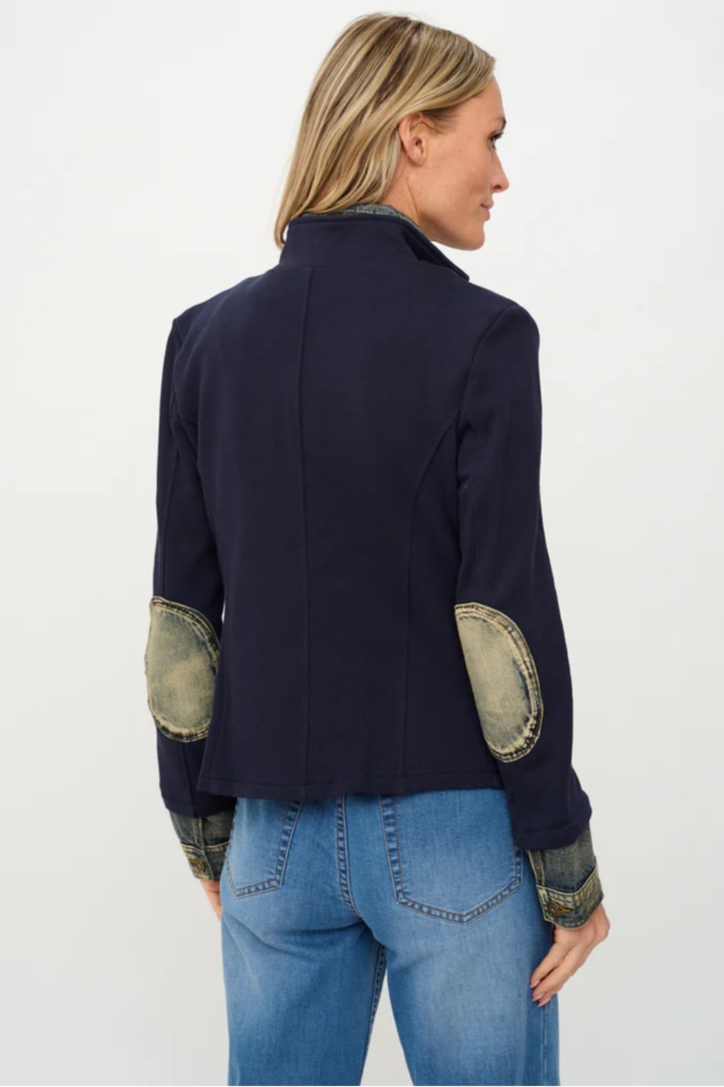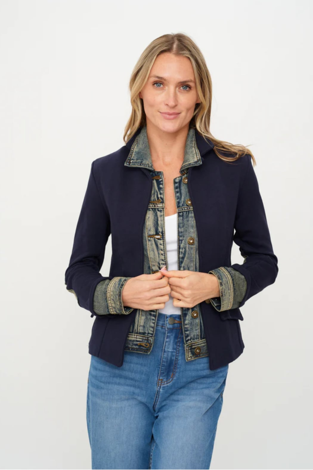 A tailored, hip-length jacket with denim-trim detailing for a polished, layered look. The Clarissa Jacket from Six Ffity pairs a structured navy blazer silhouette with visible denim accents at the collar and cuffs. Long sleeves and a slightly cropped hem make it ideal for smart-casual wear or office outfits.