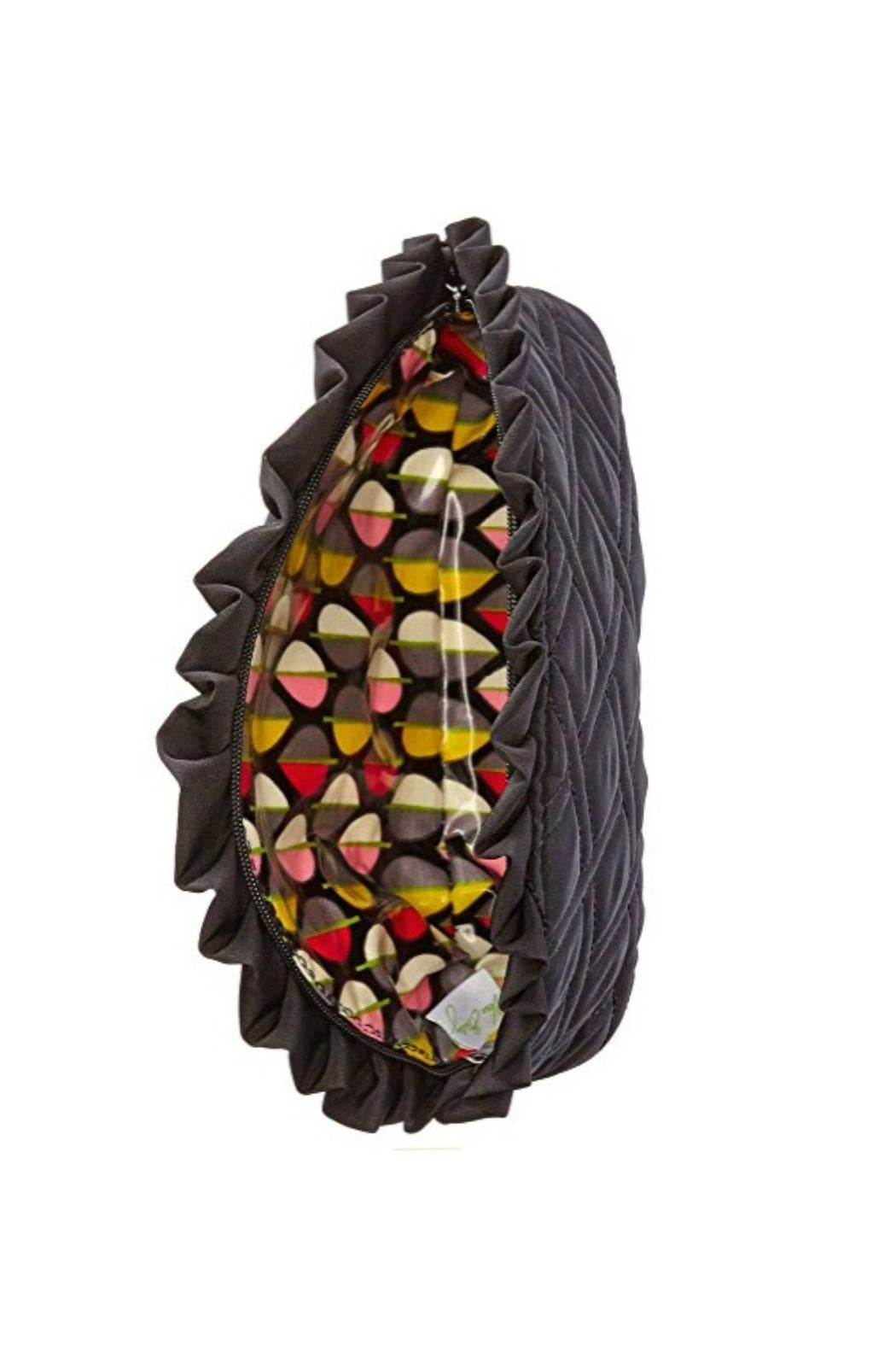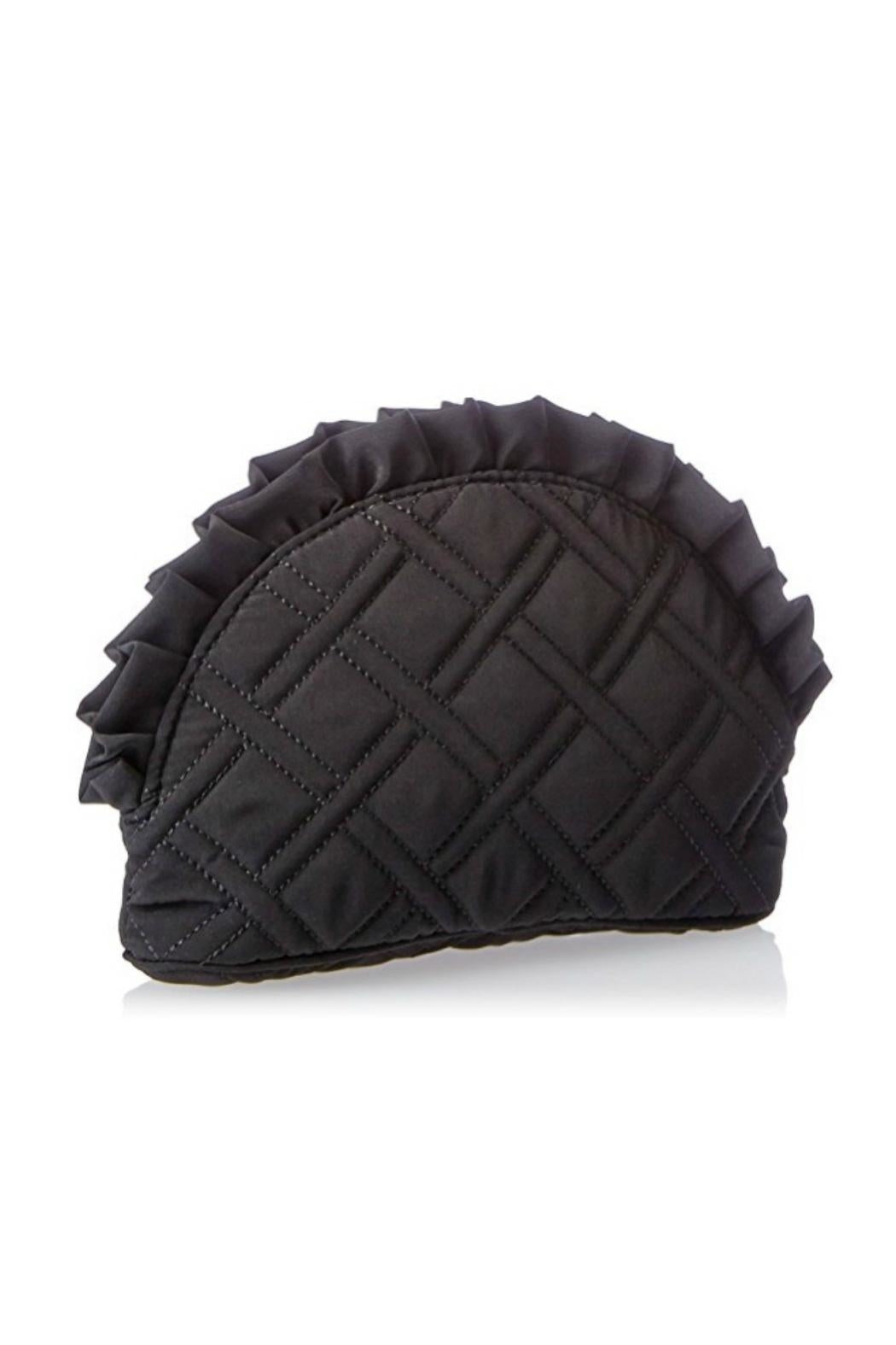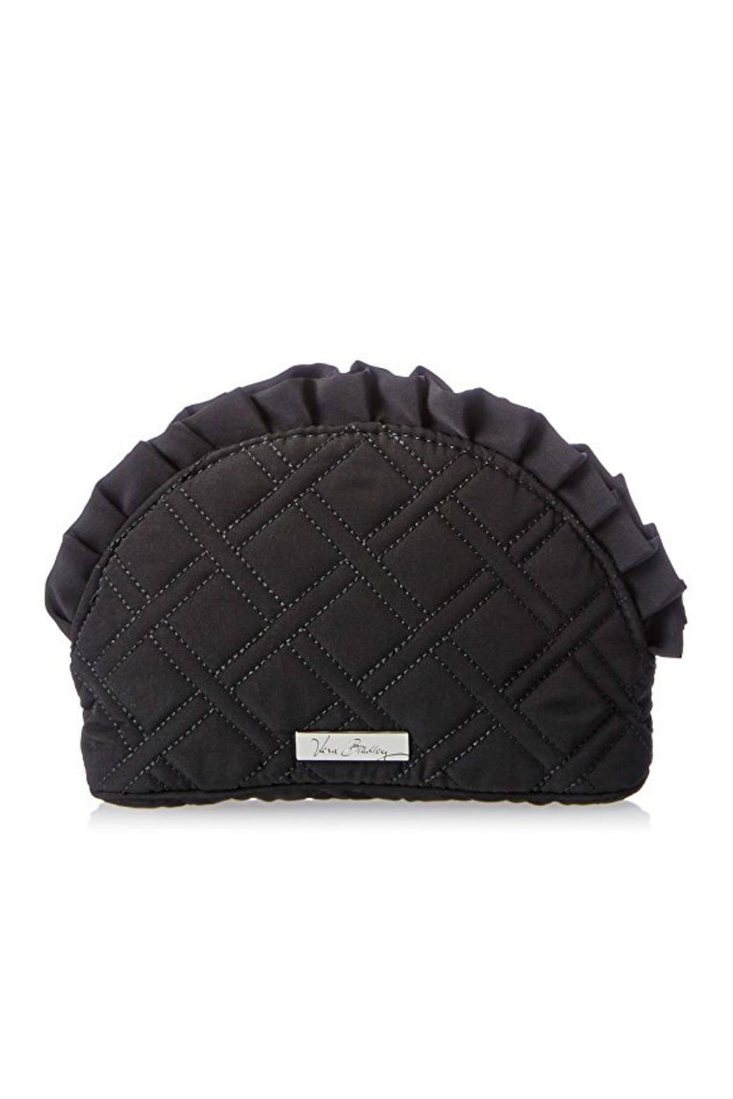 Here is the Vera Bradley Ruffle Cosmetic Bag in Classic Black. Beautiful basket weave quilting on lightweight water repellant microfiber polyester on the exterior. The inside is vinyl lined for easy cleaning. Zips open wide so you are able to quickly find what you need. Silver signature plate on front. Machine wash cold gentle cycle, line dry. Find other Classic Black bags and accessories on the Mimi's Gift Gallery boutique page.