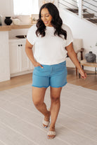 - Celeste Mid Rise Shield Pocket Cutoff Shorts in Sky Blue