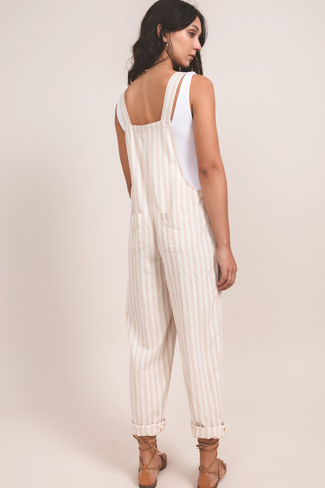 We are in love with these khaki and ivory striped overalls! They feature cuffed pant legs, back pockets, and button closure for the straps. Wear a tank or tee underneath to style!