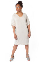 The Cocoon dress : Toss it on and look effortlessly put together. Ultimate comfort sheik. Bias binded V neck line and bias binded at the dropped dolman sleeve. Inset raglan seam that turns into a nice sized pocket. Tapers in slightly at the bottom hem with being constricting and allows for full movement. A dress to live in.