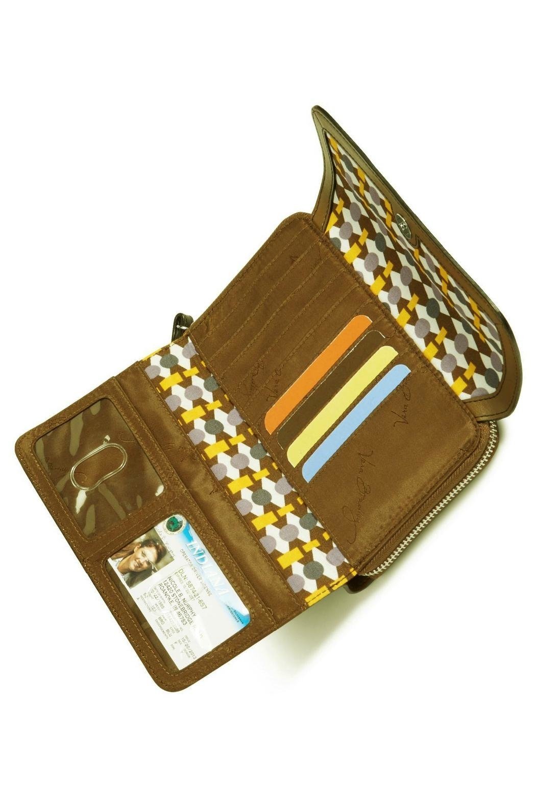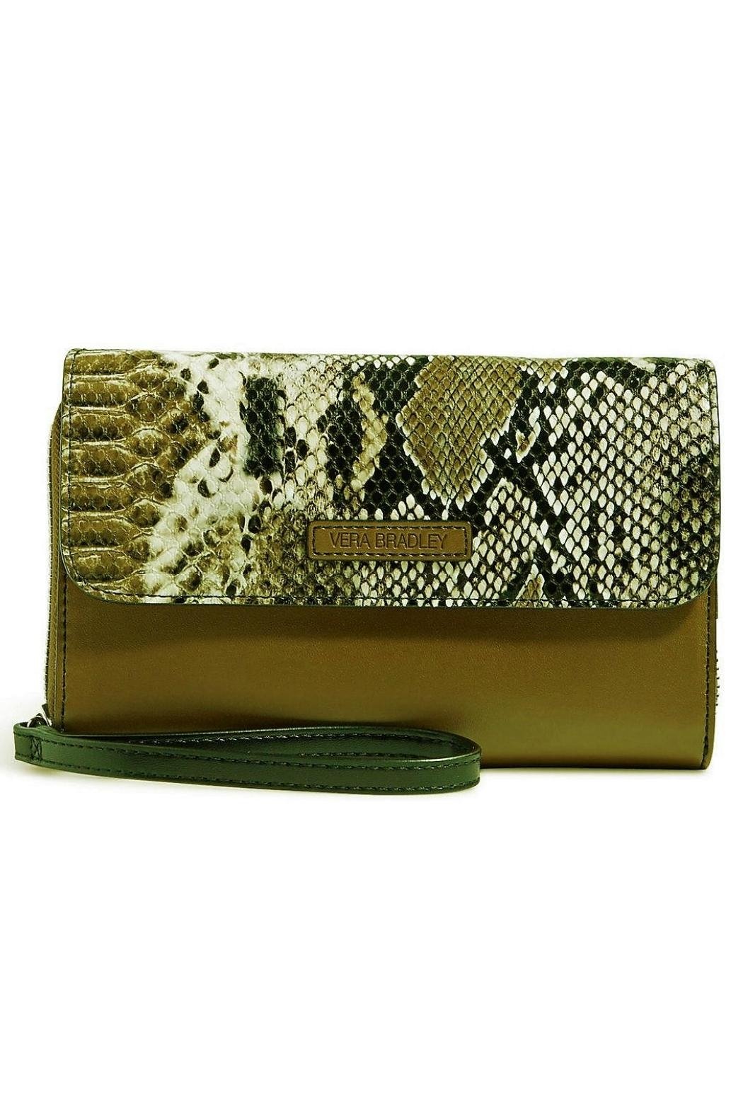 Meet the Vera Bradley Ultimate Wristlet in the Coffee pattern. Stash your credit cards, cash, ID, coins, and even your phone—there's room for it all. The vegan leather and faux snakeskin give it a super classy look. Inside the front flap magnetic snap closure is a compartment with 10 card slip pockets, two ID windows, and a bill pocket. Zip compartment has a divided interior with one bill pocket, two pleated compartments and six card slip pockets. Pattern placement will vary. Fits a phone up to 6.5". Find more vegan leather Vera Bradley bags and accessories on the Mimi's Gift Gallery boutique page. ------- Dimensions are 7 ¼" wide x 4 ¾" high x 1 ½" deep with a 6" vegan leather wrist strap.