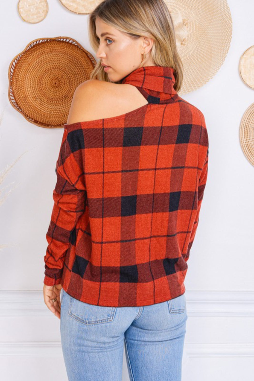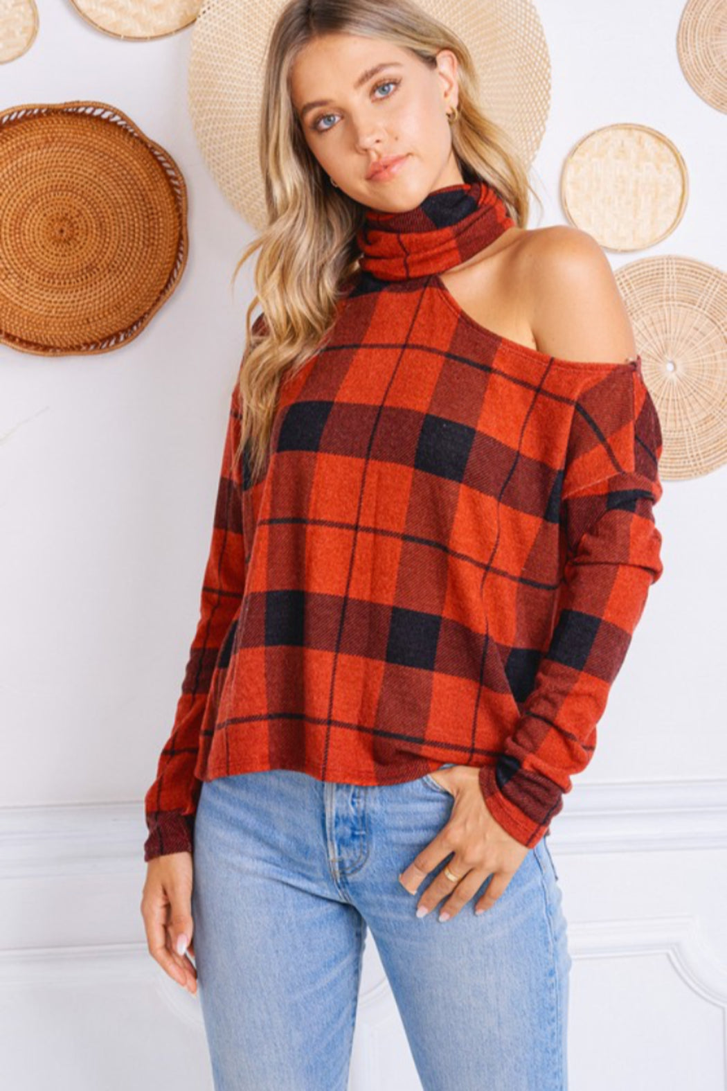 This buffalo plaid print top features a turtle neck line and one cold shoulder detail. Pairs great with leggings or denim jeans.