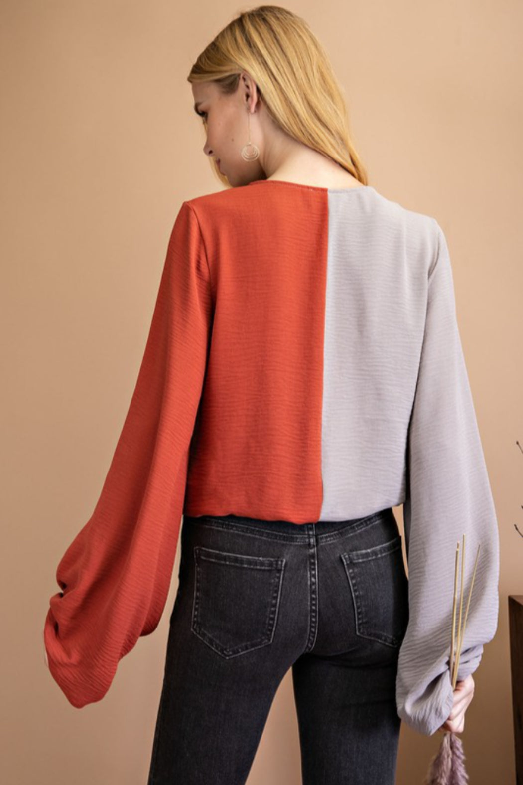 SOLID COLOR BLOCK SURPLICED FRONT BALLOON SLEEVES WITH ELASTIC ON WRIST BODYSUIT TOP