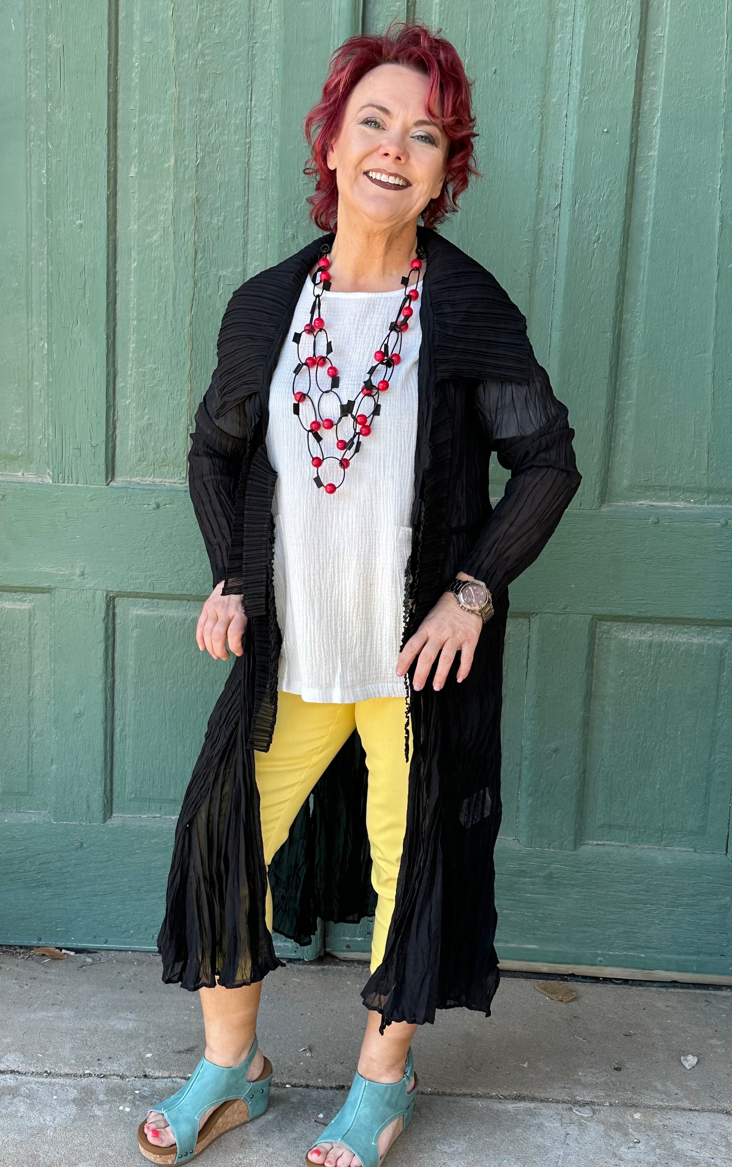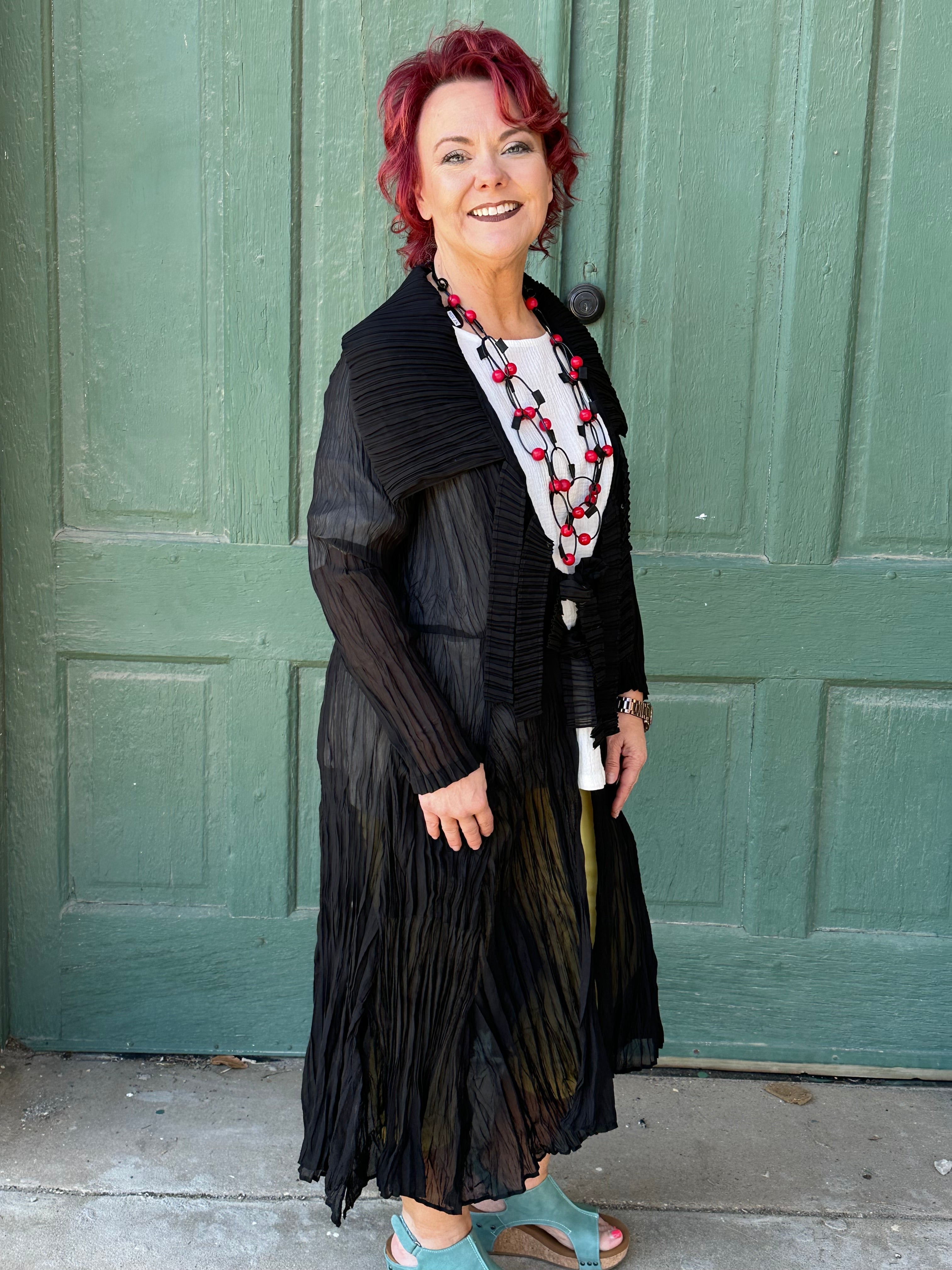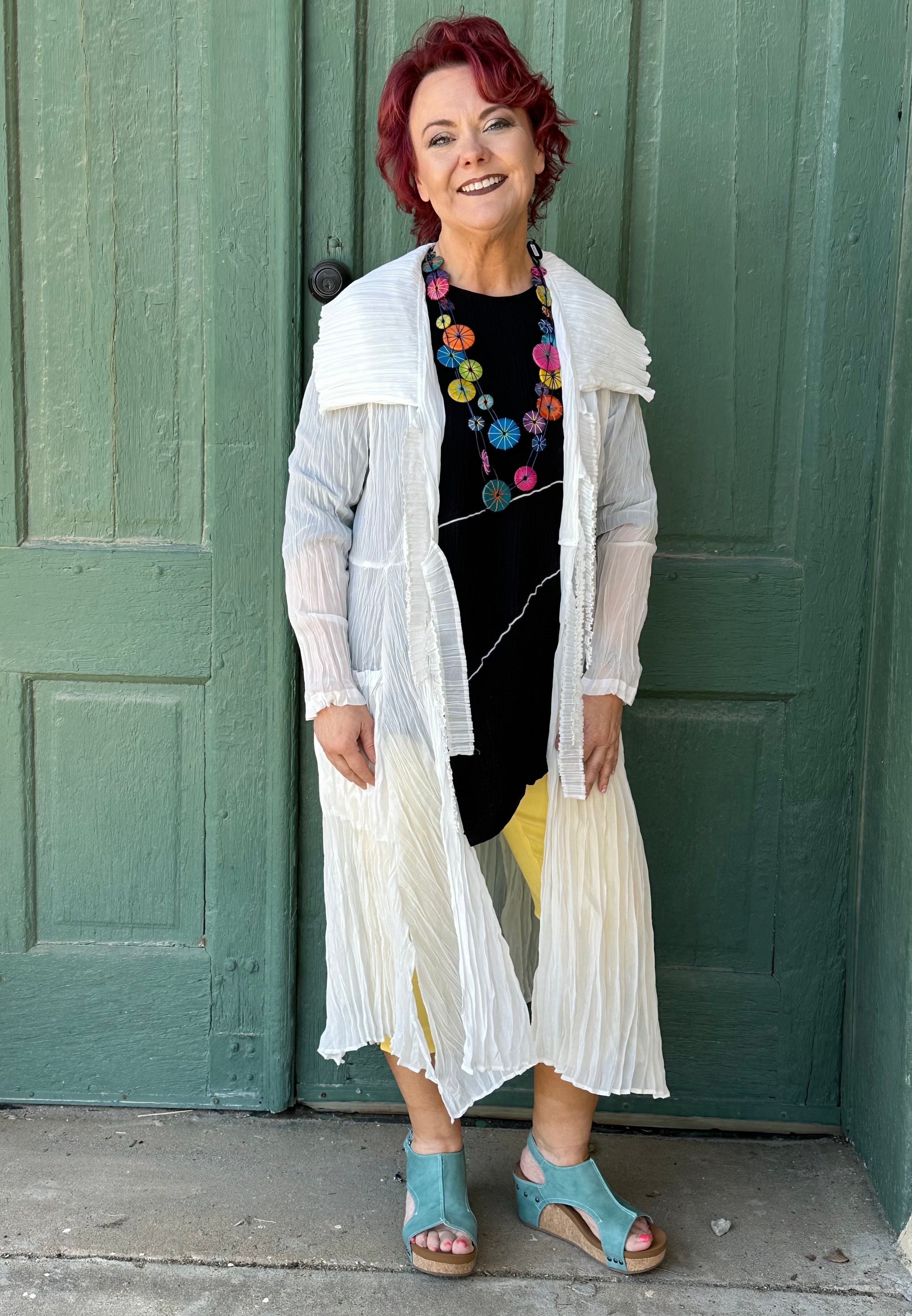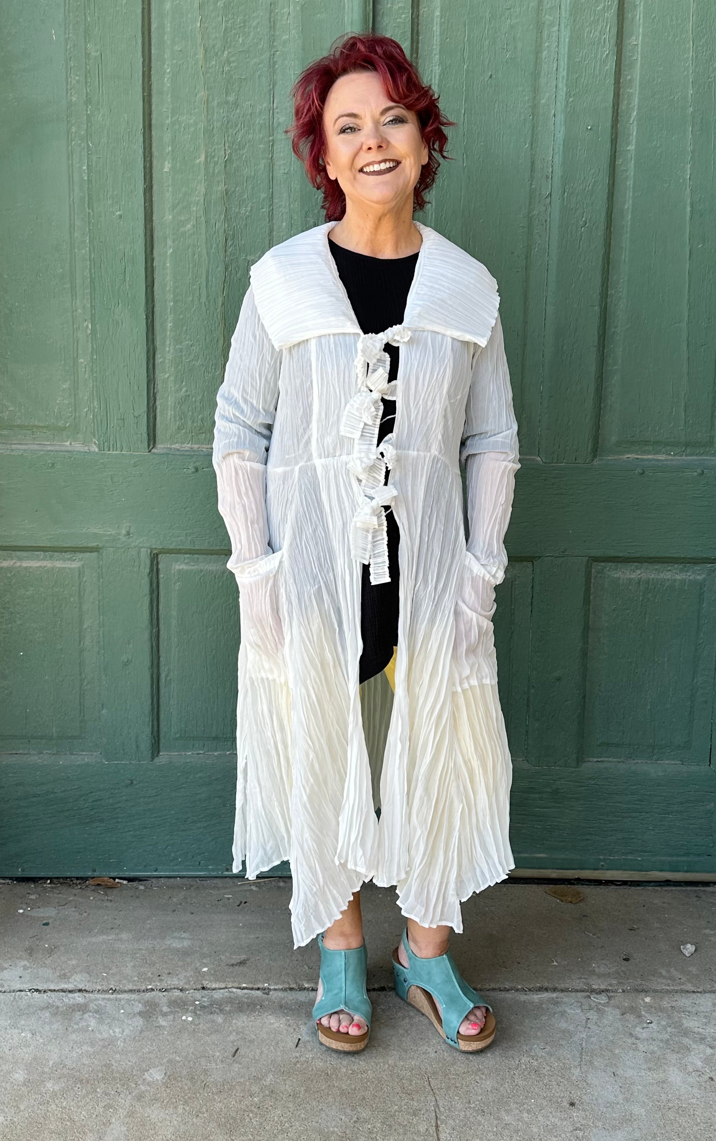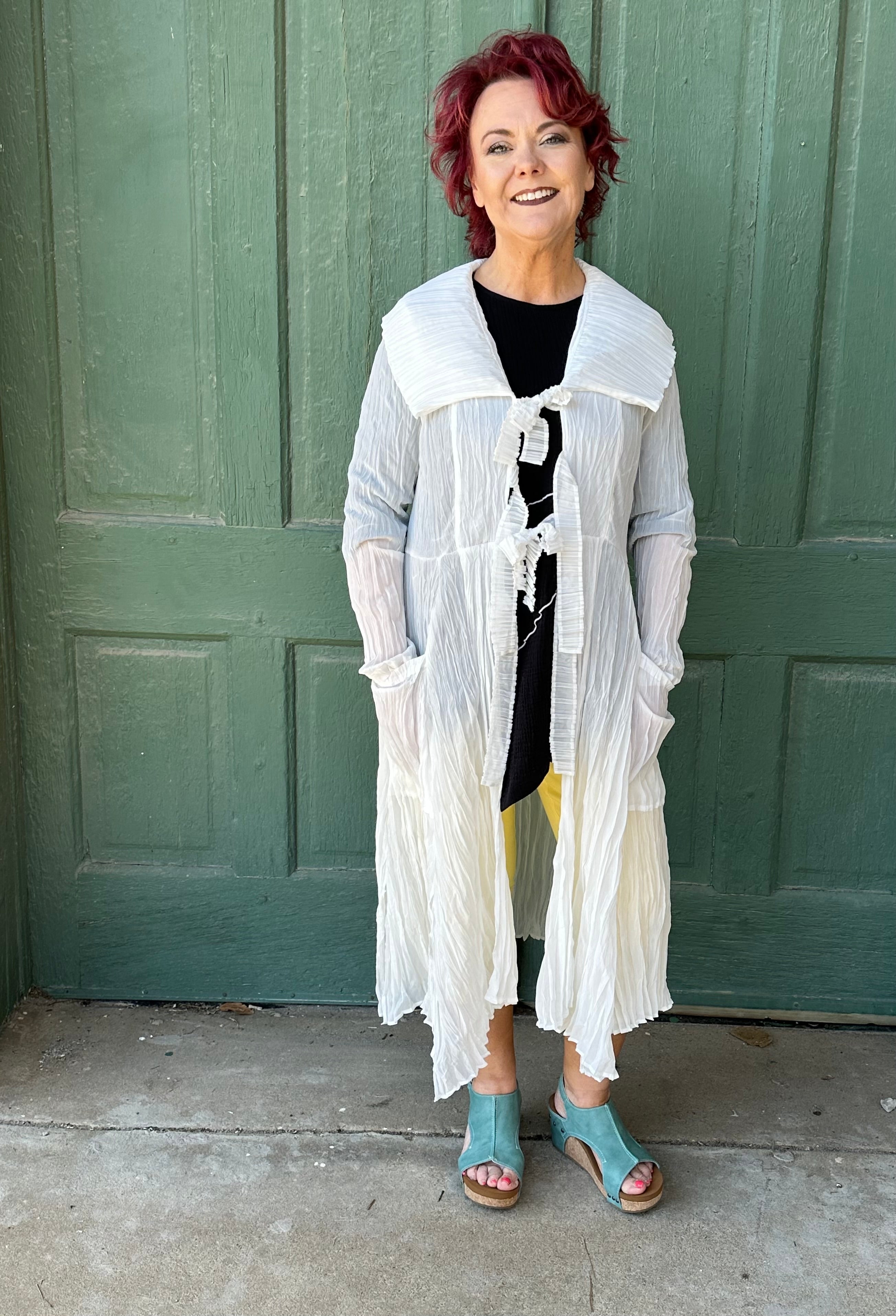 Look no further for the perfect duster - Constance is lightweight and ethereal, with a shawl collar, asymmetrical hem, and side slits, she's sure to make a statement! The sheer crinkle material is beautiful and effortless, while two front pockets add a practical touch to this stunning piece. Slip on Constance and float through your day in style!
