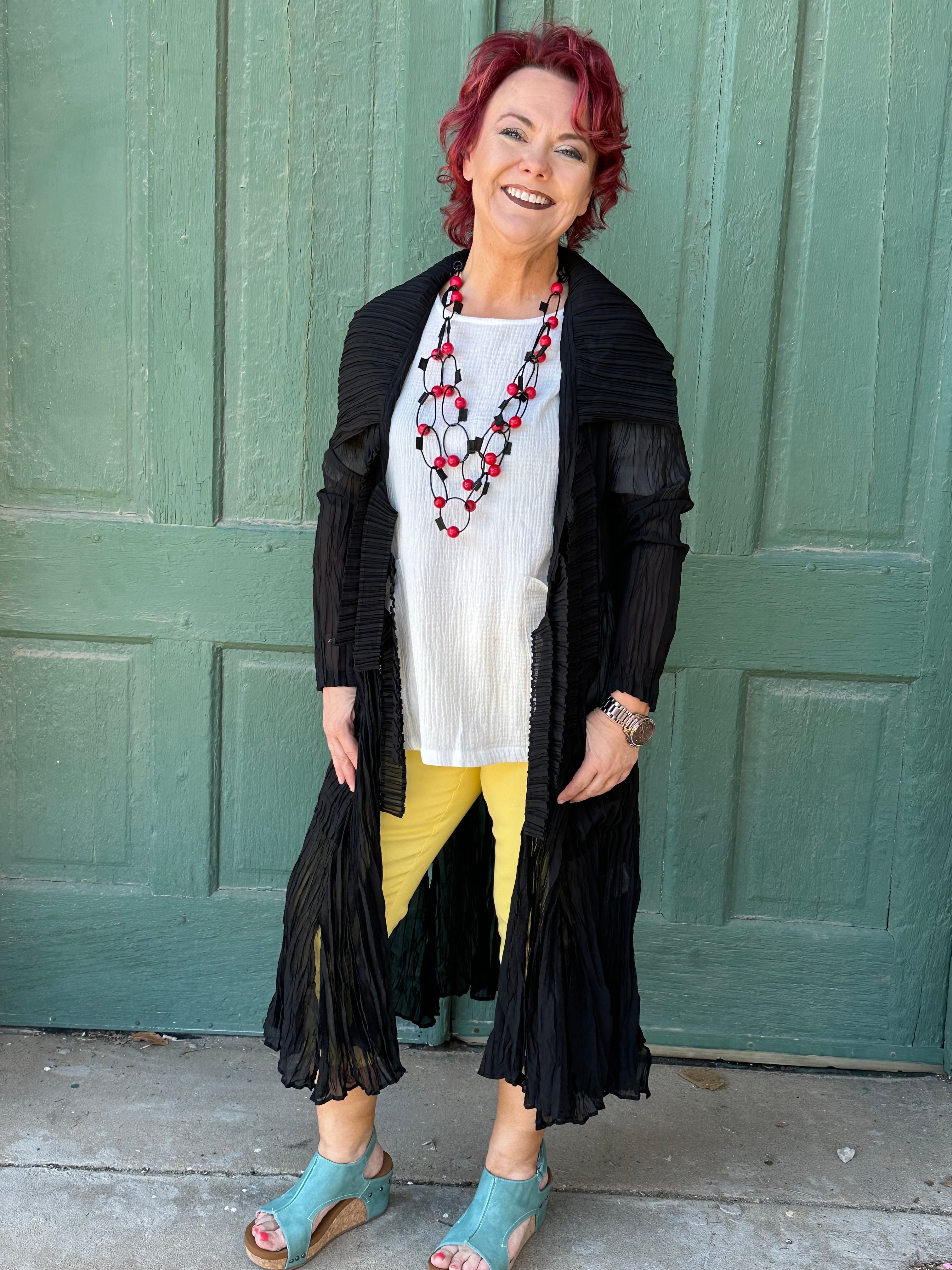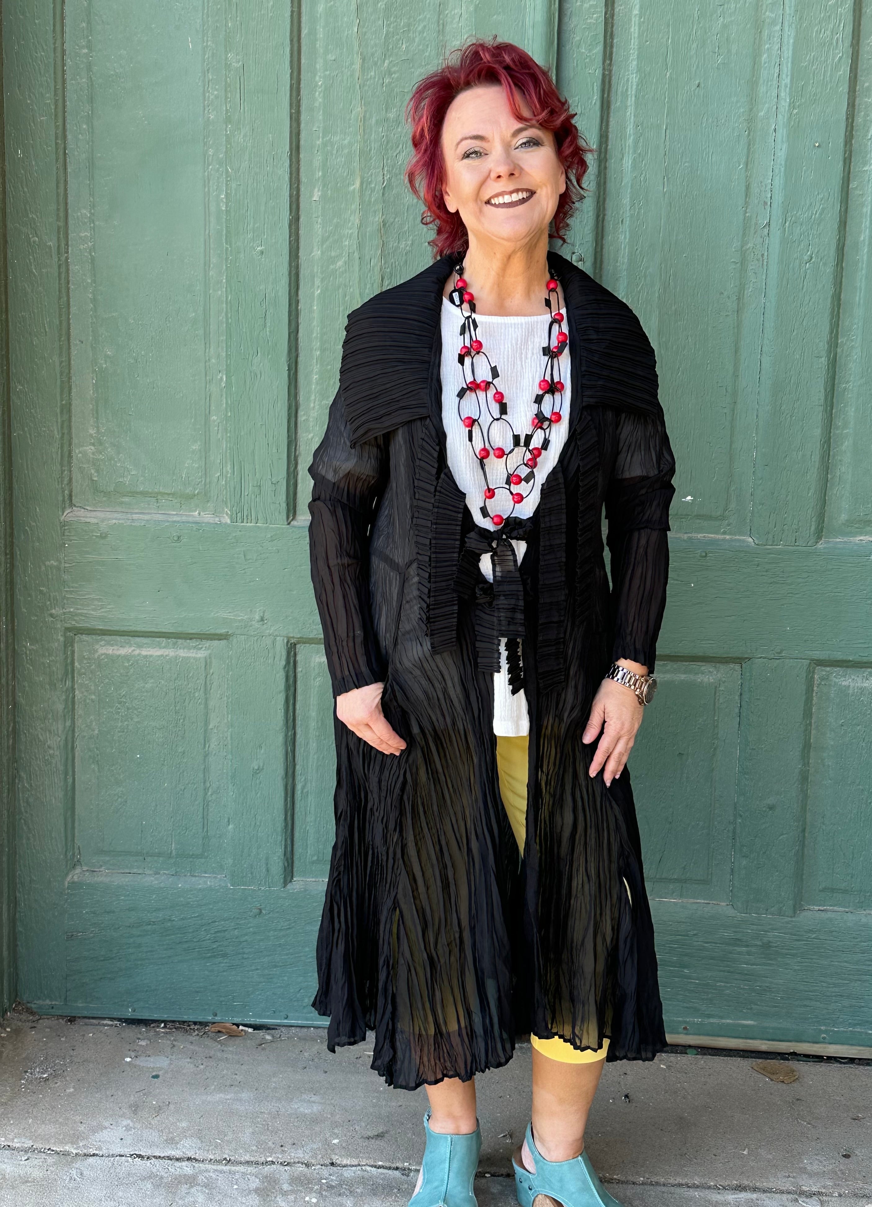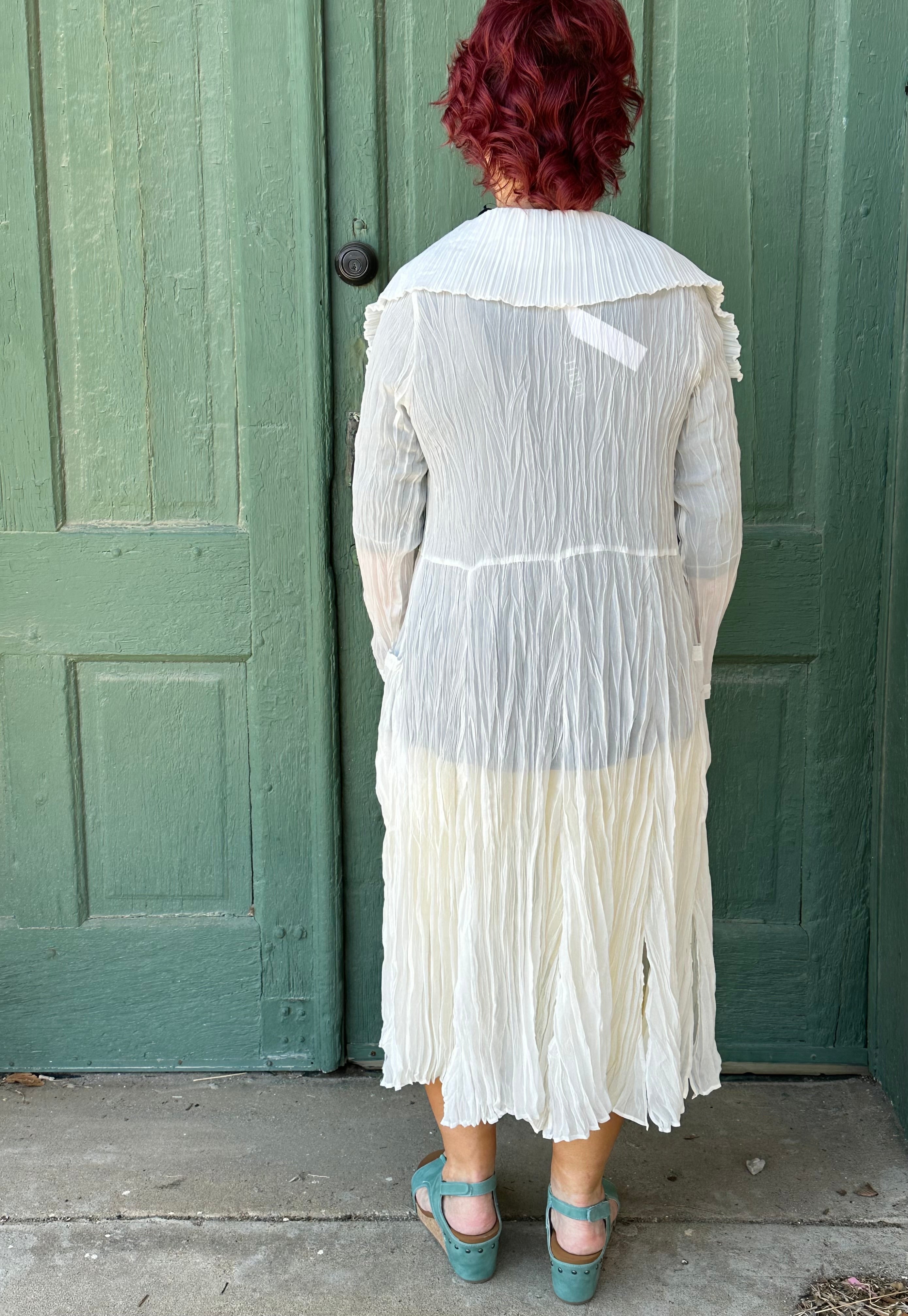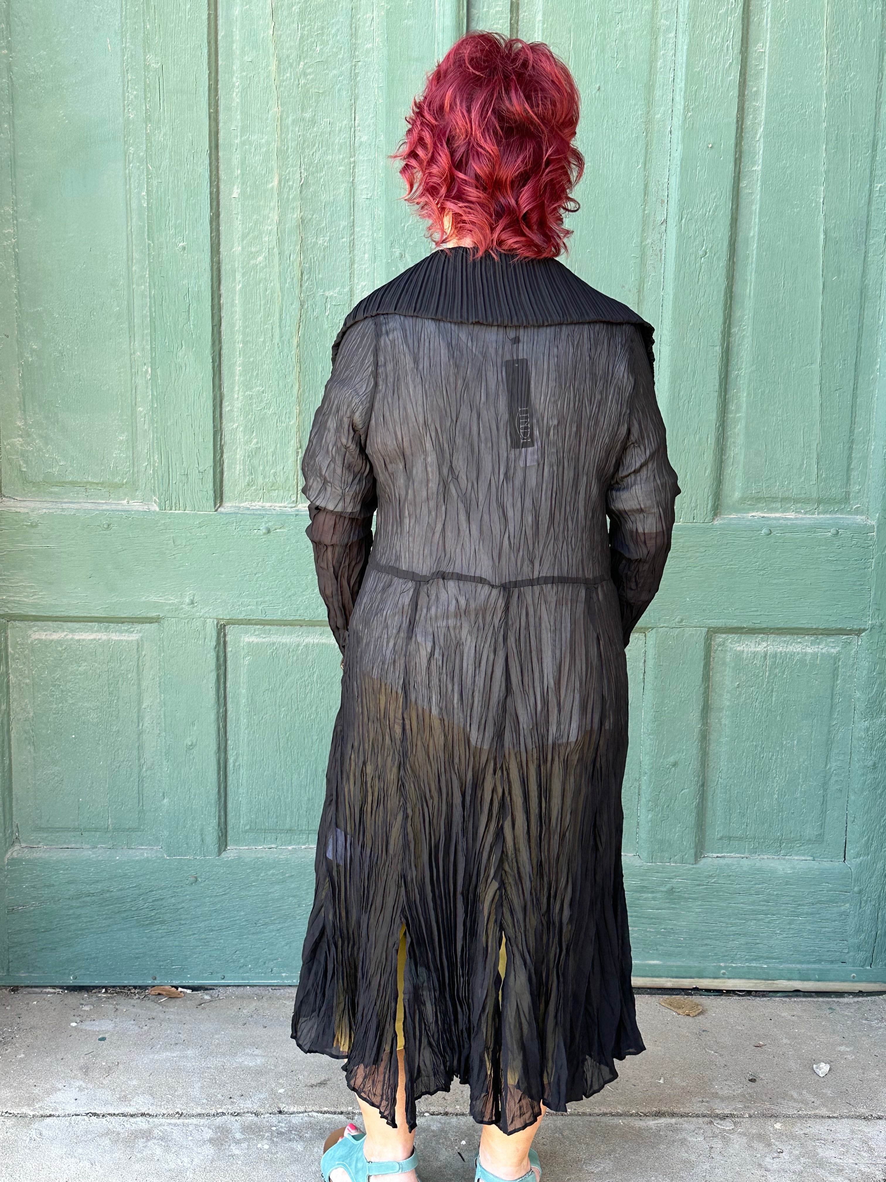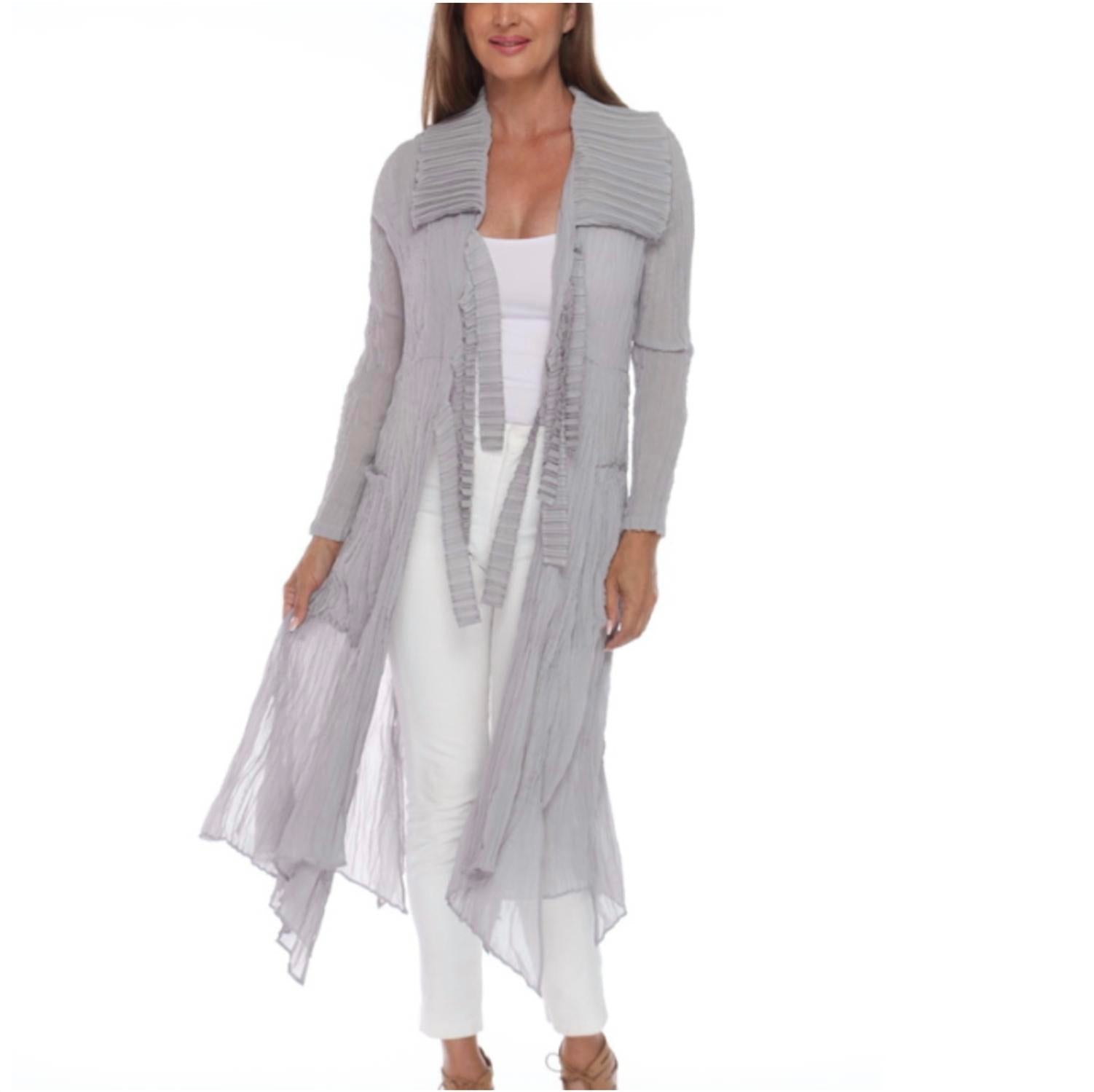 Look no further for the perfect duster - Constance is lightweight and ethereal, with a shawl collar, asymmetrical hem, and side slits, she's sure to make a statement! The sheer crinkle material is beautiful and effortless, while two front pockets add a practical touch to this stunning piece. Slip on Constance and float through your day in style!