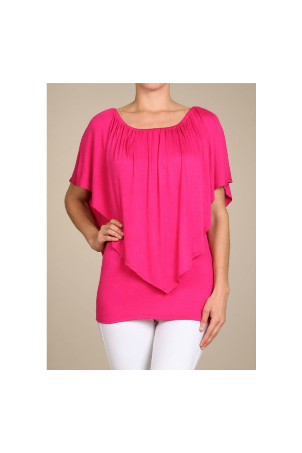 This top is a versatile beauty! Double layered convertible top with elasticized neckline. Front and back feature an overlay that comes down to a V at the hemline. Wear it on or off the shoulder or one shoulder. We love this flattering top!