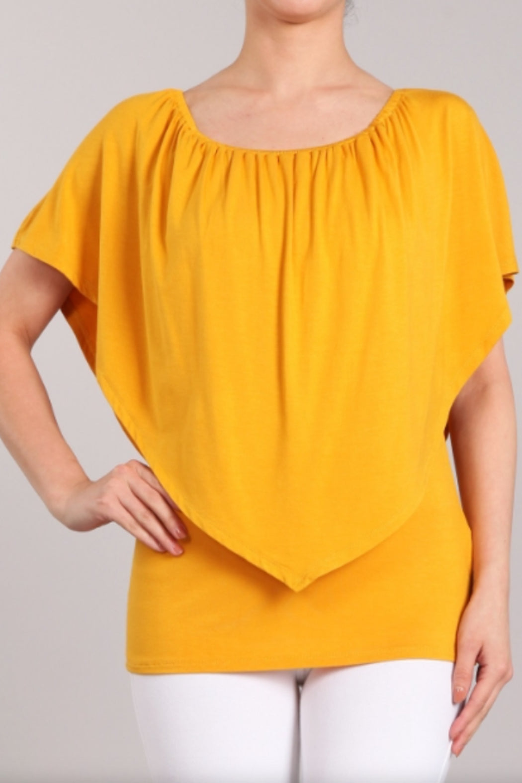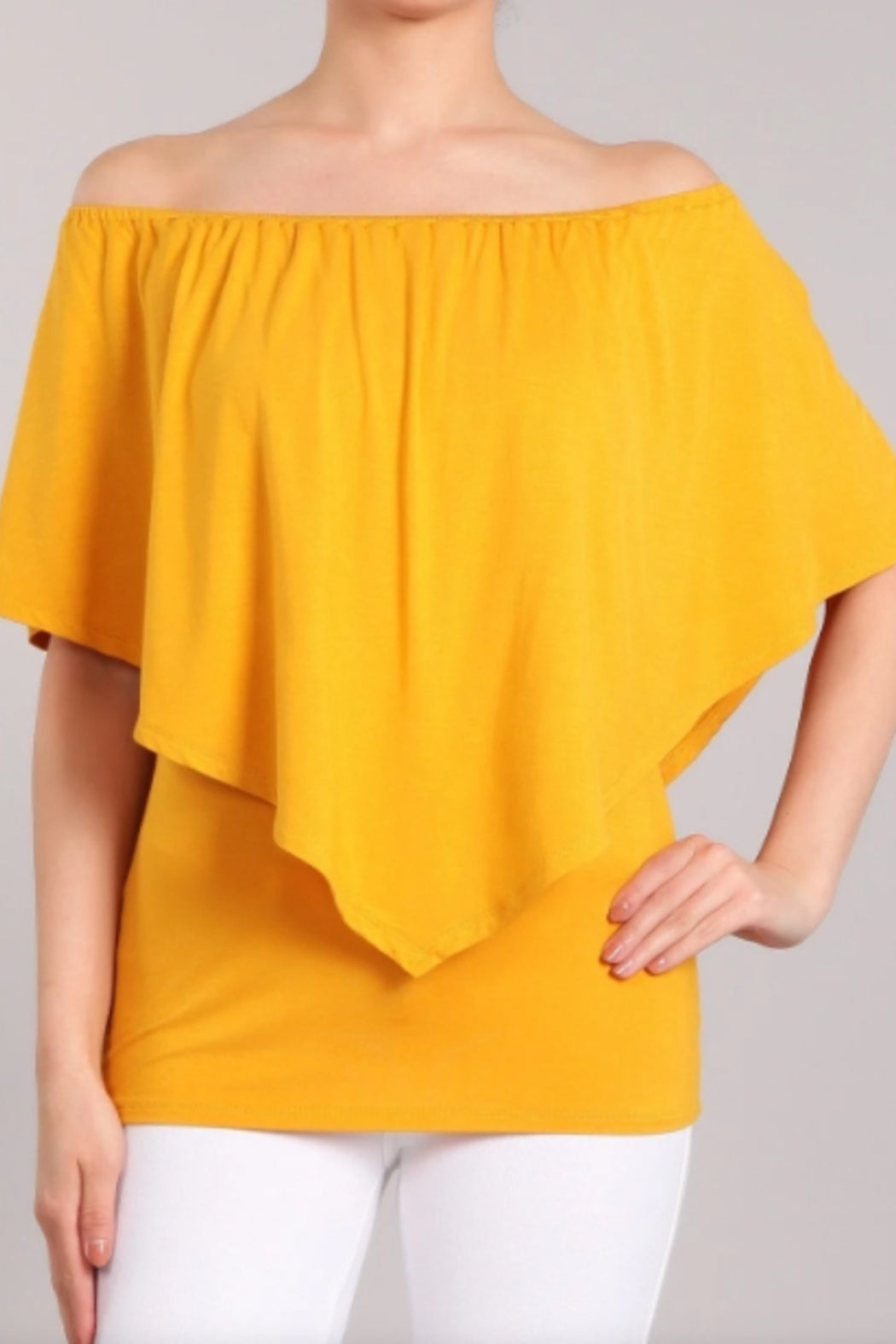 This top is a versatile beauty! Double layered convertible top with elasticized neckline. Front and back feature an overlay that comes down to a V at the hemline. Wear it on or off the shoulder or one shoulder. We love this top...more colors on the way!