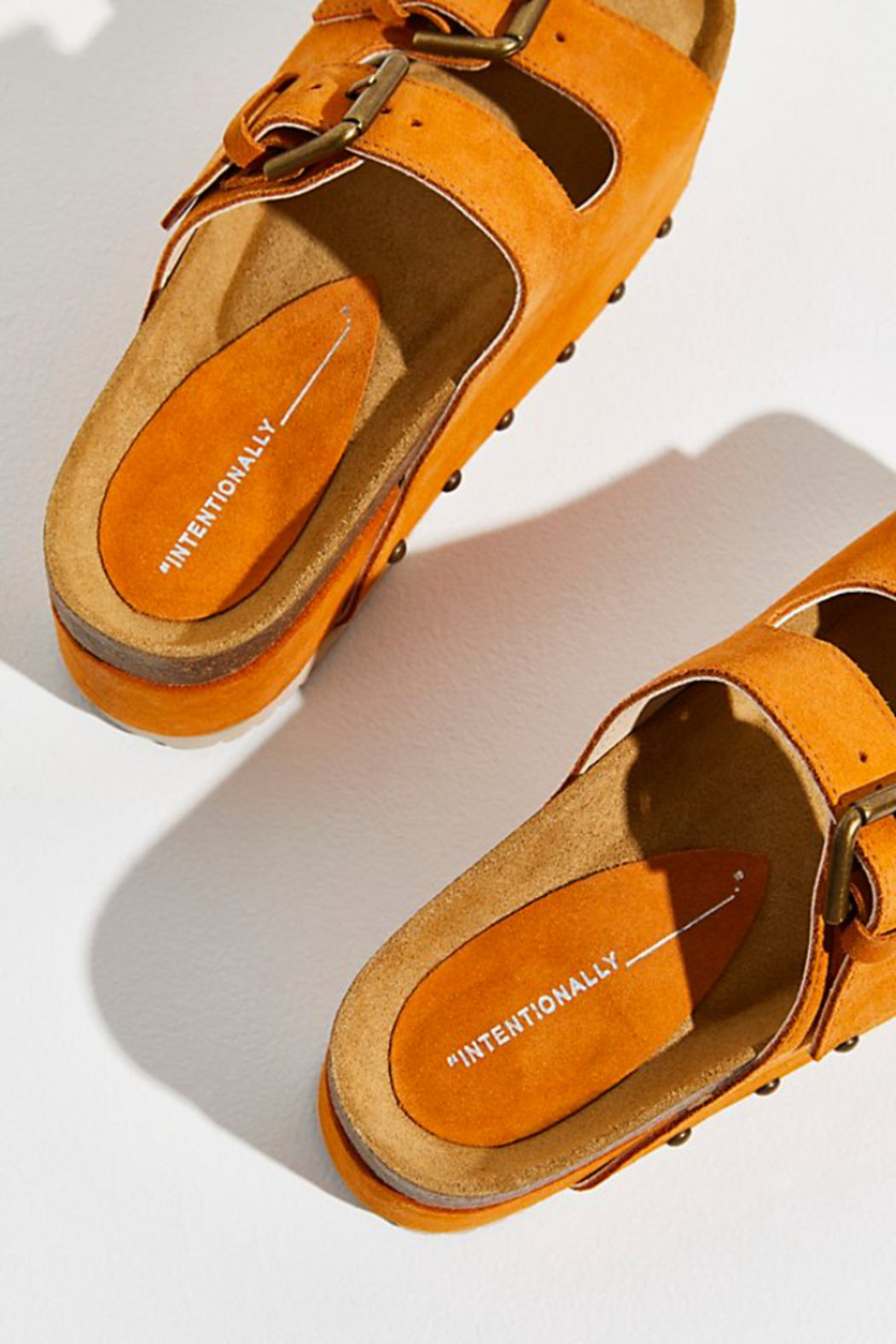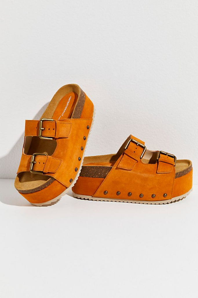 Turn heads in these so bold and statement-making sandals featured in a slip-on style and two-strap design with a chunky flatform sole, studded embellishments, and buckle detailing.