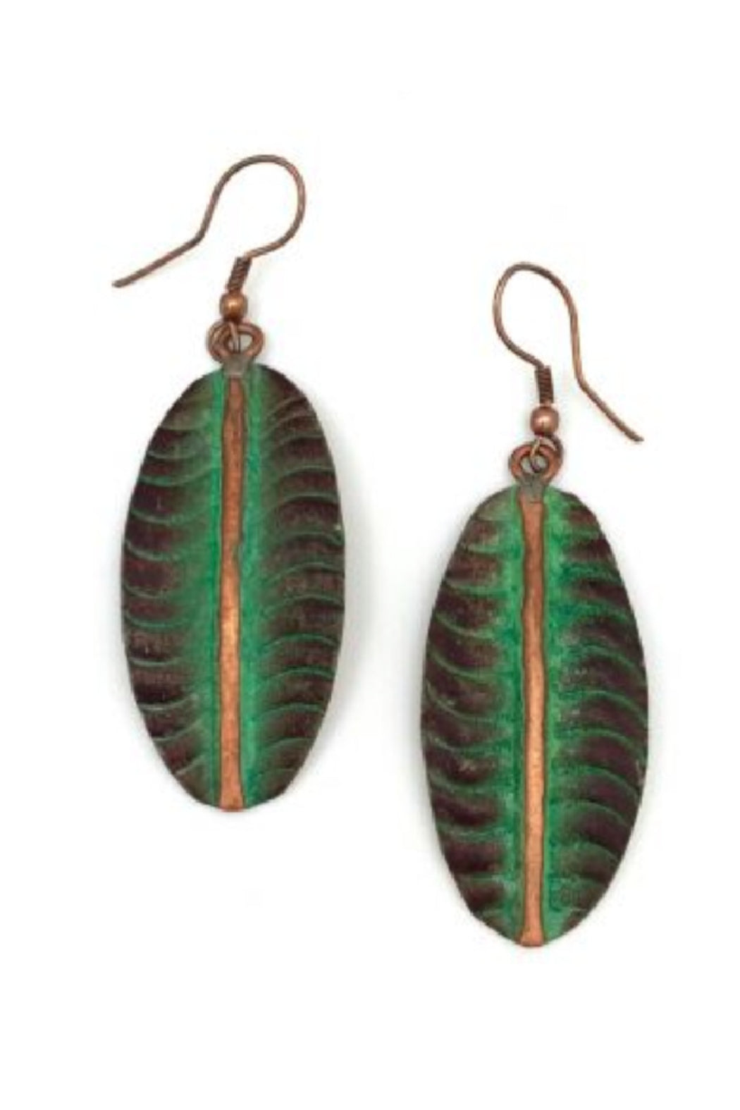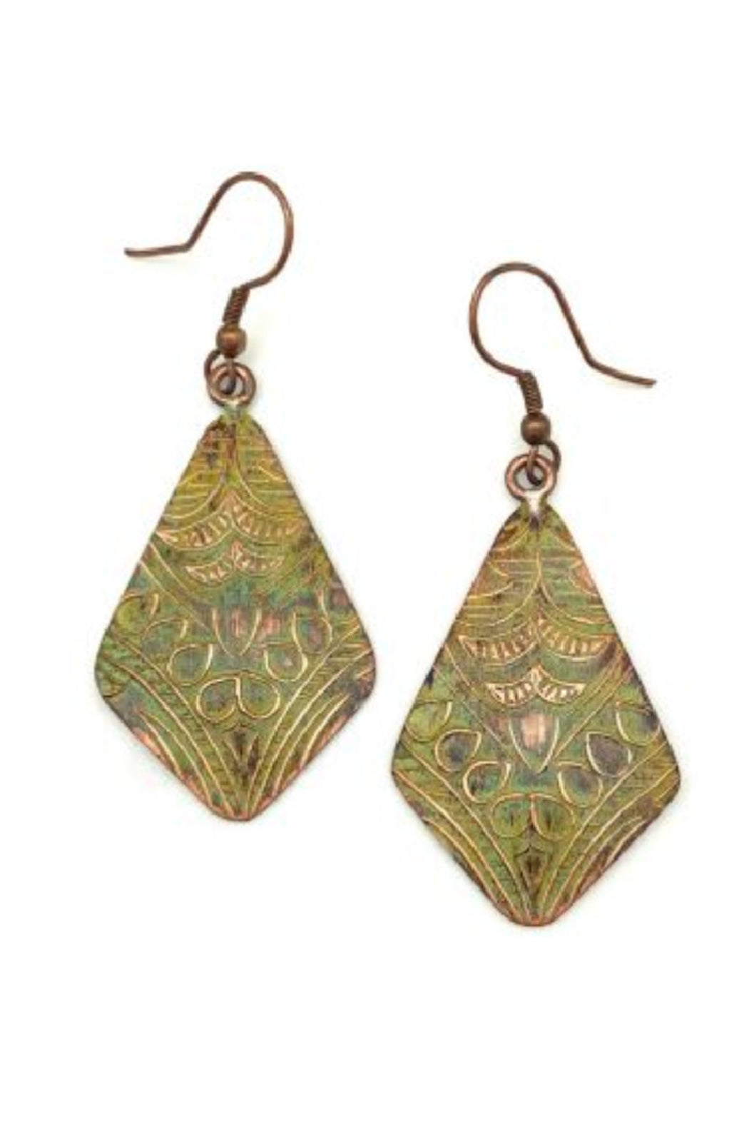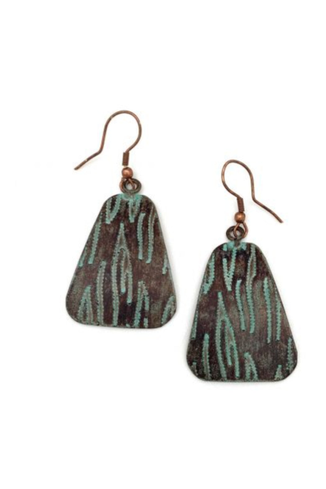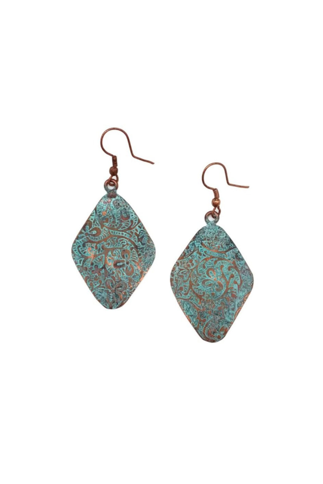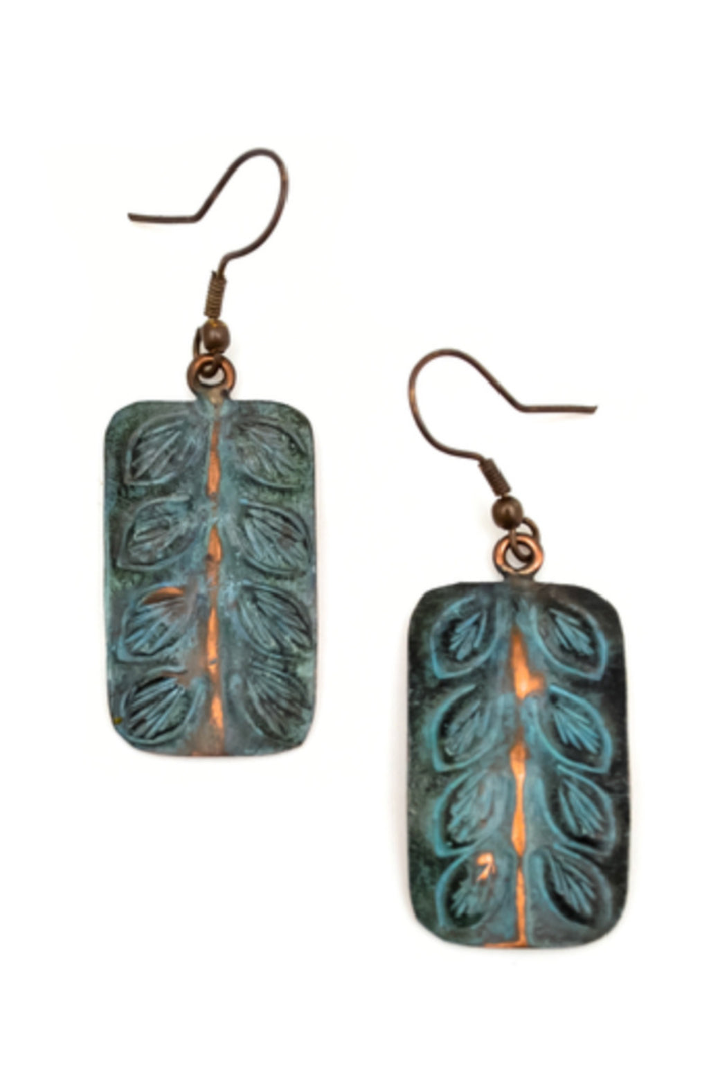 Beautiful copper earrings with patina finishes. 2.25" - 2.75" Length, .75" - 1" Width Cadmium and Lead Free.