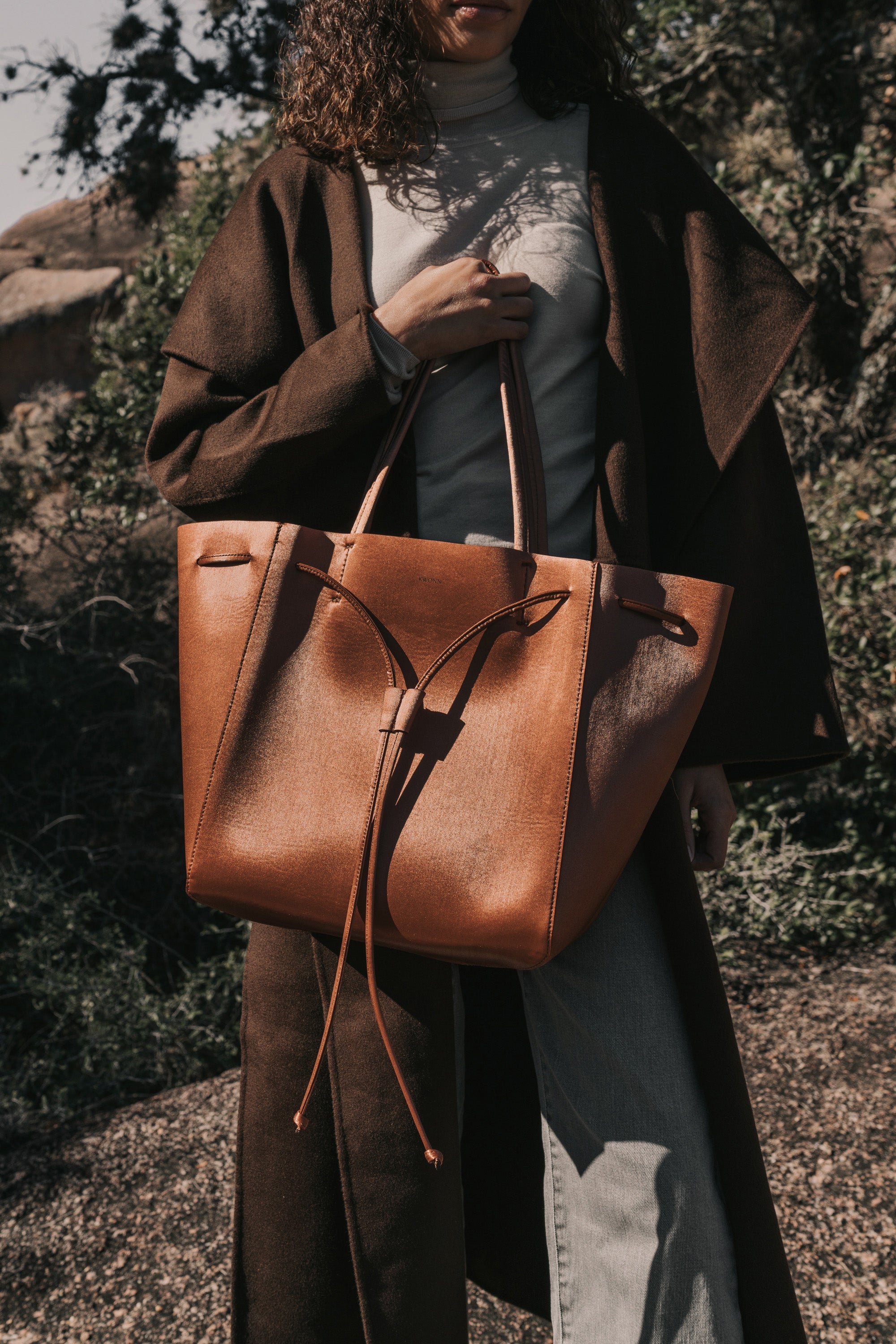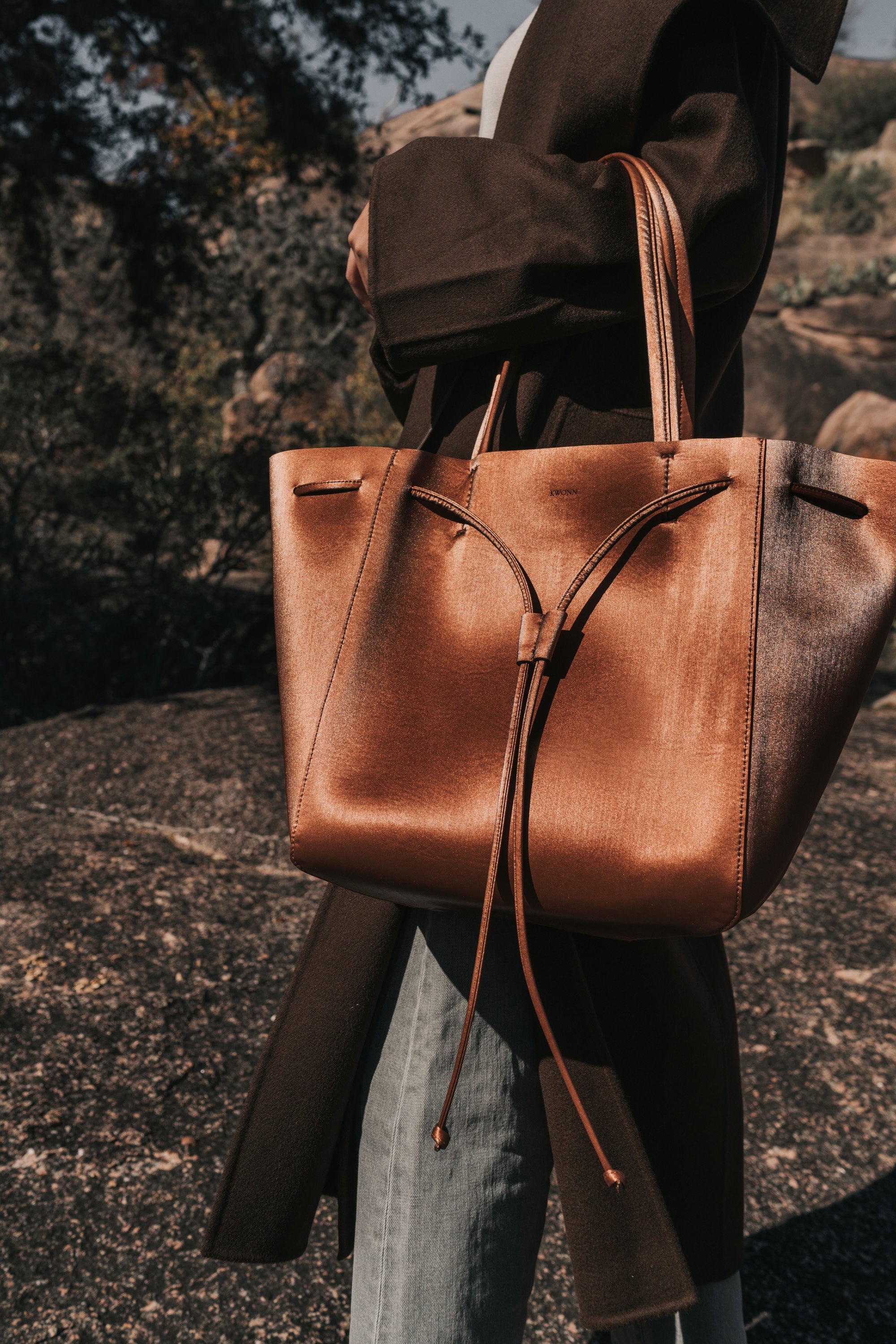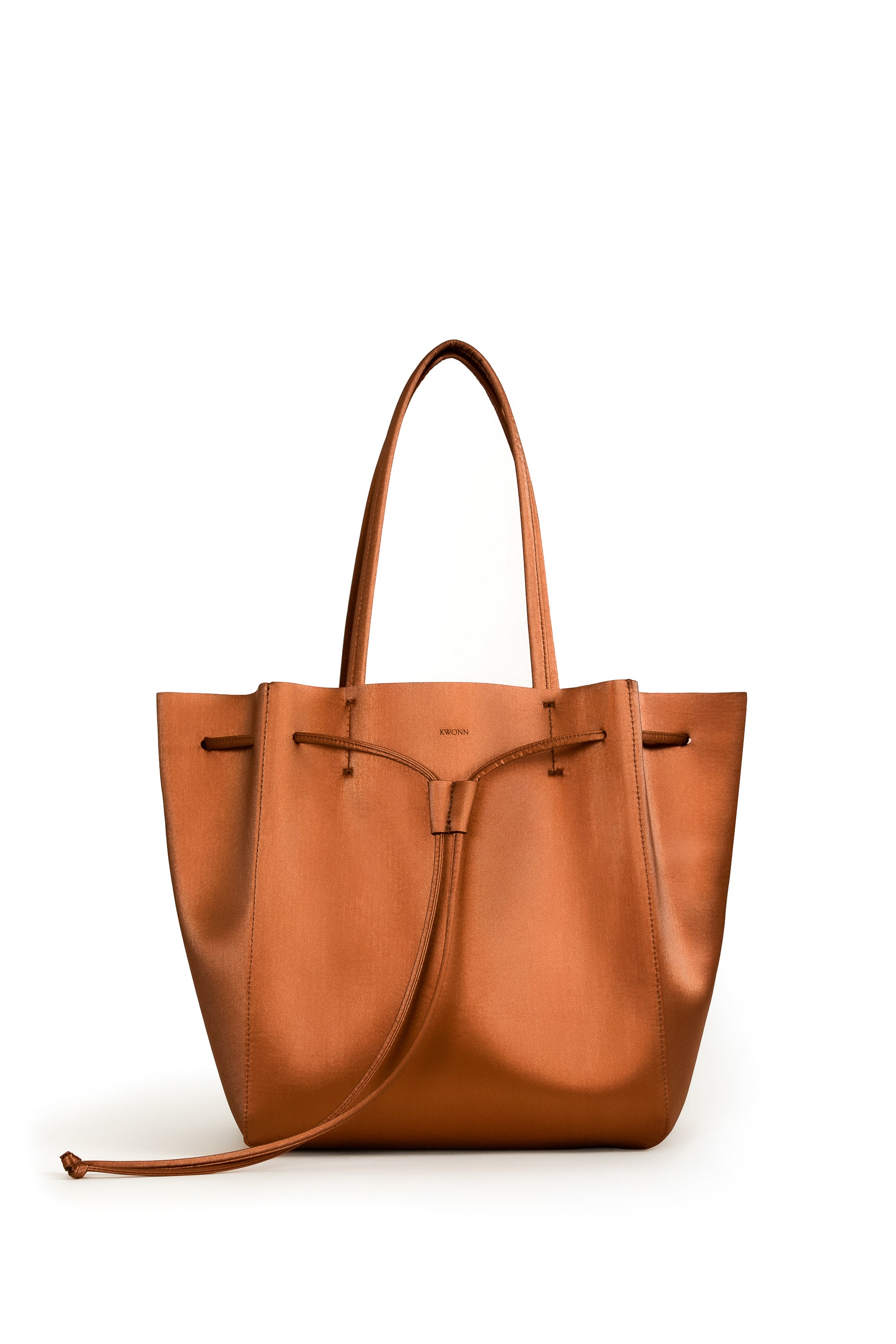 KWONN Shopper is made with vegan and sustainable performance fabric that's durable and easy to clean. The Shopper can be worn as a large shoulder bag or as a smaller size bucket bag by pulling the drawstring at the center of the bag. The exterior of the bag has a subtle shine coating, and the inner material features a softer texture with an uncanny suede feel.