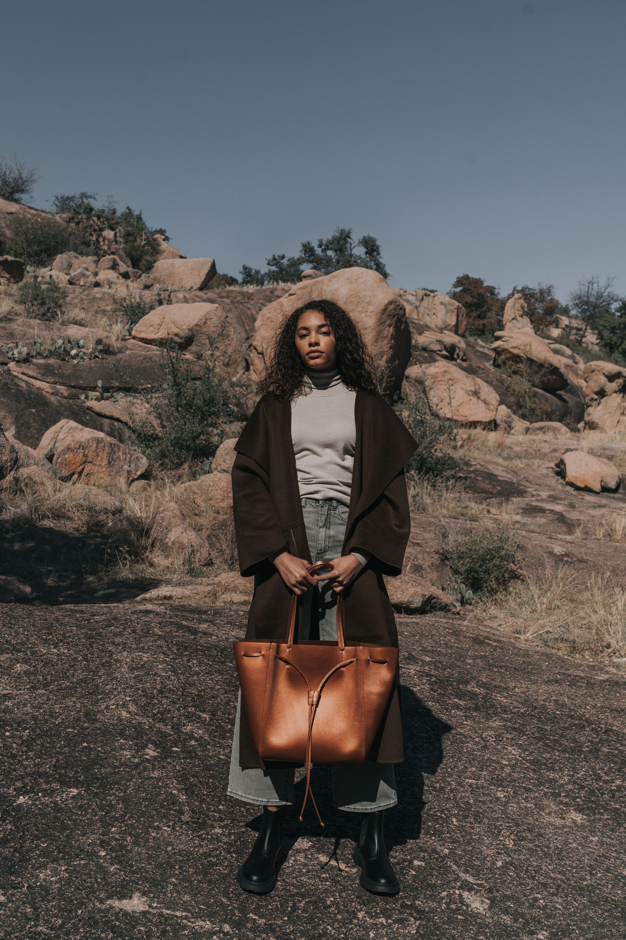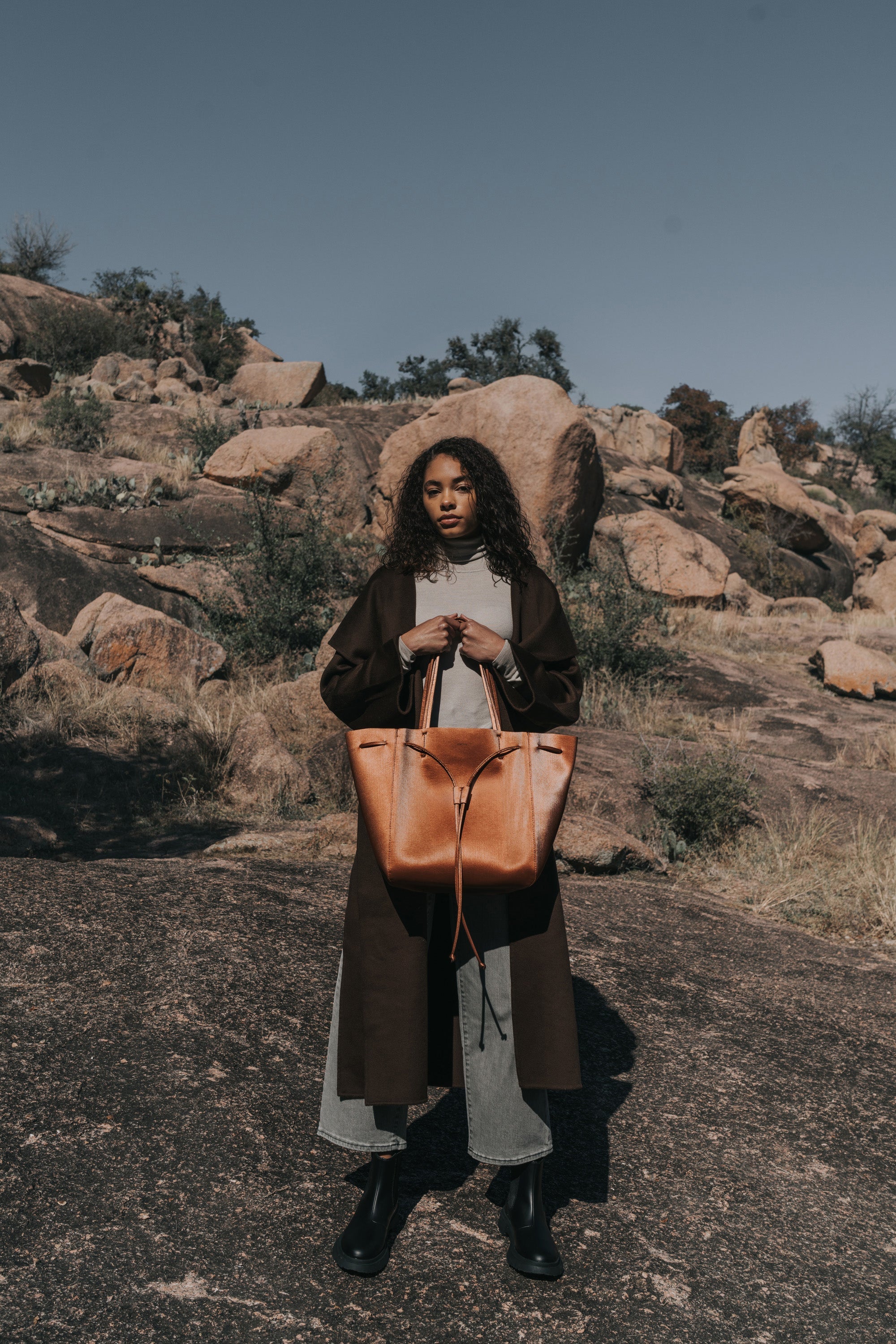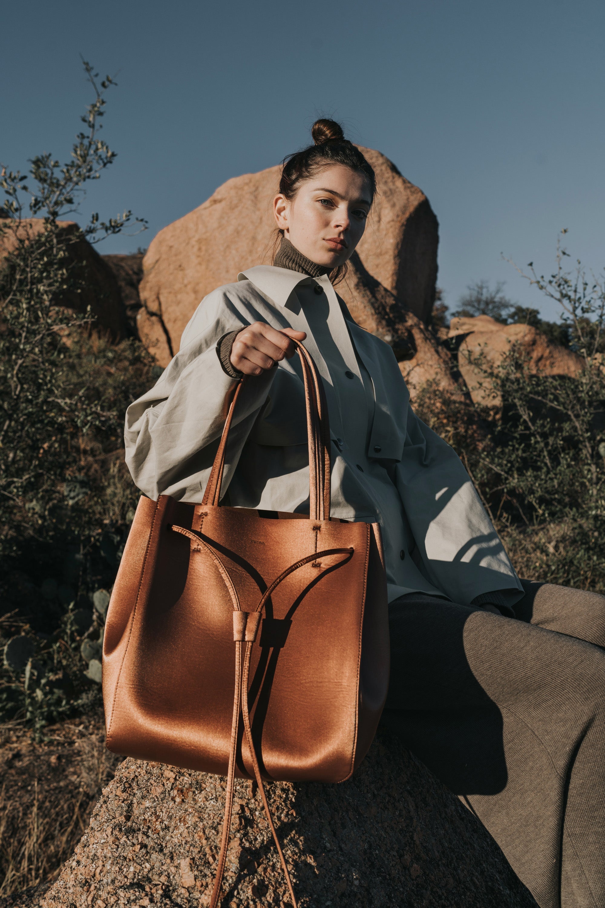 KWONN Shopper is made with vegan and sustainable performance fabric that's durable and easy to clean. The Shopper can be worn as a large shoulder bag or as a smaller size bucket bag by pulling the drawstring at the center of the bag. The exterior of the bag has a subtle shine coating, and the inner material features a softer texture with an uncanny suede feel.