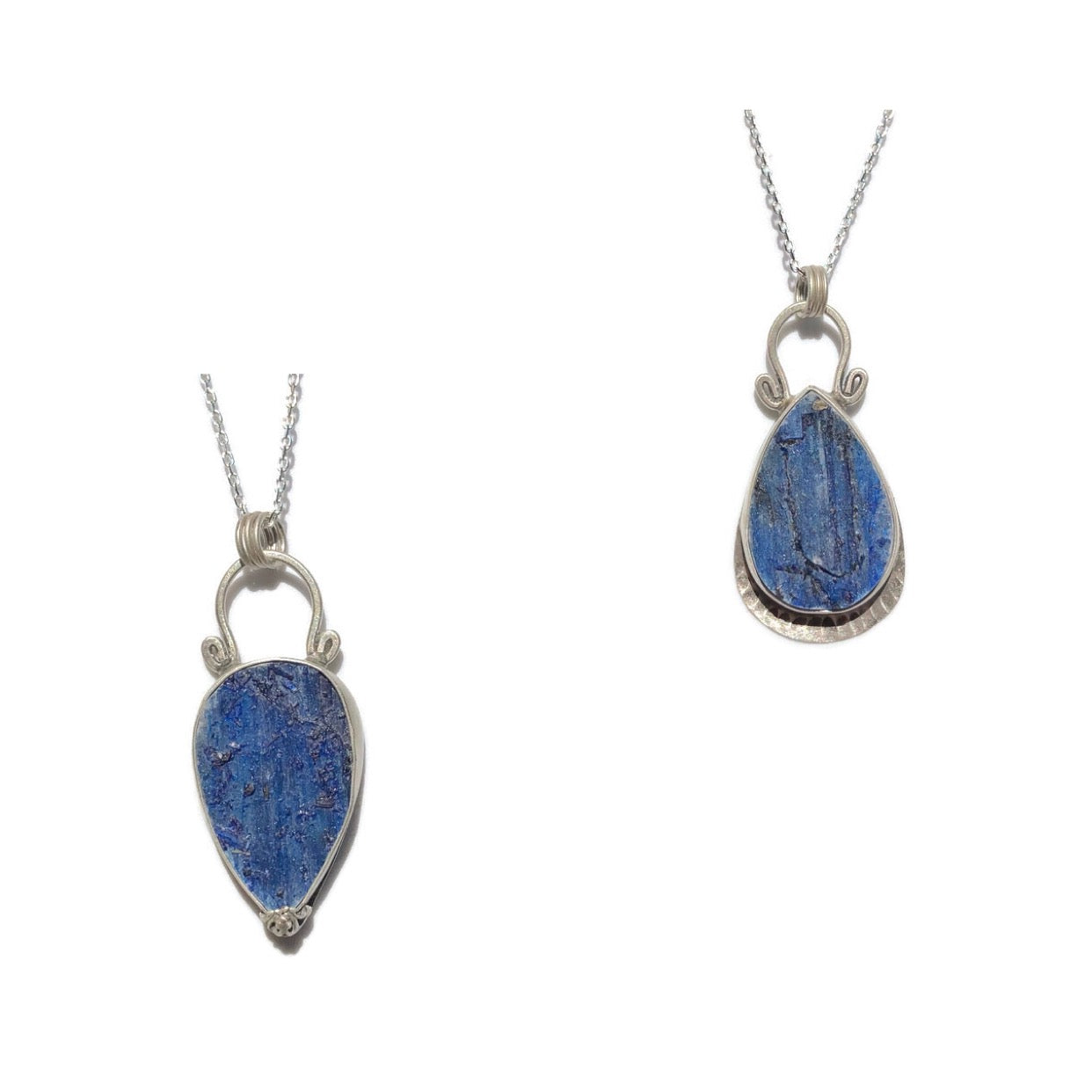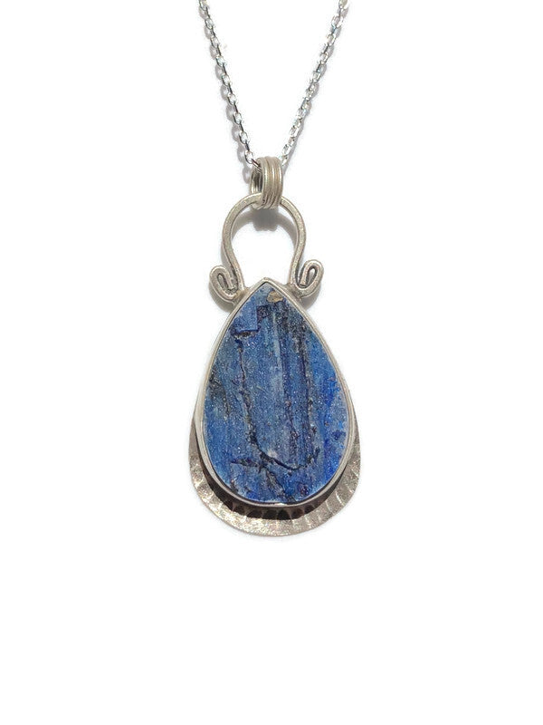 An incredible raw faced blue kyanite teardrop is set with the point up with an ornate bail on top and a textured fin on the bottom. Created by hand in fine and sterling silver and finished on an 18 inch chain.