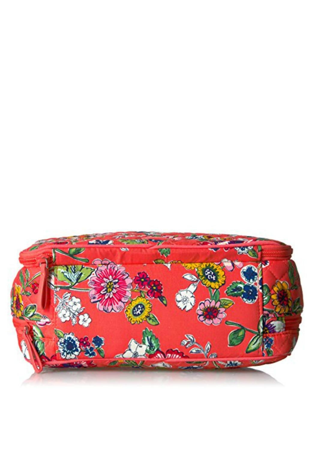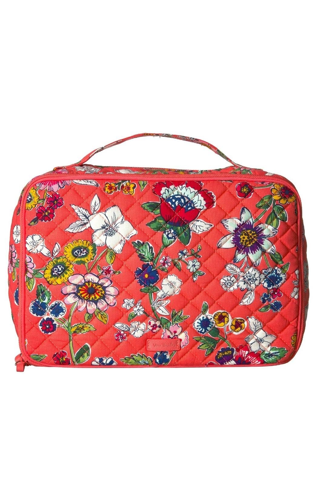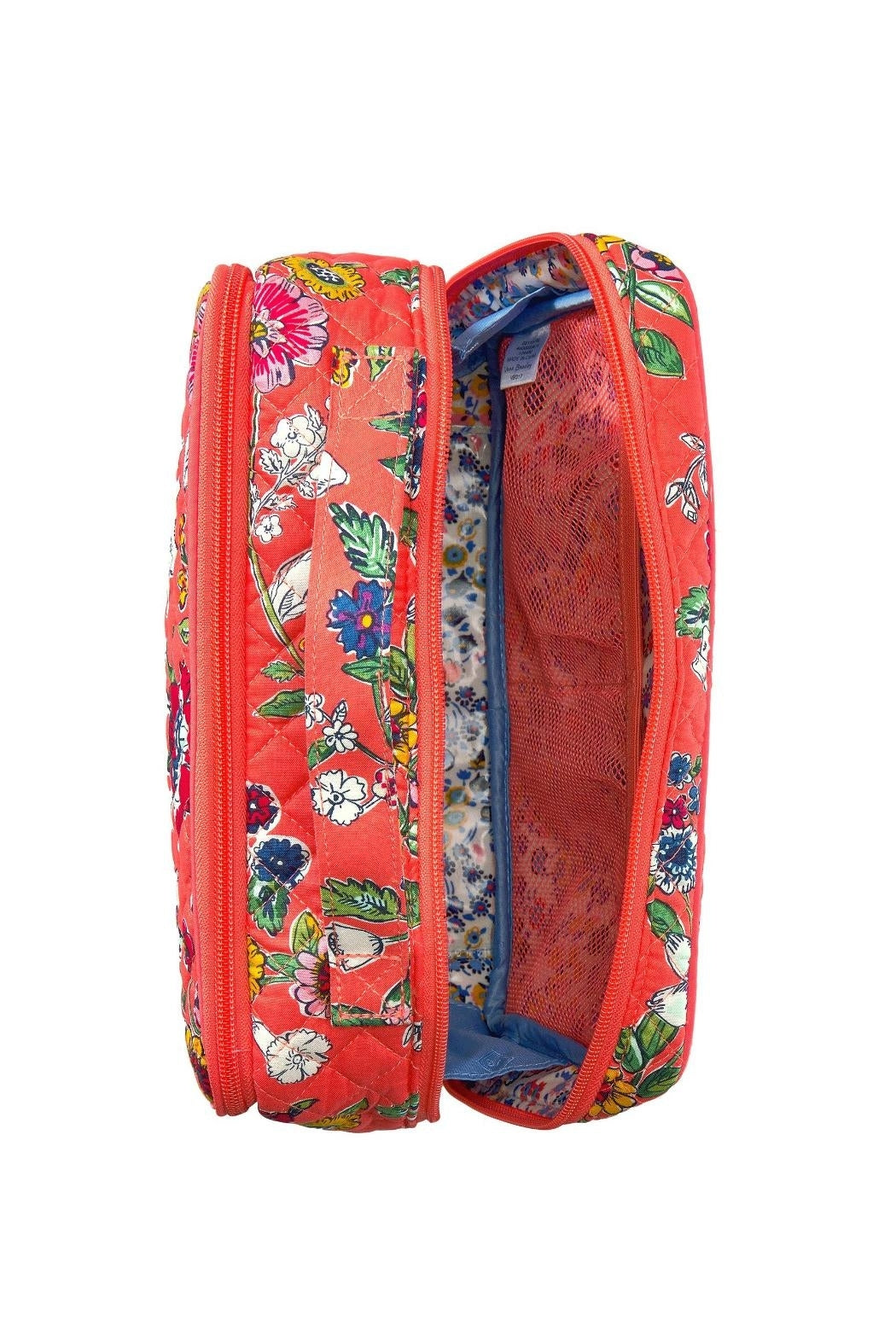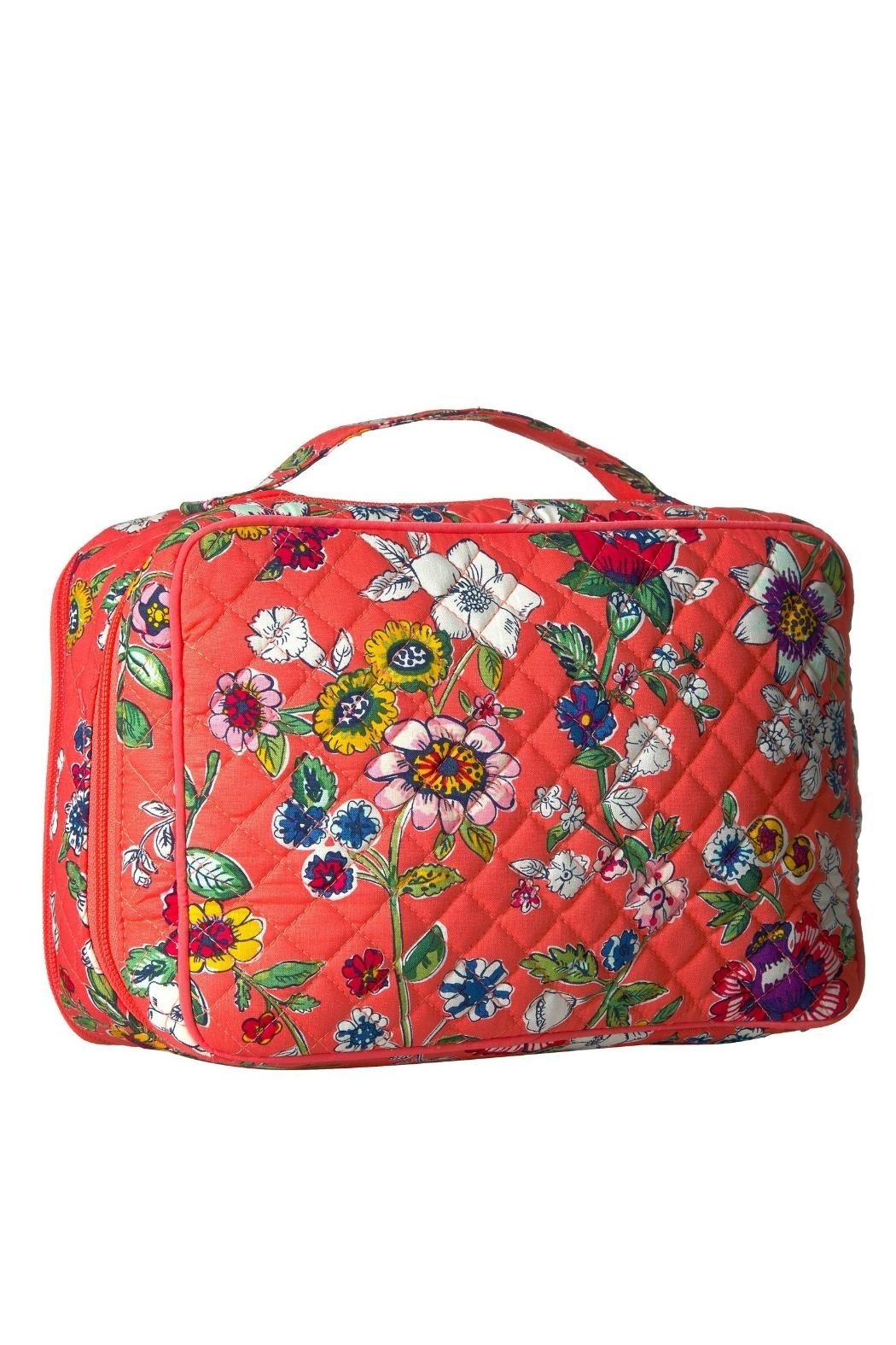 Here is the Vera Bradley Iconic Large Blush & Brush Case in the Coral Floral pattern. Features signature lightweight quilted cotton construction and multiple compartments with slip pockets for your convenience. Main compartment offers four mesh slip pockets on the sides. Front section includes nine brush holder slips and a long, clear zip pocket. Zip closures. Pattern placement will vary. Wipe clean with damp cloth. Click on "Mimi's Gift Gallery" on this page to find more bags and accessories in the Coral Floral pattern. Dimensions: 4¼" Wide x 7" High x 10½" Long, Handle has 1½" drop.