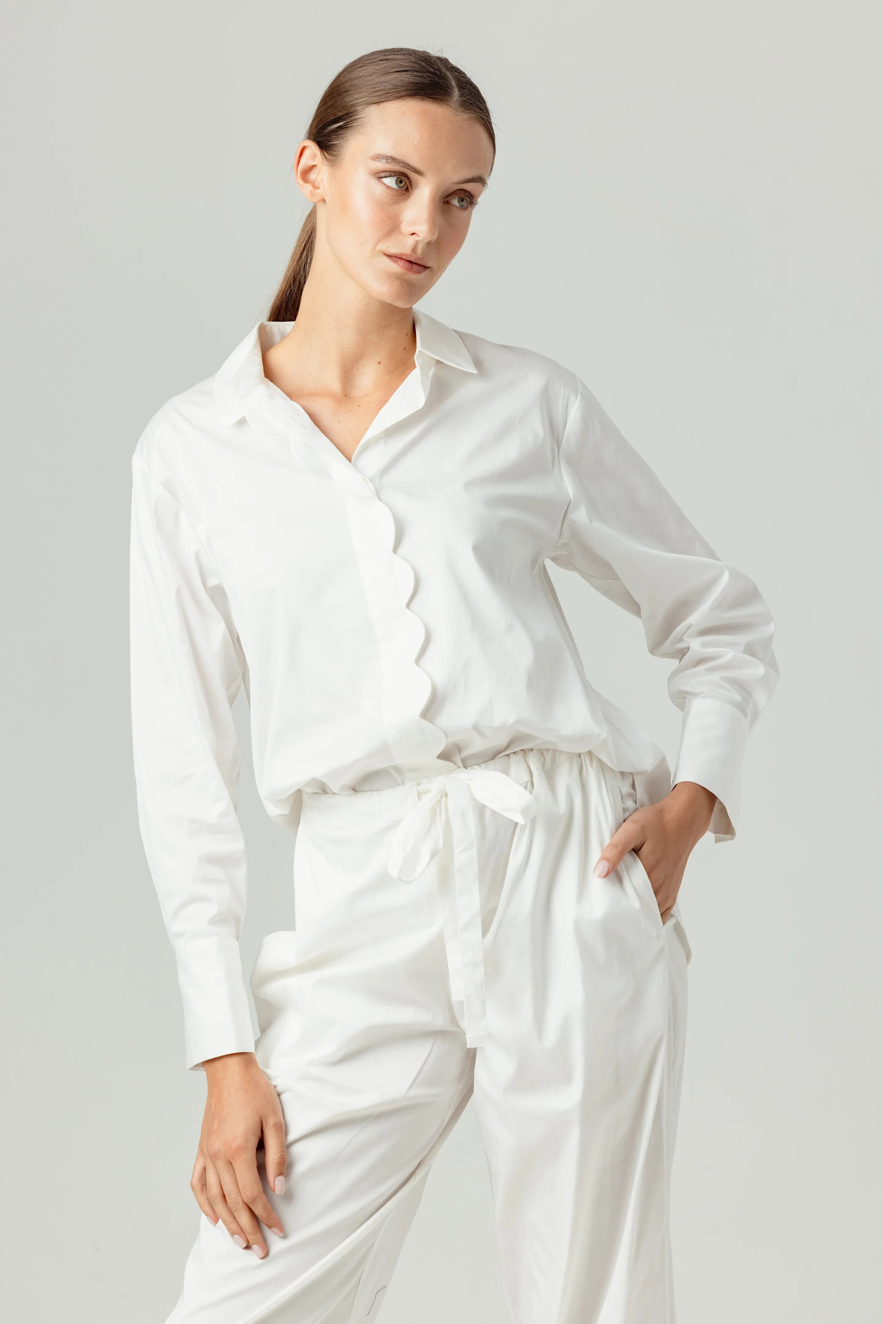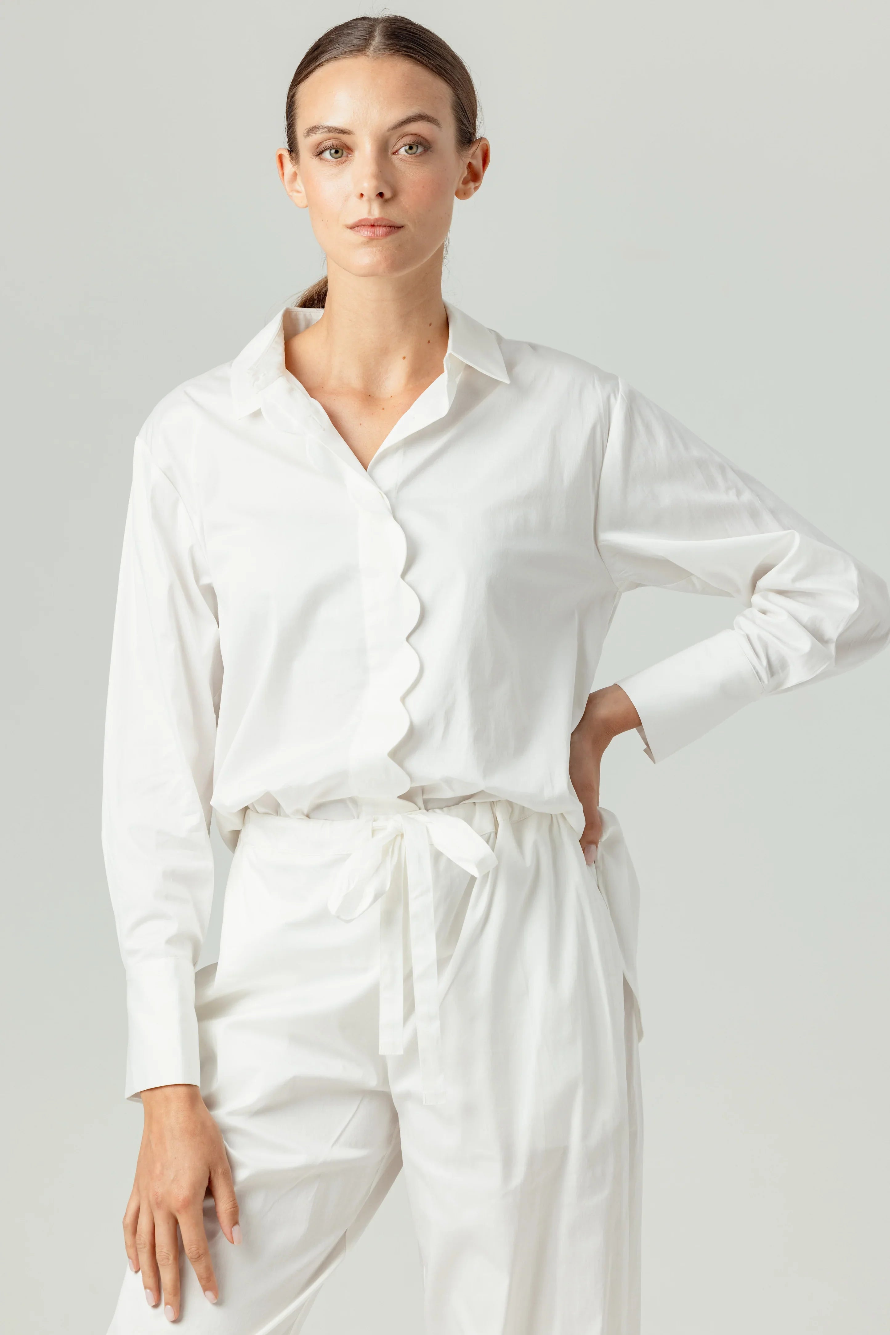 Introducing Cotton Sateen Poplin, an elevated poplin with a subtle sheen. Coral is a traditional button-front shirt, elevated with a feminine scalloped edge, including on the back yoke.