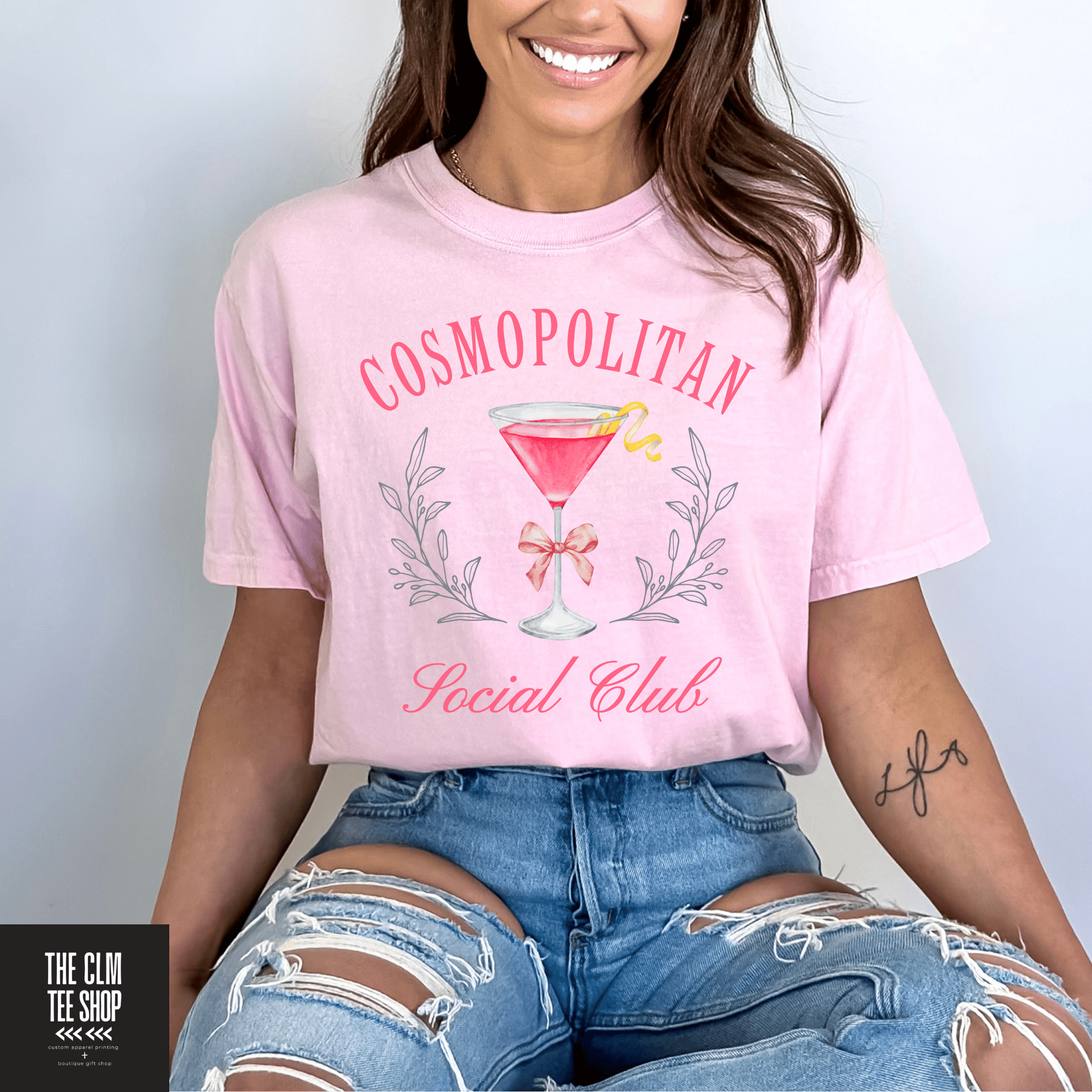Get ready to turn heads with the Cosmopolitan Social Club Graphic Tee! This playful pink tee features a cosmopolitan image and a relaxed fit for ultimate comfort. The stretchy, lightweight fabric is soft to the touch, making it perfect for all-day wear. Don't miss out on this must-have addition to your wardrobe! 🌟👕