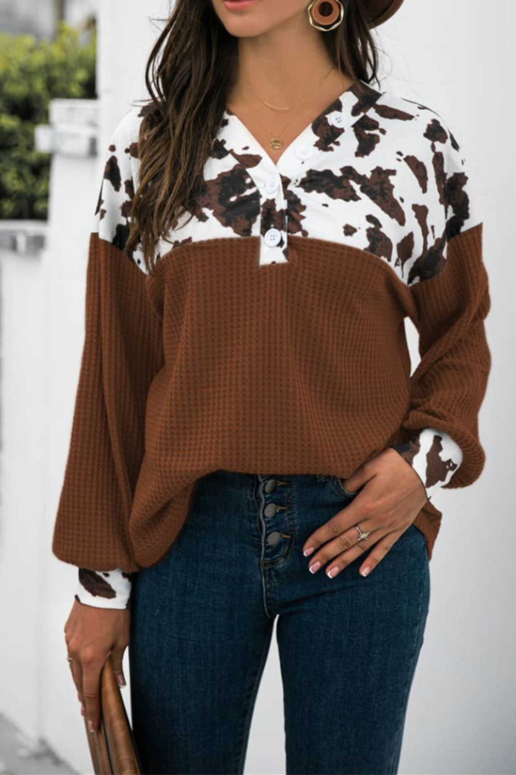 Cow Print Splicing Buttons V-neck Long Sleeve Top