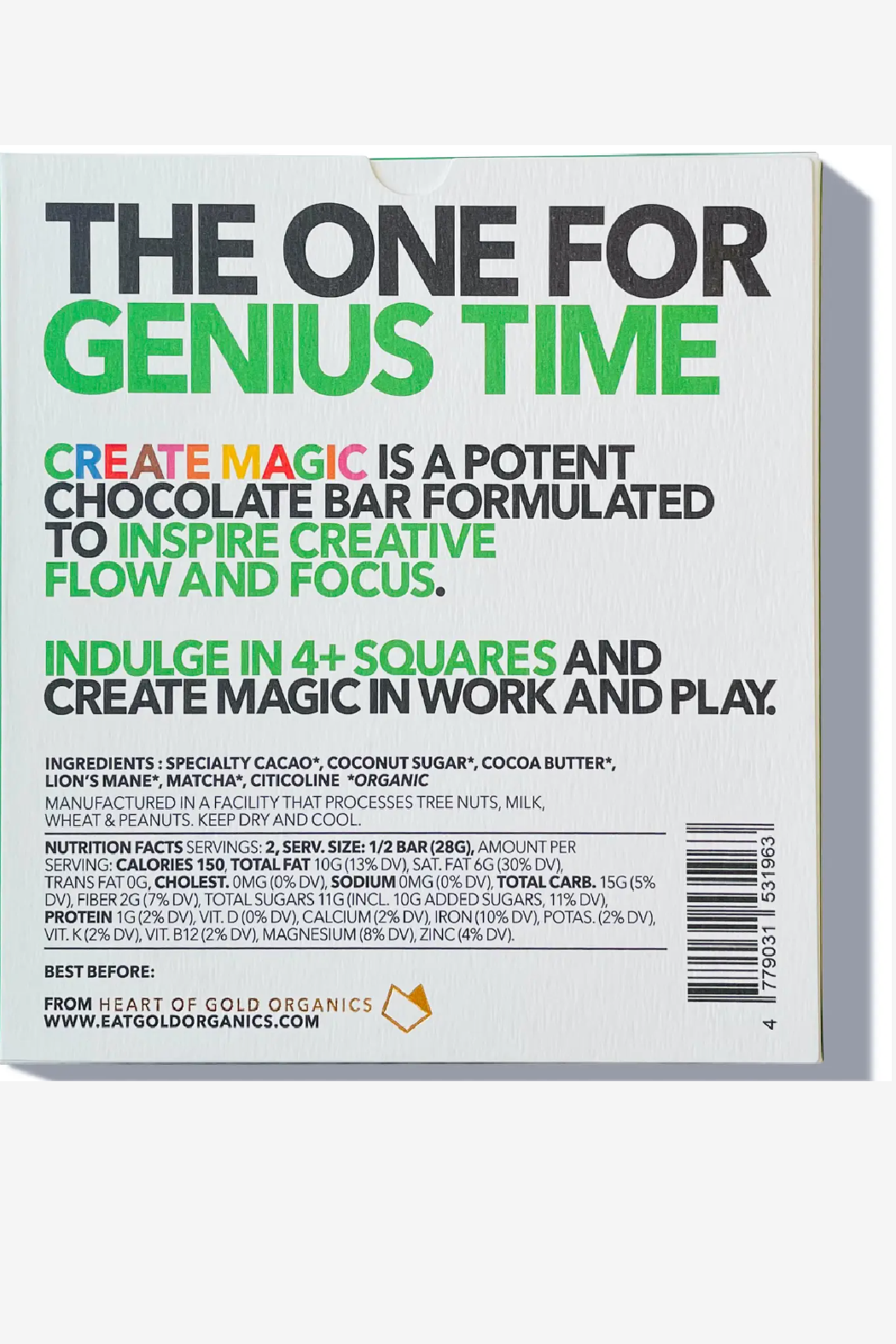 THE ONE FOR GENIUS : organic specialty cacao, organic coconut sugar, organic cacao butter, organic matcha, organic lion‘s mane, citicoline