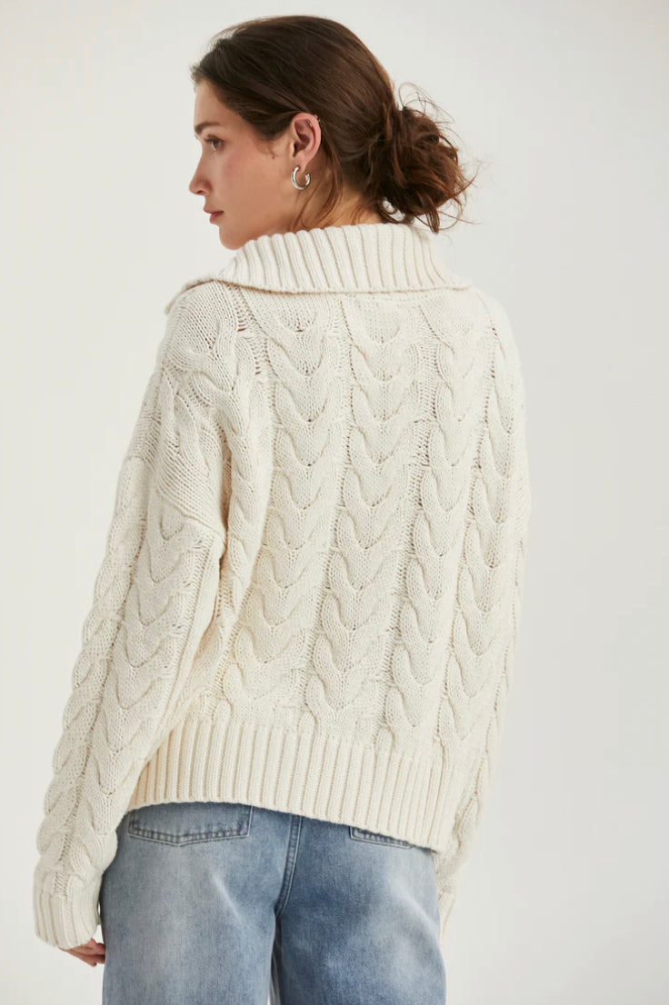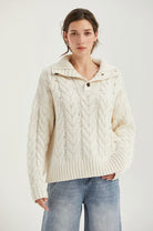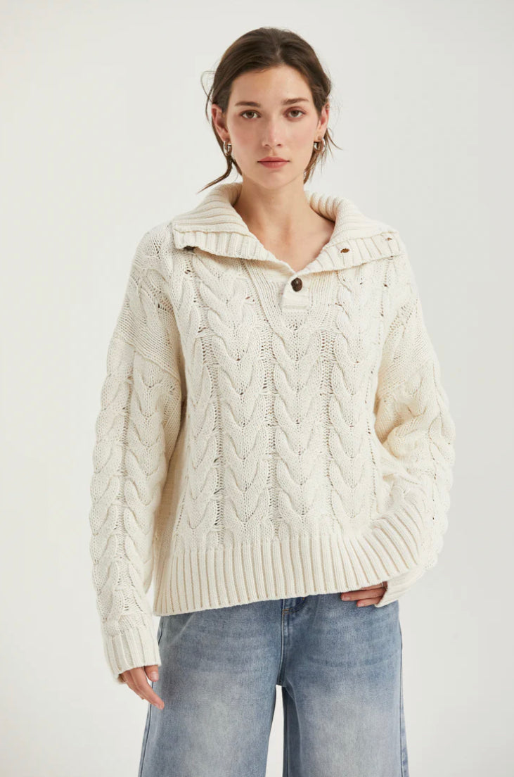 Made with 100% cotton, this chunky knit shawl sweater features exaggerated collar with braided faux leather button closure, long sleeve with drop shoulder, ribbed knit trim, and pretzel knitting pattern all around.