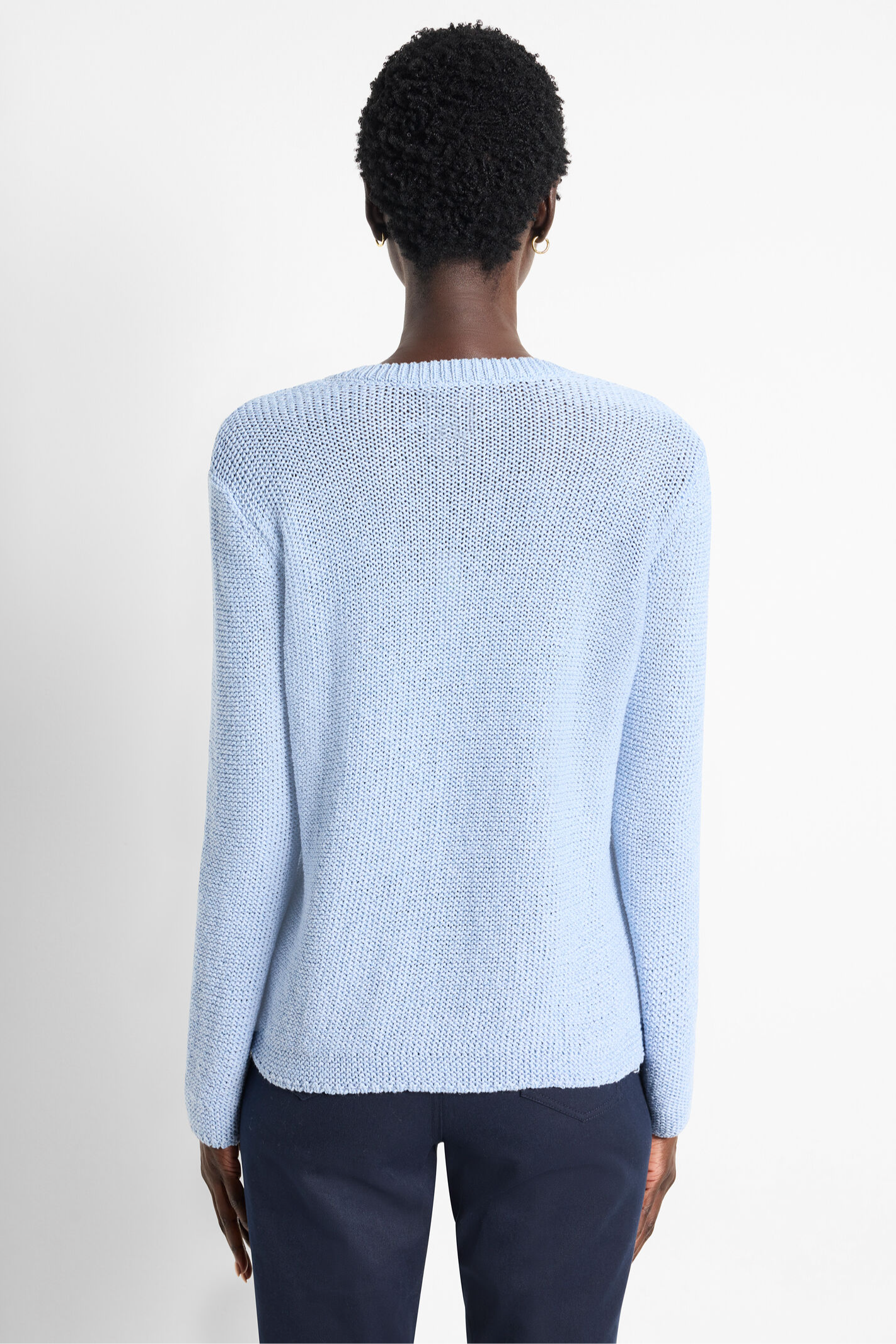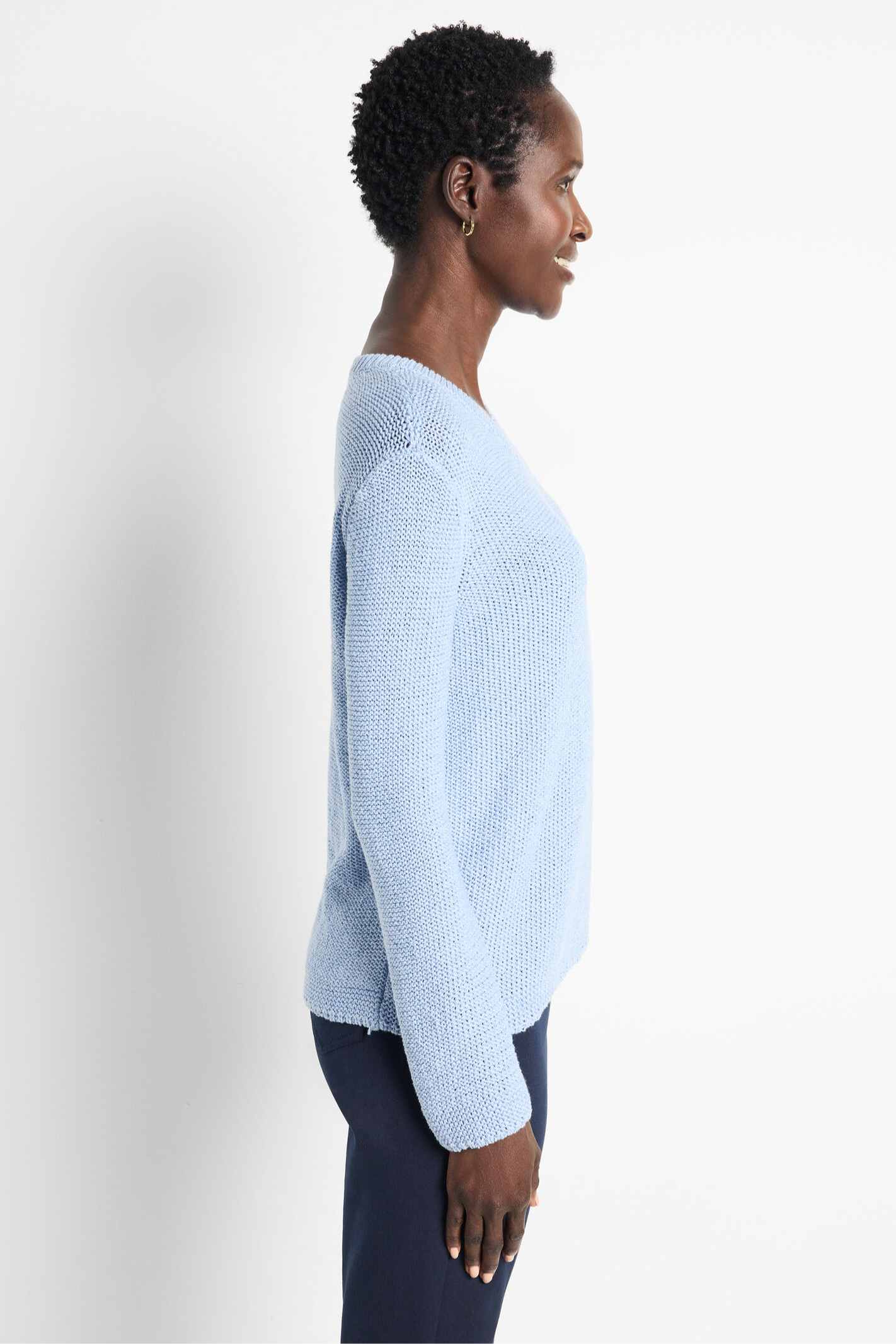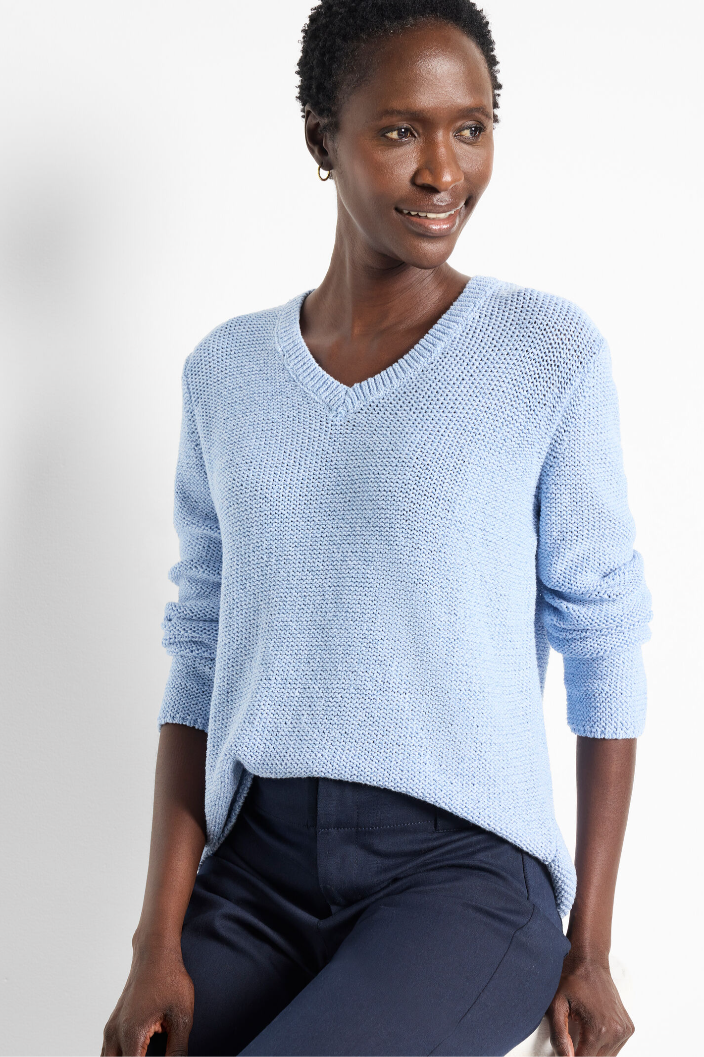 Texture, texture, texture! The knitwear artistry on display (and feel) here blends casual comfort with an easy style and a look inspired by vintage crochet styles. Crafted in a soft reverse jersey knit with 1x1 rib trim at the neckline, this midweight pullover features a flattering V-neck and easy, on-trend fit. With long sleeves and a hip-length silhouette, it's the perfect everyday staple for a polished yet relaxed look. Perfect for denim!