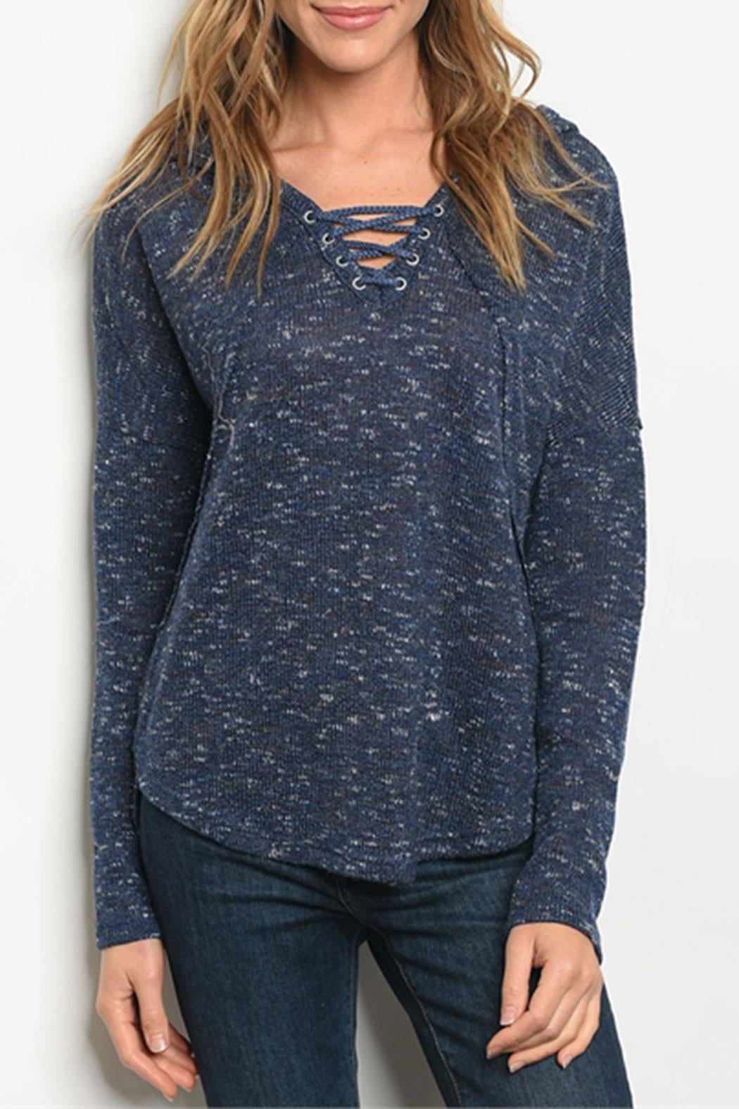 Long sleeve lace up detail pull over knit sweater. Description: L: 23" B: 44" W: 44"