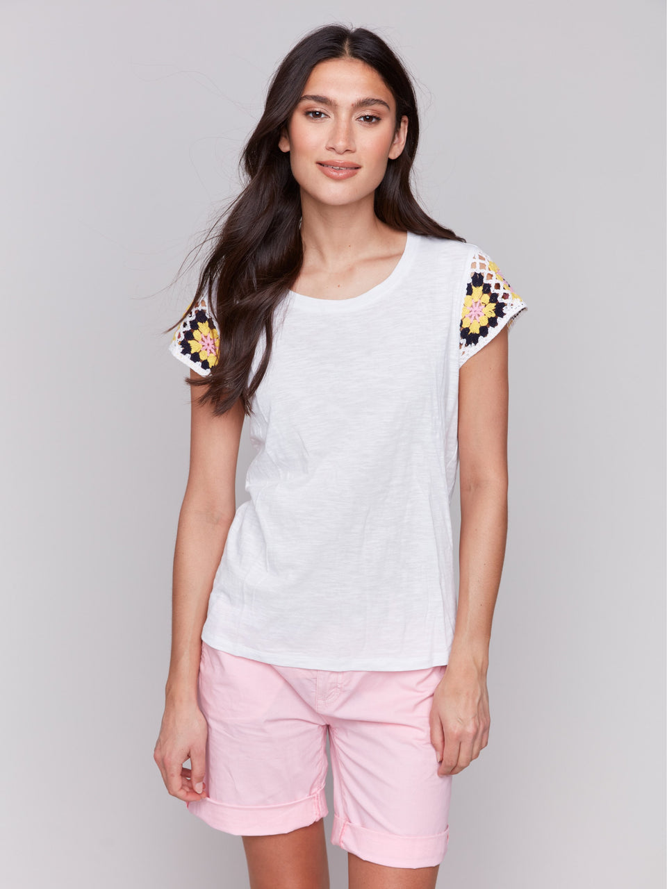 Turn heads with this stunning white cotton t-shirt. The intricate crochet cap sleeves add an artistic flair, making it a perfect piece for every spring and summer wardrobe. Let this t-shirt accompany you from brunch to a casual outing with friends.