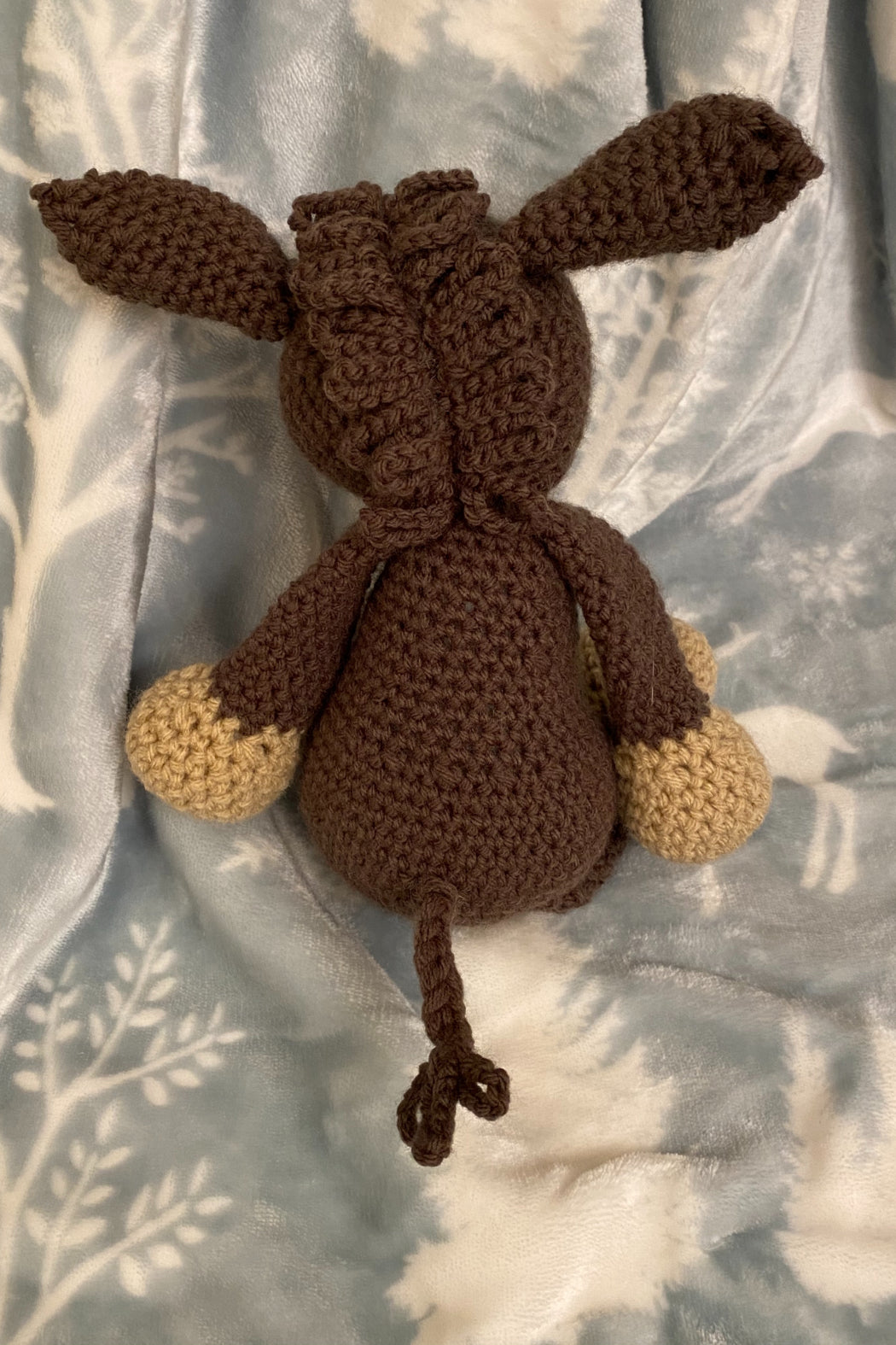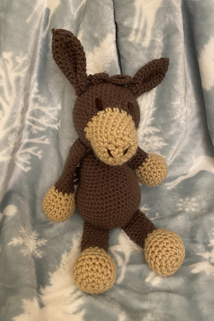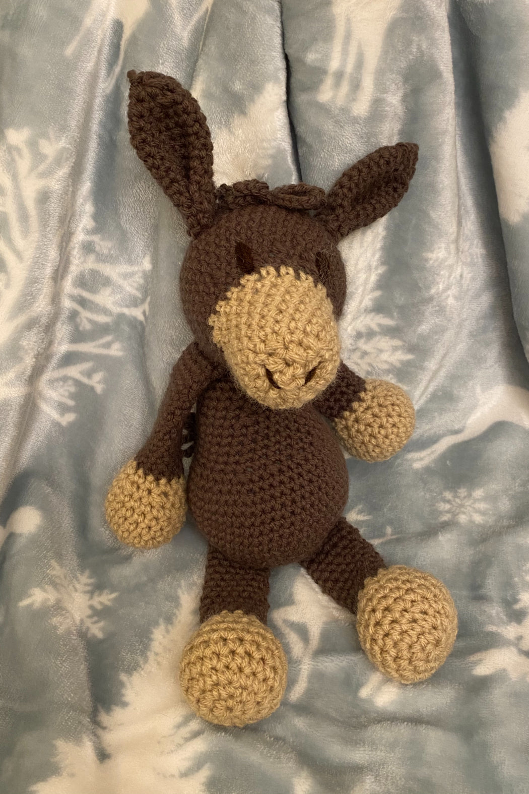 Handmade crochet donkey stuffed animal. 15-18 inches long.