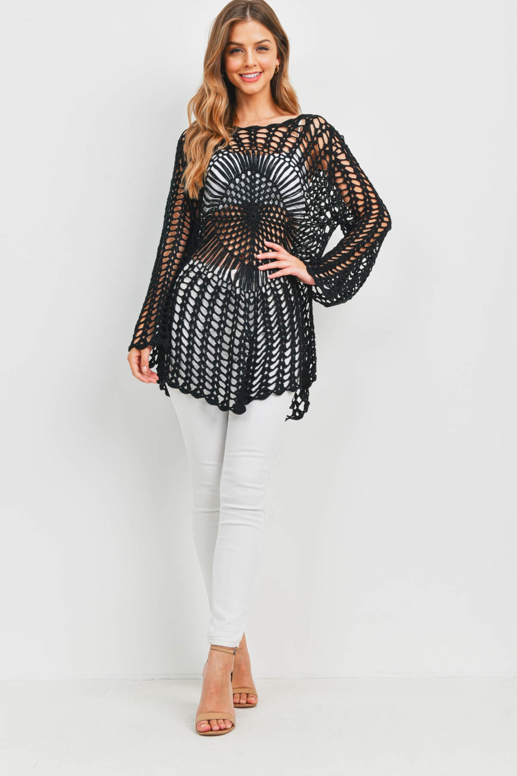 A fun transitional piece you must have in your wardrobe! This long sleeves top features a beautiful knitting crochet style with front and back detail, crew neckline, long bell sleeves with drop shoulders, curved bottom hemline, unlined, material has stretch. Wear it with an underneath bralette, a pair of pants and sandals, or over your swimsuit or bikini as a cover up. Model wears size Small L: 32" B: 38" W: 32"