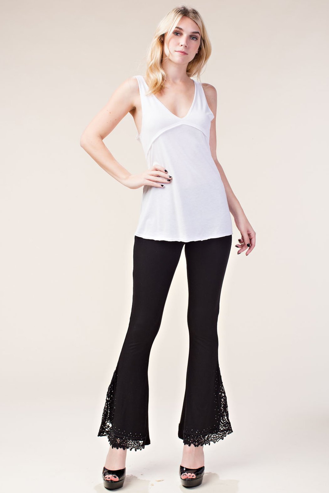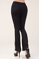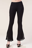FEATURING A FLARED LEG AND INTRICATE LACE DETAILING AT THE HEM, THESE PANTS OFFER A CHIC AND FEMININE LOOK.