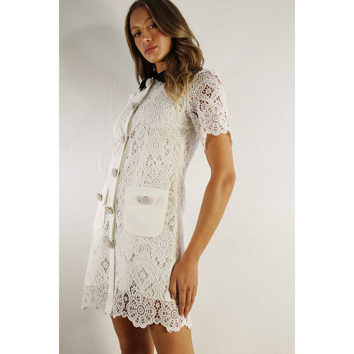 Elevate your style with our Crochet Lace Mini Dress! The intricate crochet detailing and delicate pearl buttons add a touch of elegance to this dress. Includes a lining slip for a flawless, comfortable fit. Perfect for any occasion, this dress is a must-have in your wardrobe!