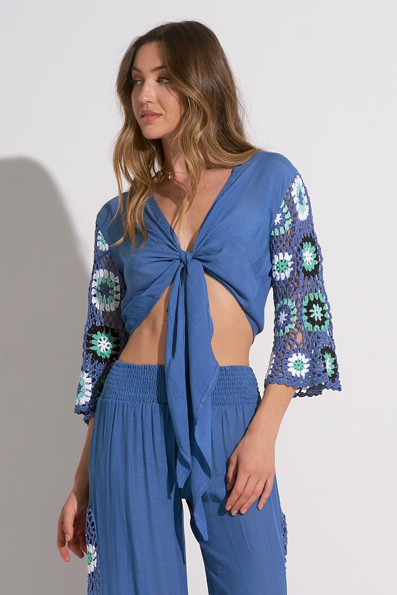 A chic crochet look, the Crochet Panel Pant features an accent of flower panels for a bohemian feel. Airy and effortless for easy cover up over swimwear. Pair with the Tie Front Crochet Top to complete the look.