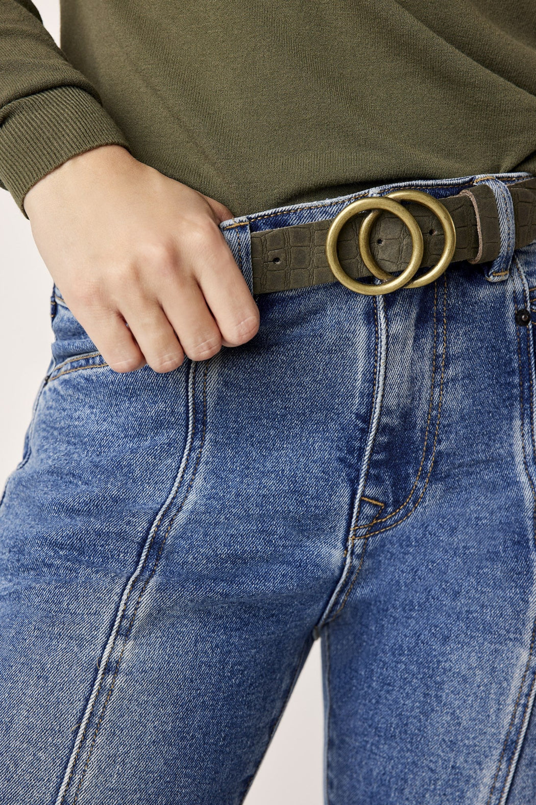 A belt made from 100% leather with a with crocodile relief print and a double ring buckle.