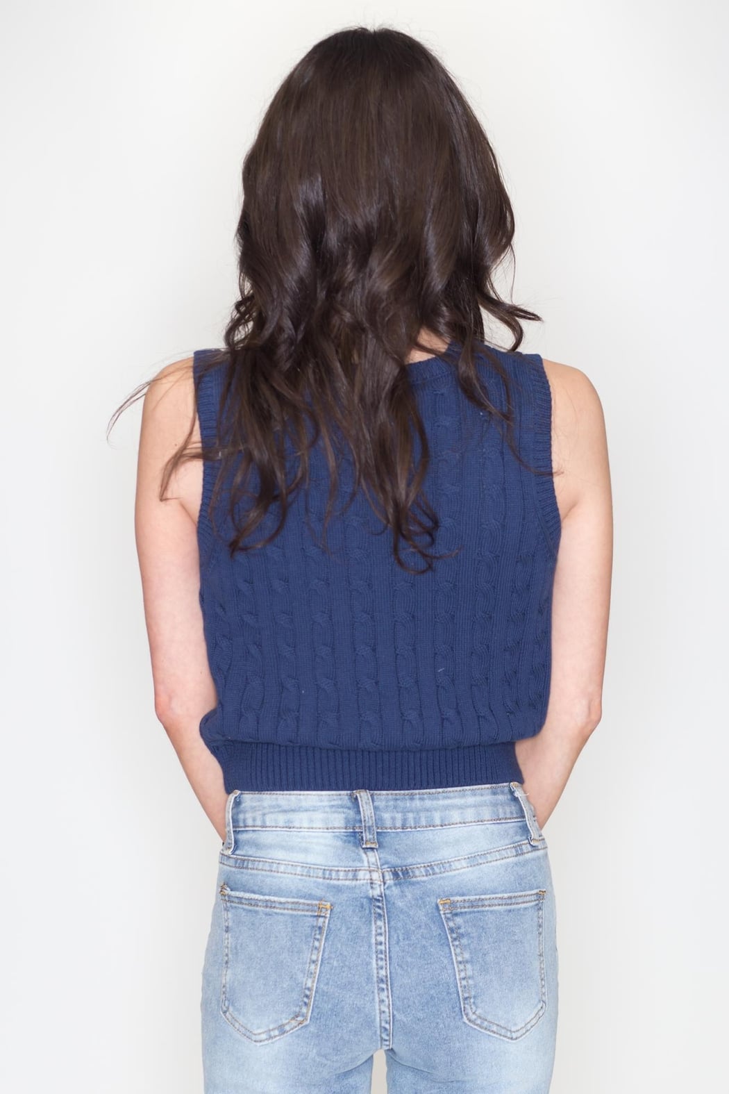 Navy cable knit cropped sweater vest with ribbed knit trim.