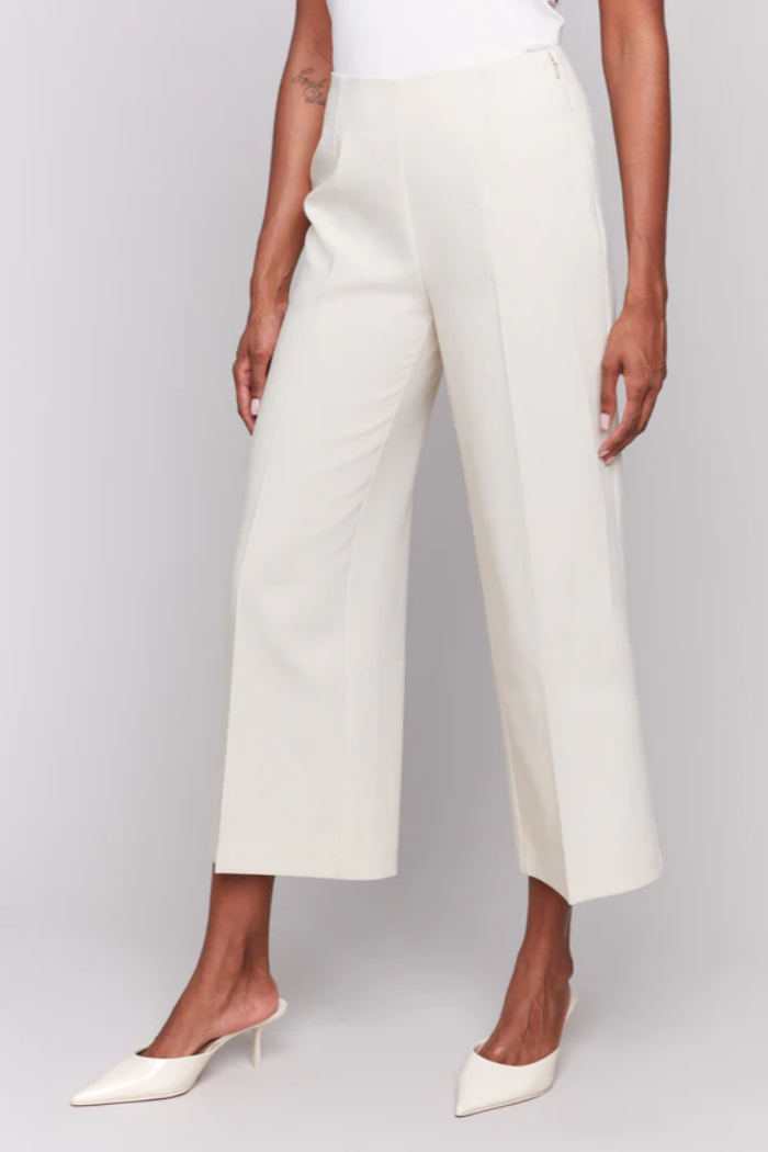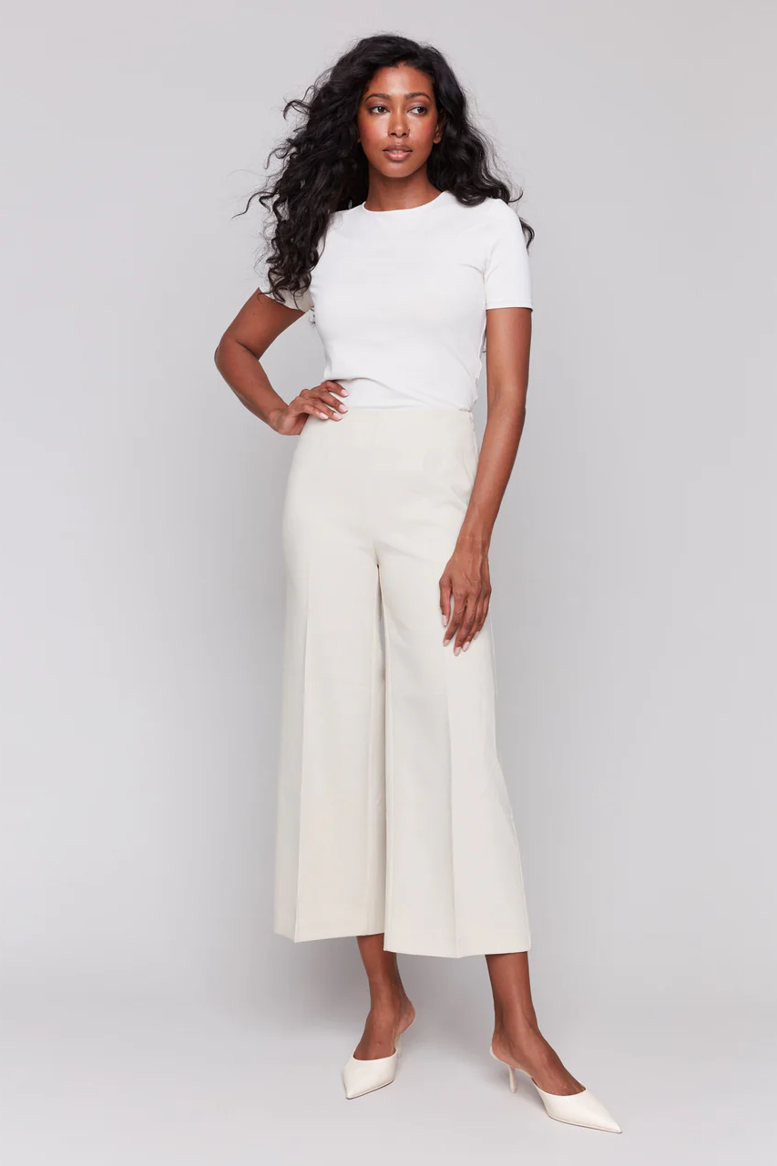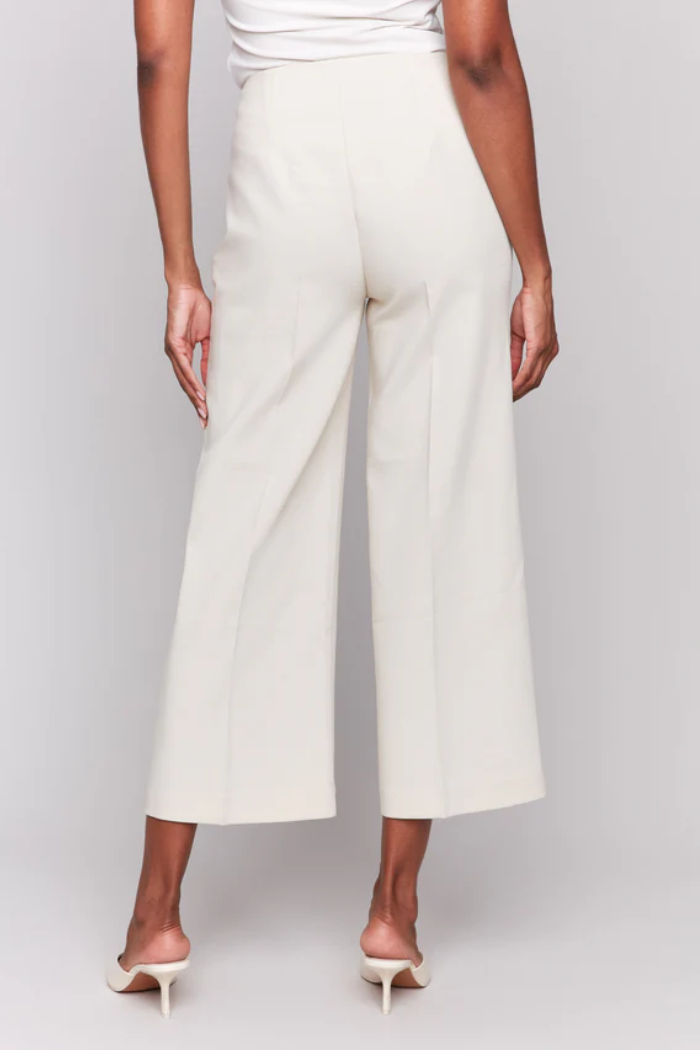 Embrace a sophisticated and relaxed look with these beige cropped wide leg pants. Fashioned in a timeless design, they feature a flattering waist and a versatile cropped length. The fabric's slight stretch allows for ease of movement, making these pants a delightful spring companion for casual and formal outfits.